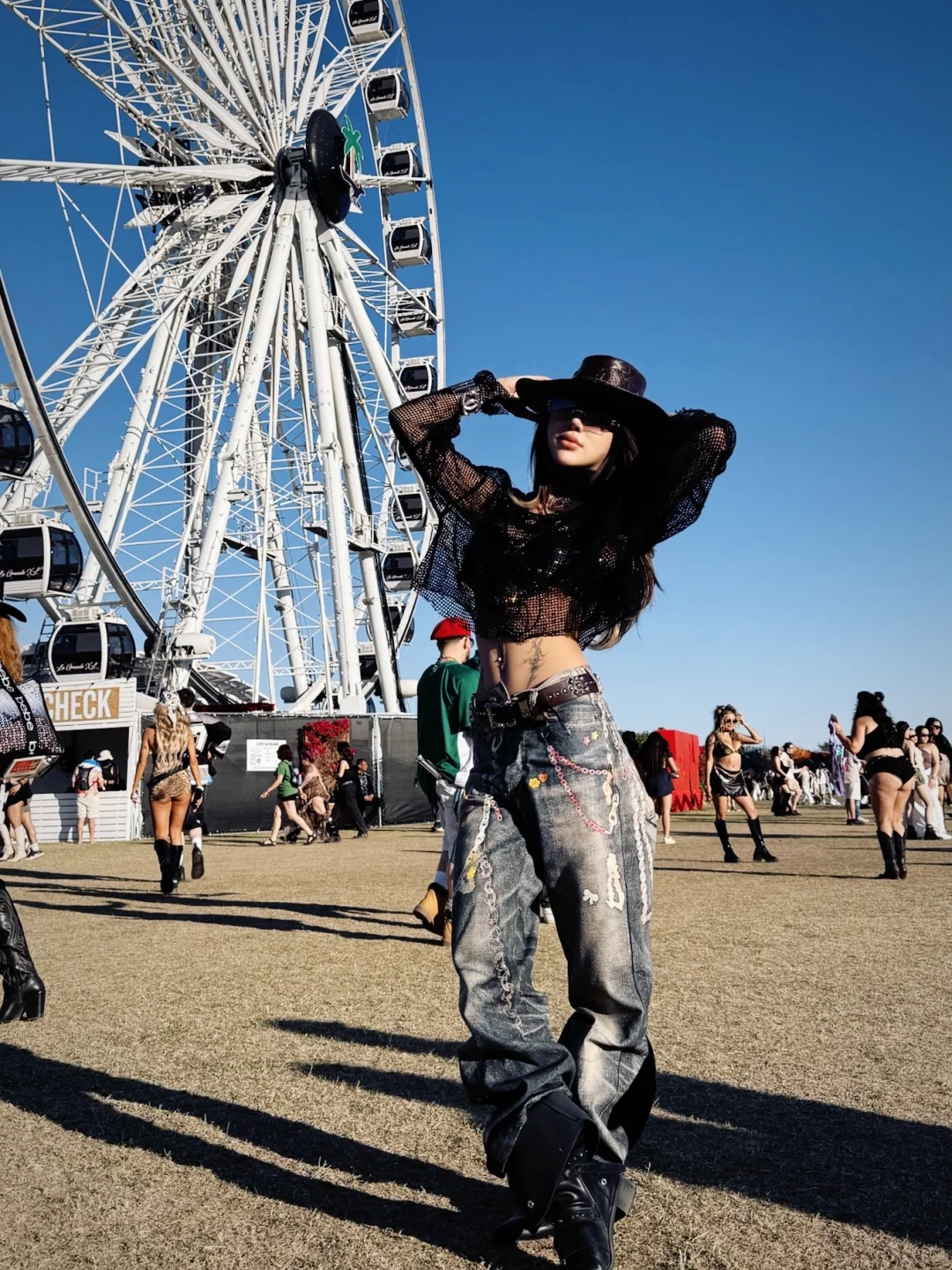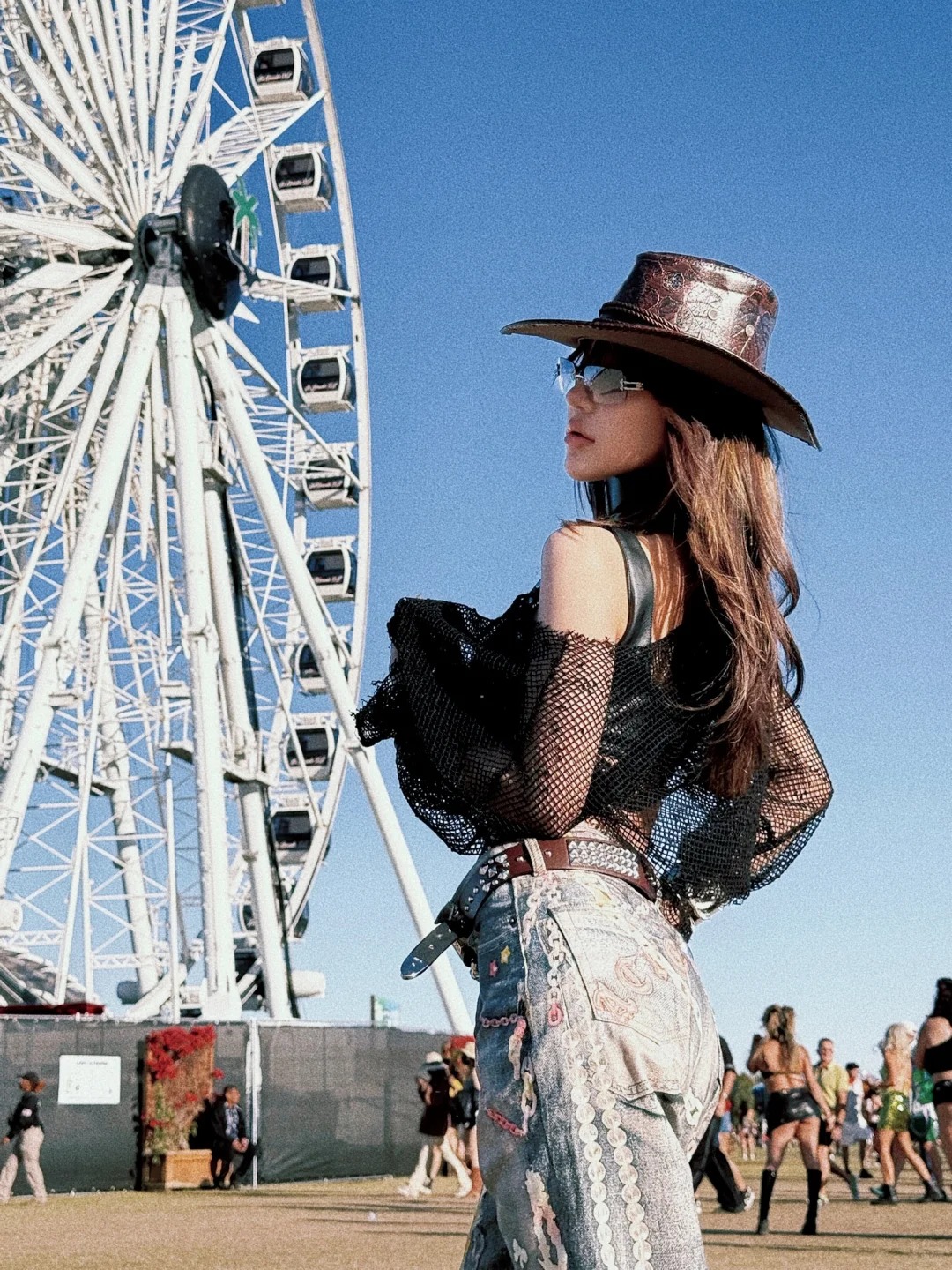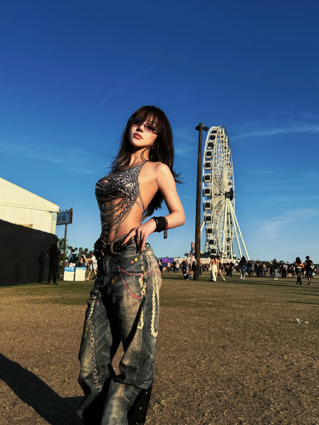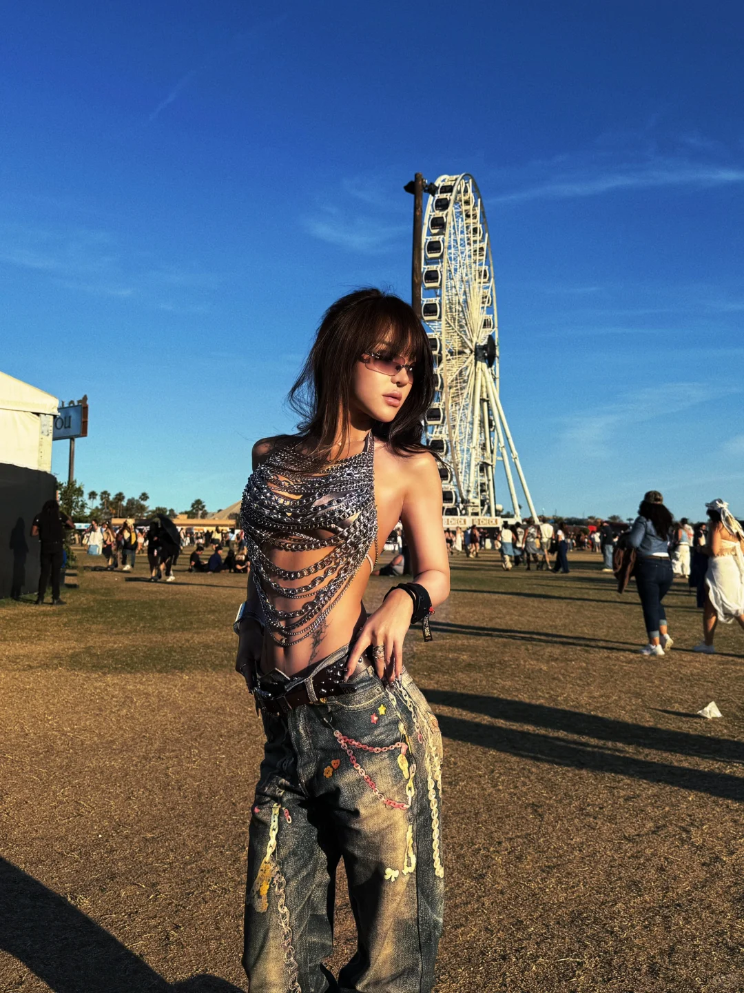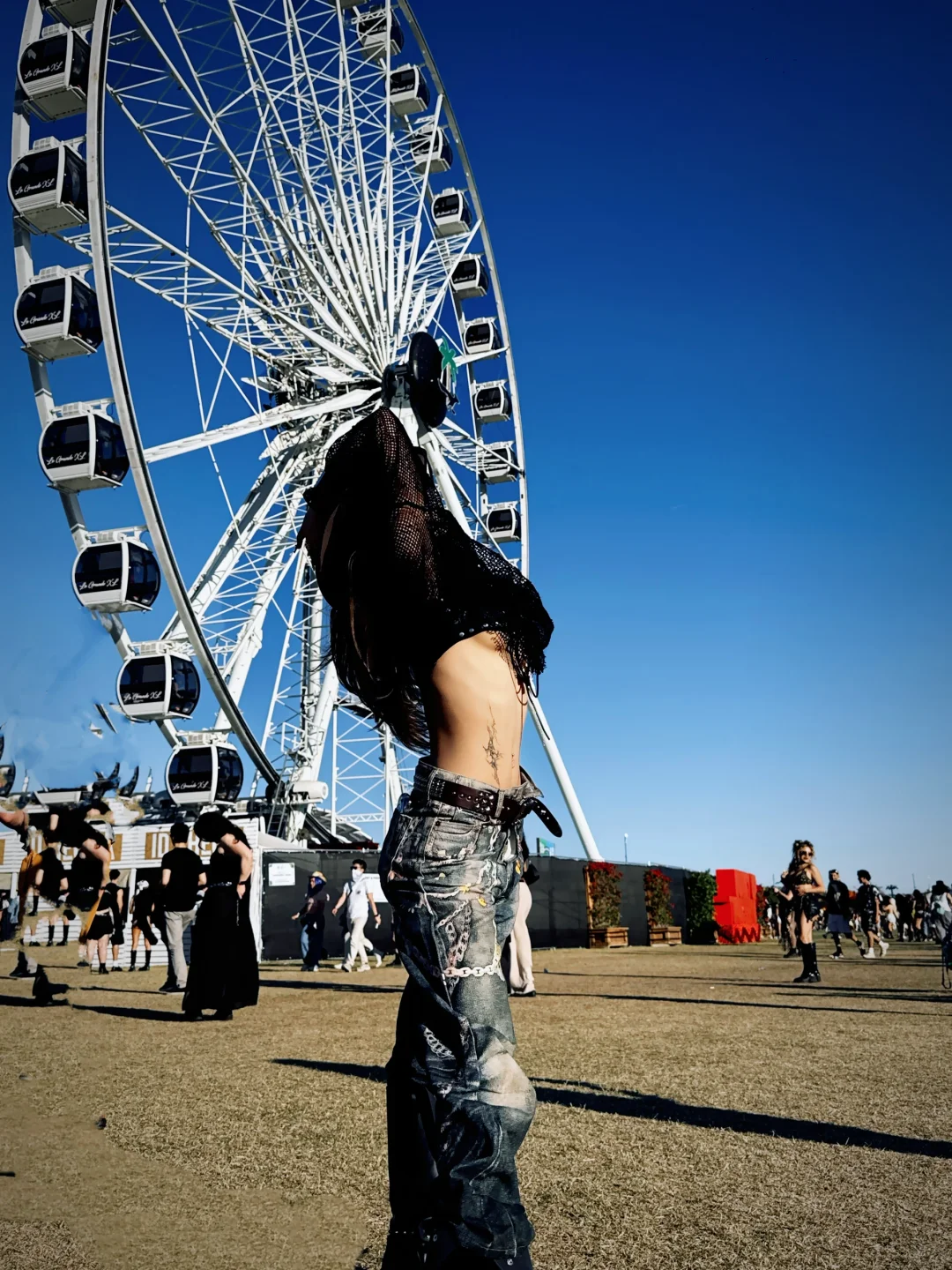 他们用快门声的闪光为我铸链,\n我拆解肋骨作钩,将碎银锻成囚笼\n在沙暴里展览一场坦荡的暴政\n沙尘是朝拜者的吻痕\n而我的身体\n是最后一块未被驯服的沙漠\n附耳过来\n_\"嘘——\n连风也不敢审判\n这具被链条赦免的肉体,\n正用冷光,\n绞碎所有投来的目光\n \n⛓️链条上衣被路人疯狂夸爆,金属光泽在沙漠烈日下像液态银河,Acne链条牛仔裤totally on fire,裤链印花在沙尘里炸开,像行走的霓虹信号弹。\n科切拉氛围比EDC更疯,比火人节更chill——没有“生存挑战”的压迫感,但保留了沙漠自由的野性。\n日落时分的Quasar像异教神殿,Zhu打碟时整片沙地都在共振,人群像被电流过的麦浪。\n明年还来。\n \n#coachella #音乐节穿撘 #辣妹日记 #lisa #女皇的新衣 #沙漠拍照 #欧美风 #音乐节妆容 #高级感 #科切拉 #氛围感 #未来感 #y3k #波嬉风穿搭 #乌托邦 #吉巴罗 #皇帝的新衣