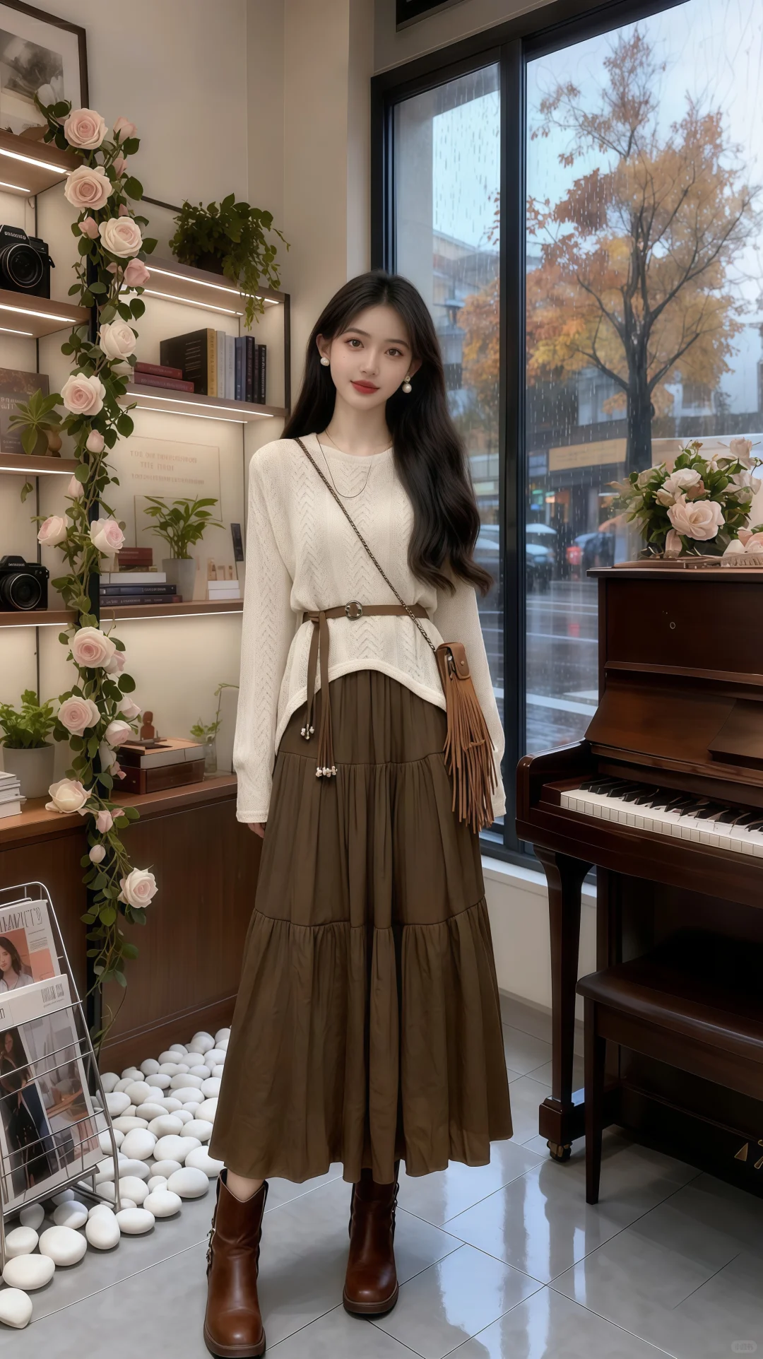 秋天是属于温柔与浪漫的季节,而这一套穿搭完美诠释了秋日的氛围感。上衣简约大方,米白色的针织材质带来温暖的同时,也增添了知性优雅的气质。下身搭配一条复古风的百褶半裙,裙摆随风轻扬,仿佛置身于旧时光的电影画面中。\n \n无论是日常通勤还是周末约会,这套搭配都能轻松驾驭。上衣的V领设计拉长颈部线条,显瘦又显高;半裙的高腰剪裁优化身材比例,让你秒变大长腿。再加上一双简约的小白鞋或复古短靴,整体造型瞬间升级,复古与时尚并存。\n \n这套穿搭不仅适合拍照打卡,更是秋日出行的最佳选择。姐妹们赶快入手,一起美美过秋天吧!🍁#温柔大方提气质 #穿搭女神范 #温柔气质风穿搭 #秋季搭配 #温柔时尚显气质穿搭 #时尚套装 #秋季穿搭女 #衣服搭配 都市栗人#秋日时髦尖子生 秋日时髦尖子生\n#都市栗人 #