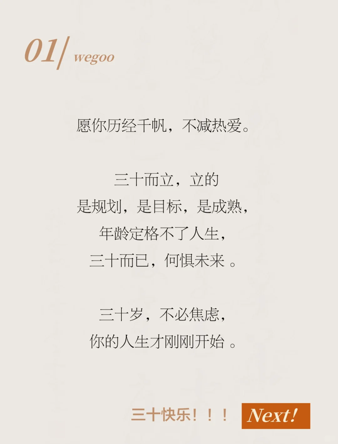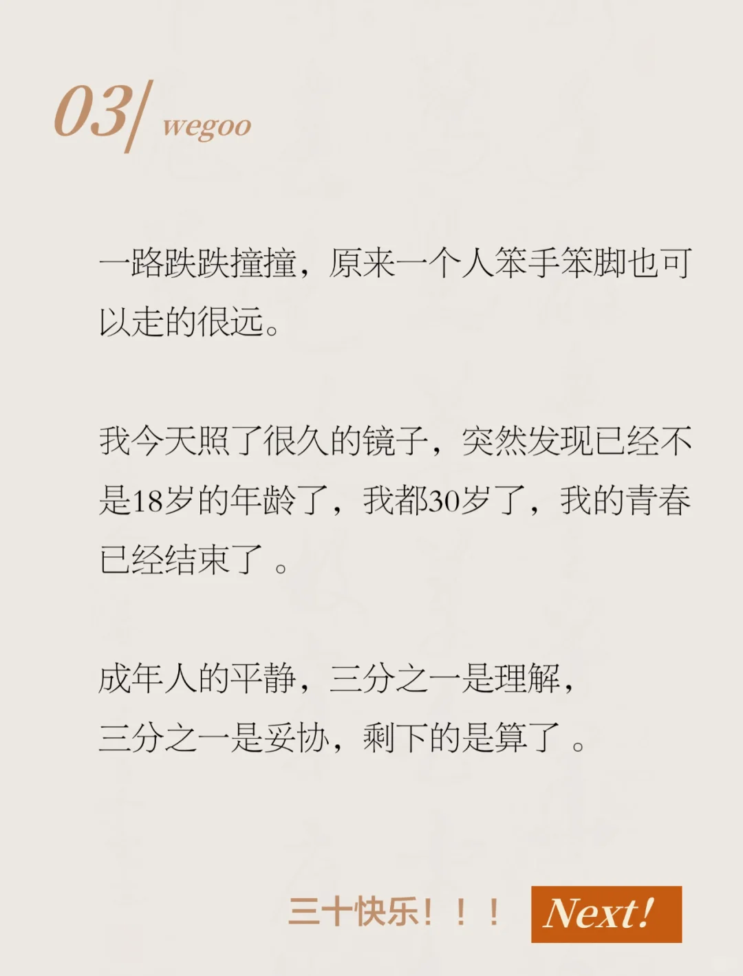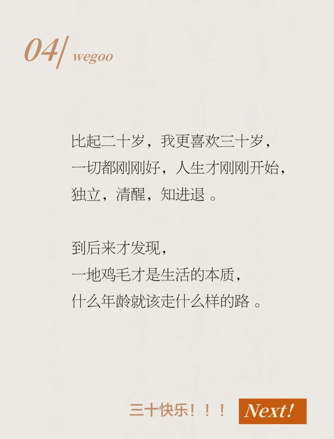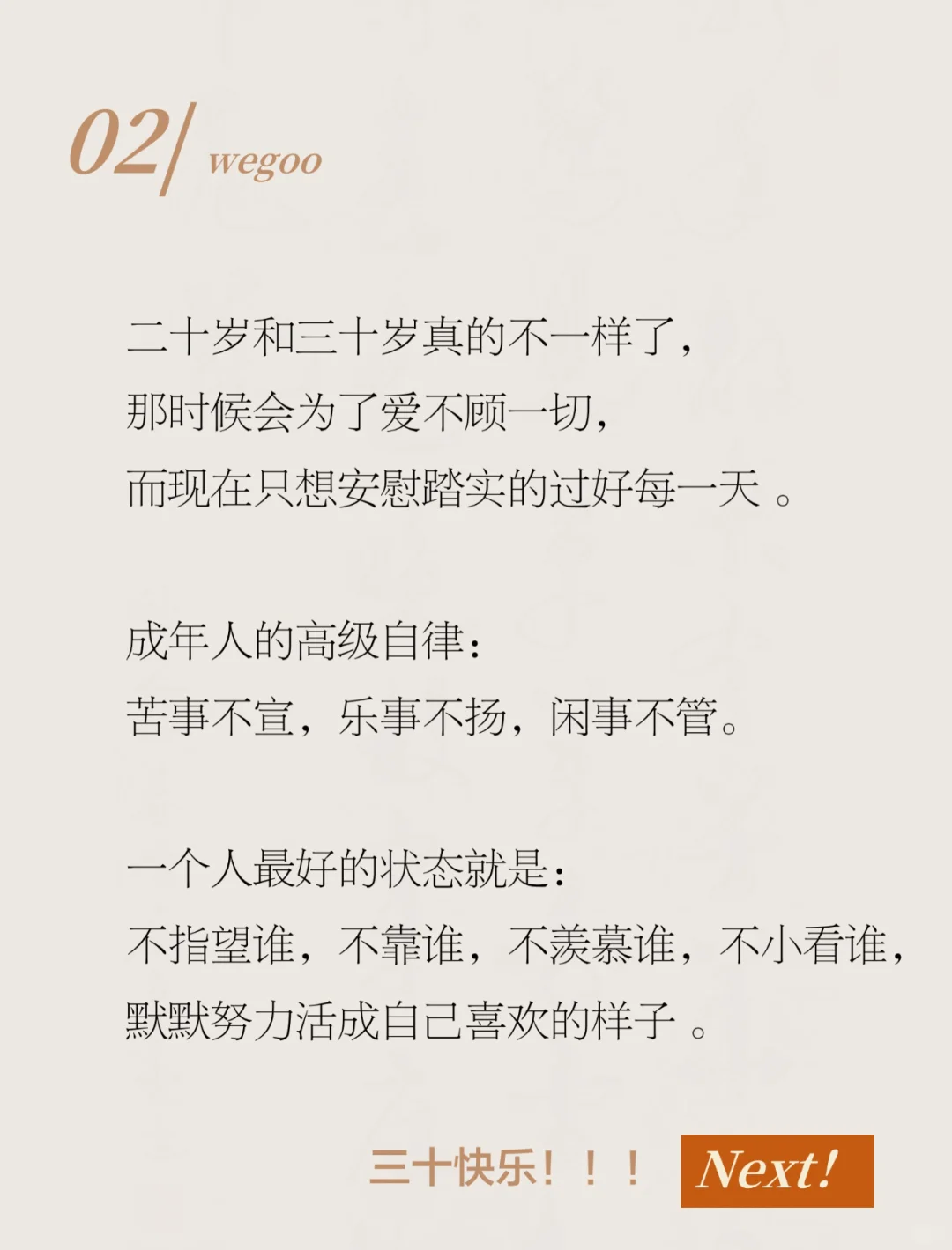 ❤️ 愿你历经千帆,不减热爱。\n \n❤️ 三十而立,立的是规划,是目标,是成熟,年龄定格不了人生,三十而已,何惧未来 。\n \n❤️ 三十岁,不必焦虑,你的人生才刚刚开始 。\n \n❤️ 二十岁和三十岁真的不一样了,那时候会为了爱不顾一切,而现在只想安慰踏实的过好每一天 。\n \n❤️ 成年人的高级自律:苦事不宣,乐事不扬,闲事不管。\n \n❤️ 一个人最好的状态就是:不指望谁,不靠谁,不羡慕谁,不小看谁,默默努力活成自己喜欢的样子 。\n \n❤️ 一路跌跌撞撞,原来一个人笨手笨脚也可以走的很远。\n \n❤️ 我今天照了很久的镜子,突然发现已经不是18岁的年龄了,我都30岁了,我的青春已经结束了 。\n \n❤️ 成年人的平静,三分之一是理解,三分之一是妥协,剩下的是算了 。\n \n❤️ 比起二十岁,我更喜欢三十岁,一切都刚刚好,人生才刚刚开始,独立,清醒,知进退 。\n \n❤️ 到后来才发现,一地鸡毛才是生活的本质,什么年龄就该走什么样的路 。\n \n❤️ 慌什么,才三十多而已,最好的是现在,更好的在未来 。\n \n❤️ 时间扑面而来,我们终将释怀,健康的活着,平静地过着,开心的笑着,适当地忙着就很好 。\n \n#三十而已 #三十 #三十岁女人 #三十而立 #手写文案 #朋友圈文案 #文案 #自律女孩 #拒绝焦虑 #正能量 #正能量语录 #正能量文案 #疗愈 #疗愈内在小孩 #疗愈我的内在小孩 #每日文案 #人间清醒文案 #走心文案