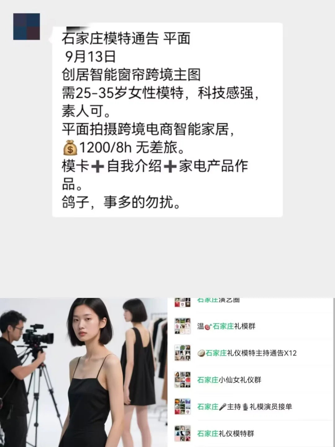 石家庄模特圈9月有多卷?通告群里藏着的接单黄金期真相\n刚刷模特通告群时突然发现,石家庄的商家们像约好了似的,各类通告扎堆冒出来——走秀模特通告、婚样模特通告、平面模特通告、妆面模特通告、服装模特通告、口播信息流模特通告、写真模特通告,从早到晚刷新不停,这波9月热潮真的藏不住!\n其实仔细想想也不意外,9月一到正式入秋,不管是服装品牌要上新秋装、婚纱店筹备秋冬婚样套系,还是美妆品牌赶秋妆推广、本地商家冲下半年业绩,都得靠合适的模特把产品亮点撑起来。而这些商家找模特的首选,往往是专业的模特通告群,毕竟群里能精准匹配风格,不管是甜妹风、通勤风还是复古风,都能快速找到适配的人。\n对新人模特来说,这可是难得的入行契机。群里的妆面通告能练镜头感,写真通告能攒作品集,不用愁没机会起步;素人想尝试的话,婚样、平面这类对经验要求没那么高的通告,刚好能用来熟悉拍摄流程,慢慢找到自己的风格;至于成熟模特,服装走秀、口播信息流这些高需求通告,正好能趁着黄金期多接单,再往上冲一冲业绩。\n之前总听人说模特圈难入行,其实是没找对渠道。专业的模特通告群就像个“精准对接站”,商家不用大海捞针找模特,模特也不用四处打听等机会,双方都能高效匹配。9月的石家庄模特圈,早已经是一片忙碌的景象,不管你是想入行、练经验还是冲业绩,抓住这波热潮,说不定就能遇到合适的机会~#新人模特 #平面模特 #全国礼仪模特主持演艺演员通告 #模特拍摄 #模特经纪人 #模特走秀 #模特 #礼仪模特 #石家庄模特礼仪通告群#素人模特