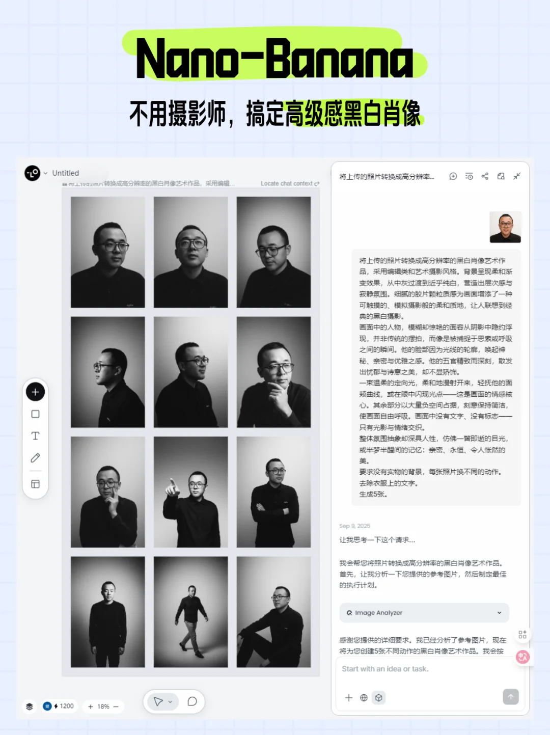直接进主题:\n1、梯子,梯子,梯子很重要,而且最好是老美的梯子\n2、有三个网站可供你选择:https://aistudio.google.com/https://lmarena.ai/https://www.lovart.ai/home(PS:谷歌最稳定,但是只能一张一张出,lmarena也能用就是调用谷歌,不过会出现再次出图出不来的情况,lovart能一次出多张图,但是依旧会出问题,有时半天出不来图,有时直接调用其他模型,具体原因不详)\n3、记得选择模型“NanoBanana”或“gemini-2.5-image”\n4、输入魔法口令:\n将上传的照片转换成高分辨率的黑白肖像艺术作品,采用编辑类和艺术摄影风格。背景呈现柔和渐变效果,从中灰过渡到近乎纯白,营造出层次感与寂静氛围。细腻的胶片颗粒质感为画面增添了一种可触摸的、模拟摄影般的柔和质地,让人联想到经典的黑白摄影。\n画面中的人物,模糊却惊艳的面容从阴影中隐约浮现,并非传统的摆拍,而像是被捕捉于思索或呼吸之间的瞬间。他的脸部因为光线的轮廓,唤起神秘、亲密与优雅之感。他的五官精致而深刻,散发出忧郁与诗意之美,却不显矫饰。\n一束温柔的定向光,柔和地漫射开来,轻抚他的面颊曲线,或在眼中闪现光点——这是画面的情感核心。其余部分以大量负空间占据,刻意保持简洁,使画面自由呼吸。画面中没有文字、没有标志——只有光影与情绪交织。整体氛围抽象却深具人性,仿佛一瞥即逝的目光,或半梦半醒间的记忆:亲密、永恒、令人怅然的美。\n5、注意点:只有lovart能让它出多图,而且最好是5张图,出9张它容易混乱。具体出现的问题减P10、P11、P12\n#黑白写真 #AI生成 #nanobanana #艺术照 #自拍