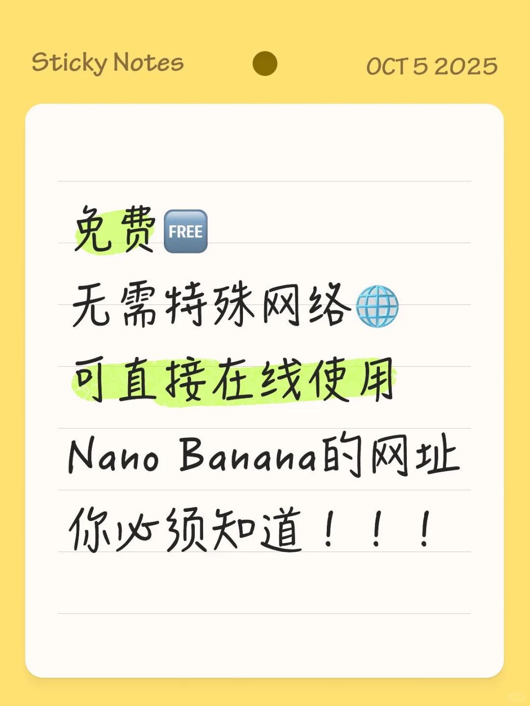 免费🆓\n无需特殊网络🌐\n可直接在线使用的Nano Banana\n它出现了!\n \n小白式生图操作,无需设置任何复杂参数,输入提示词即可一键生成爆款图片哟\n \n而且内置全网爆款提示词模板,可直接套用修改。妈妈再也不用担心我不会写提示词了\n \n贴主也是刚刚了解到这个网址的,迫不及待的就想分享给各位小🍠们。\n \n据小道消息听说是永久免费的,但可能是国庆假期原因使用量过大,为控制成本踩开始有次数限制。\n \n不过现在国庆假期才过半,还可以免费不限次数使用四天!吧主人真的太好了\n \n喜欢的小伙伴一起冲,也欢迎在评论区分享更加好用的宝藏网址哟\n#AI工具 #AI生成 #创作者必备 #网站推荐 #AI视频 #AI生图 #AI自媒体 #作图神器 #自媒体工具