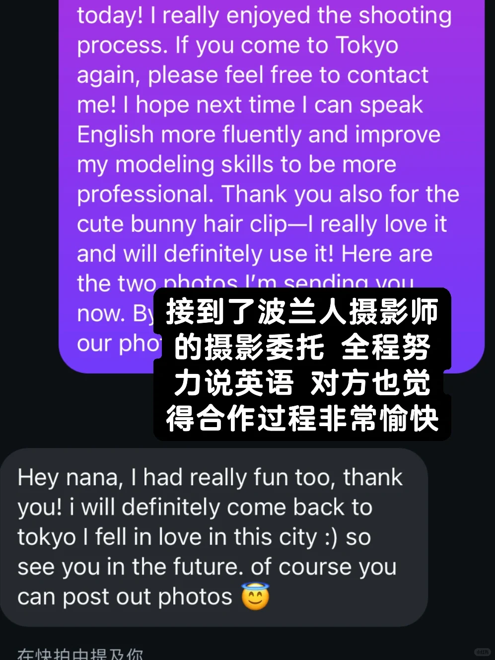 刚开始只是做朋友的模特\n后来发现自己真的爱上了当模特…\n所以就慢慢开始做自由模特!\n后来拍的作品越来越多人喜欢 粉丝也越来越多!(非常幸运的…🥹🥹🥹🥹\n也结识了很多非常棒的摄影老师!有几位都是长期合作一直在拍的!我很喜欢他们的风格以及才能 也很感谢他们愿意选择我\n \n再后来 就有合作找我了!\n有国人 也有日本人还有越南 智利 波兰等各个国家的摄影师们!!!依旧是非常荣幸的…😭\n我开始努力对应英语和日语的拍摄!虽然语言依旧有不通的地方 但是每次都是非常愉快的结束了拍摄!!\n拍摄前我会积极对应 包括服装妆造 概念风格等 拍摄时也会积极沟通姿势 不喊累 基本配合摄影师完成想要的感觉!\n \n甚至还有走秀 大赛等的模特委托!!!我开始走向各种的舞台!🥹🥹🥹🥹\n \n一切都太幸运了…没想到自己能够走到这里…\n#nanaplog #留学日本 #东京 #模特 #模特拍摄