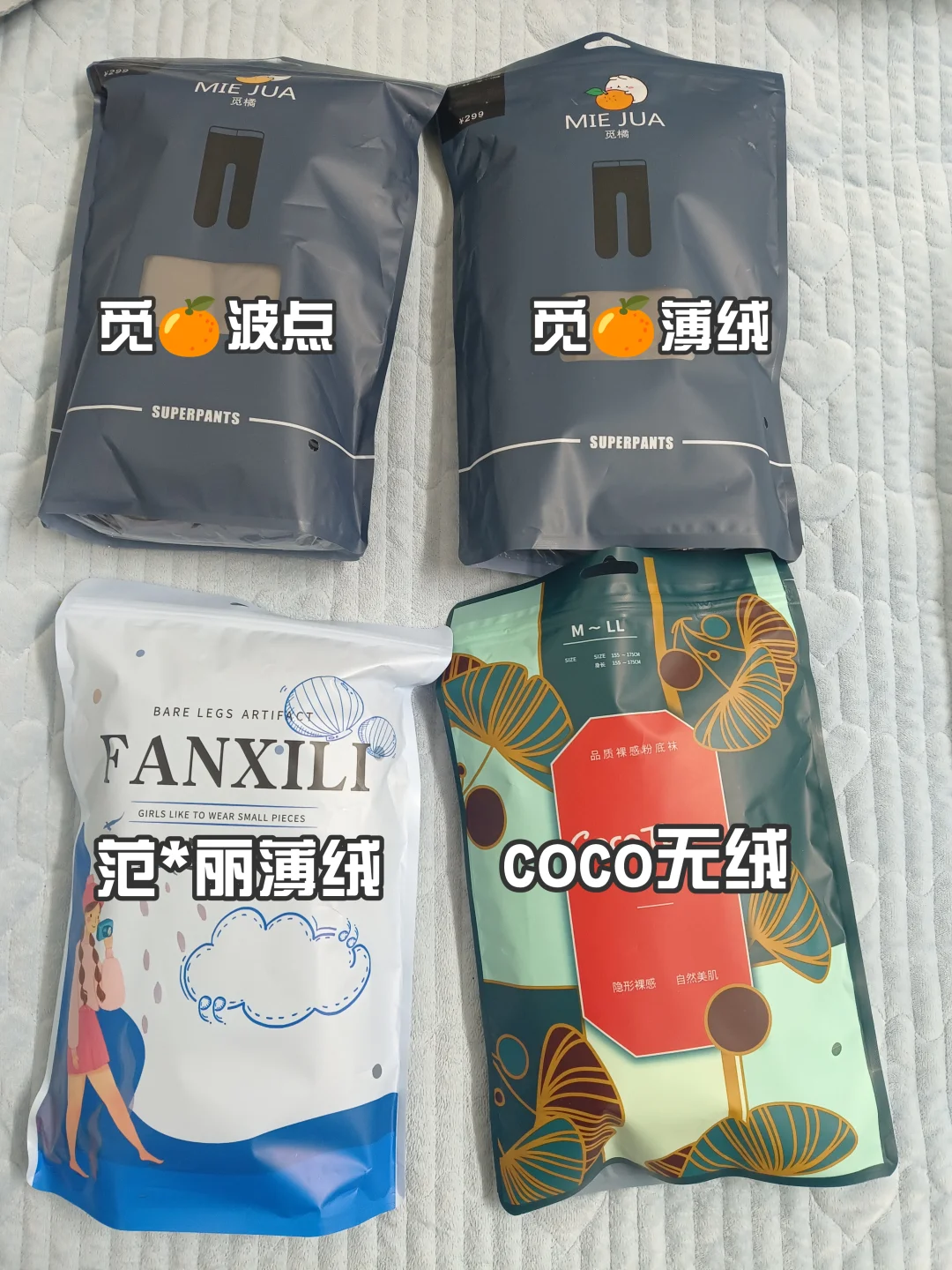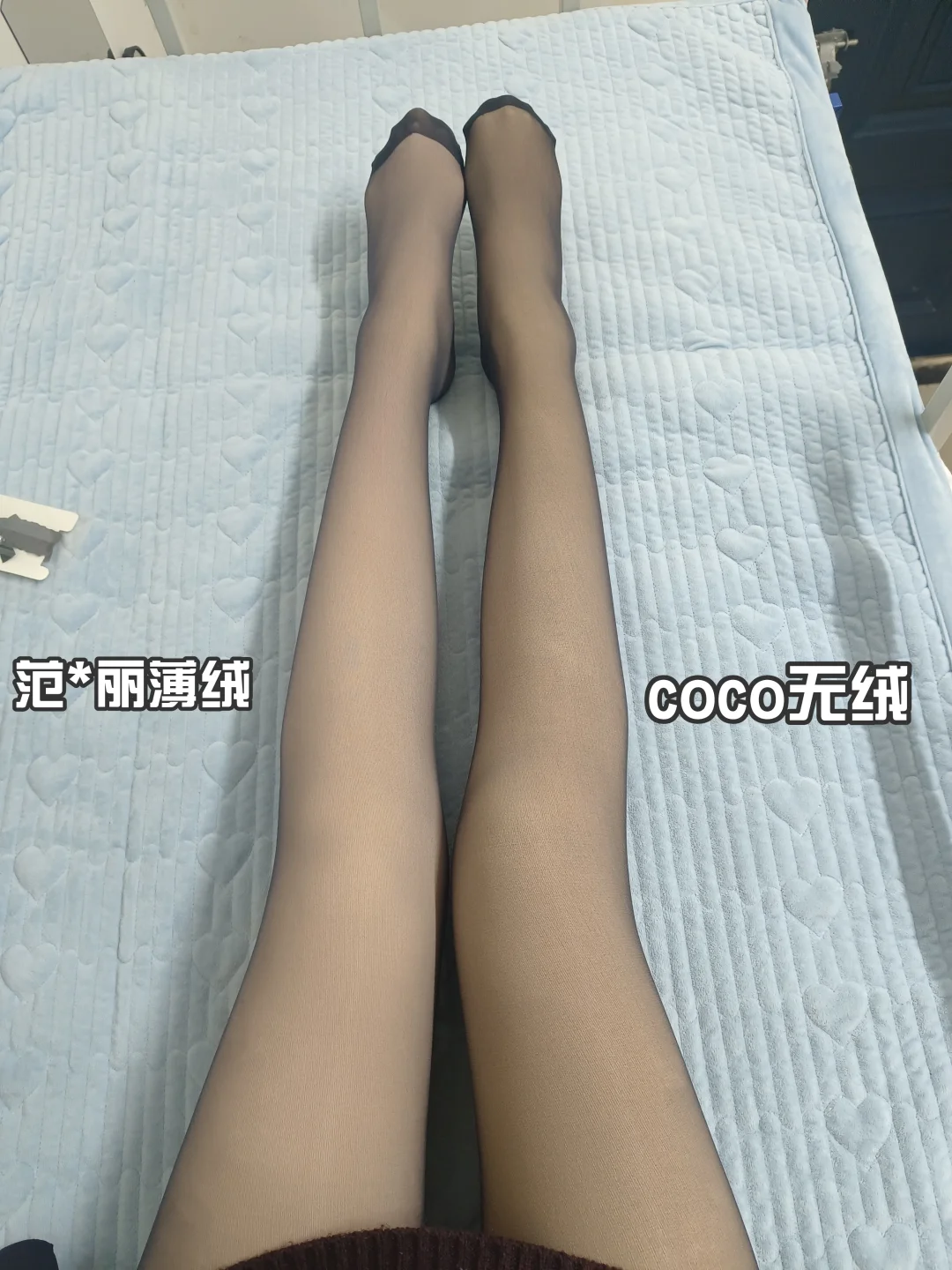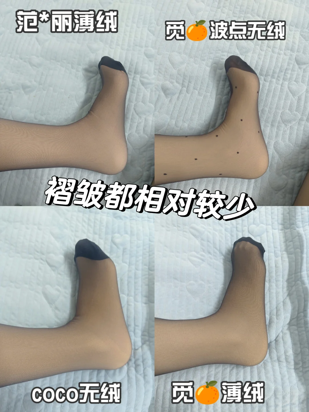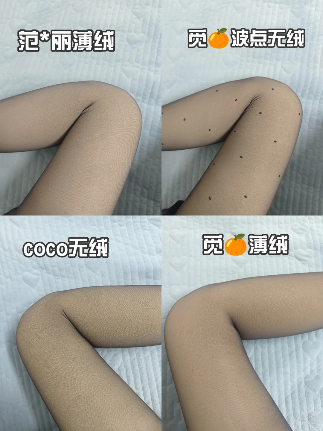 秋冬想要与众不同还想美丽的姐妹都要买加绒黑丝呀我是直接买了四条\n第,条,都是觅🍊的个普通款薄绒的,这个超级自然呀,就像光腿穿了一个黑丝,简单又百搭。里袜连脚设计也非常贴心,不会很勒脚,拒绝“现代刑具”\n \n第个是波点的,是那种小千金风的,之前没尝试过,试过之后感觉真香啊,又贵气又性感超级喜欢。\n \n第条是coco无绒的,是偏黑一点的,里袜偏黄一点,适合黄黑皮姐妹,整体来说质量也挺好的。\n \n第条是范*丽薄绒的,里袜偏白,适合白皮姐妹呀,毛毛也是软软的,很自然的一款。\n \n总体来说,没有踩雷耶。这个冬天要当一个精致的女孩呦。#丝袜 #自然又好穿的黑丝 #丝袜测评 #没有褶皱的光腿神器 #原相机测评 #记录吧就现在