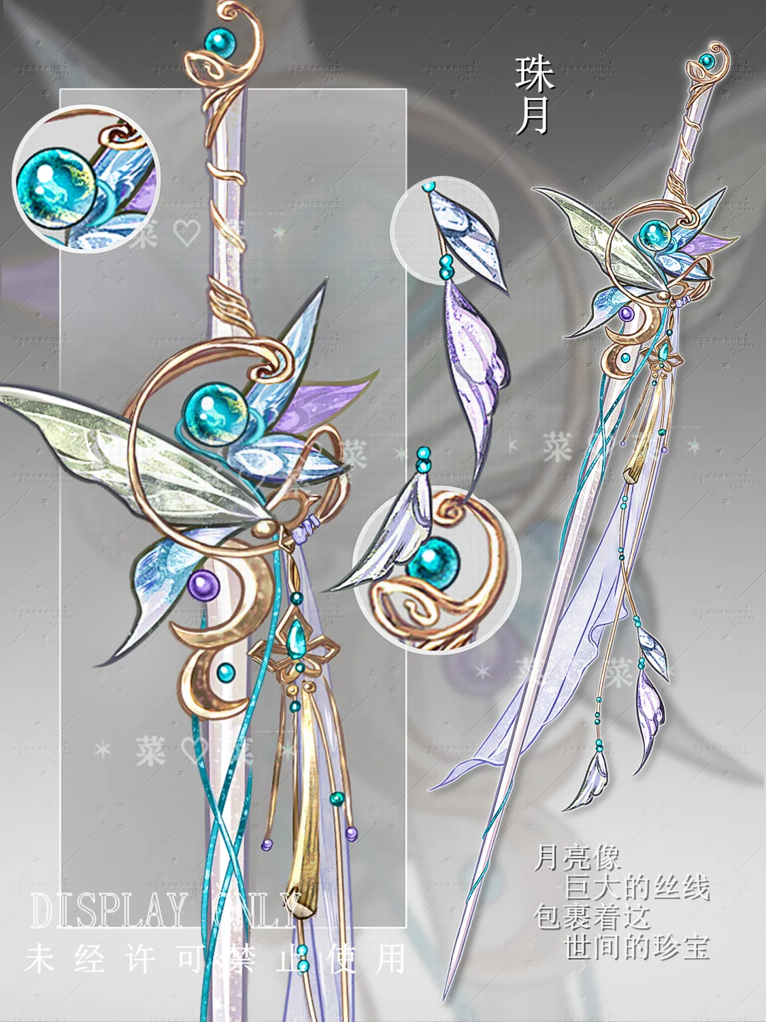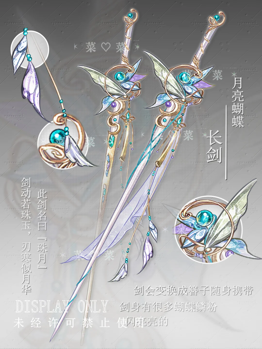 弹珠要求由簪子草稿改编成剑,因此在设计上更为华贵。剑格处金丝缠绕着两只蝴蝶,中心拱绕着一颗暗藏金光的绿色珠子,剑格处虽然内容丰富,但结构比较脆弱,仅能存在于玄幻或仙侠世界里,靠灵力维持剑身坚韧