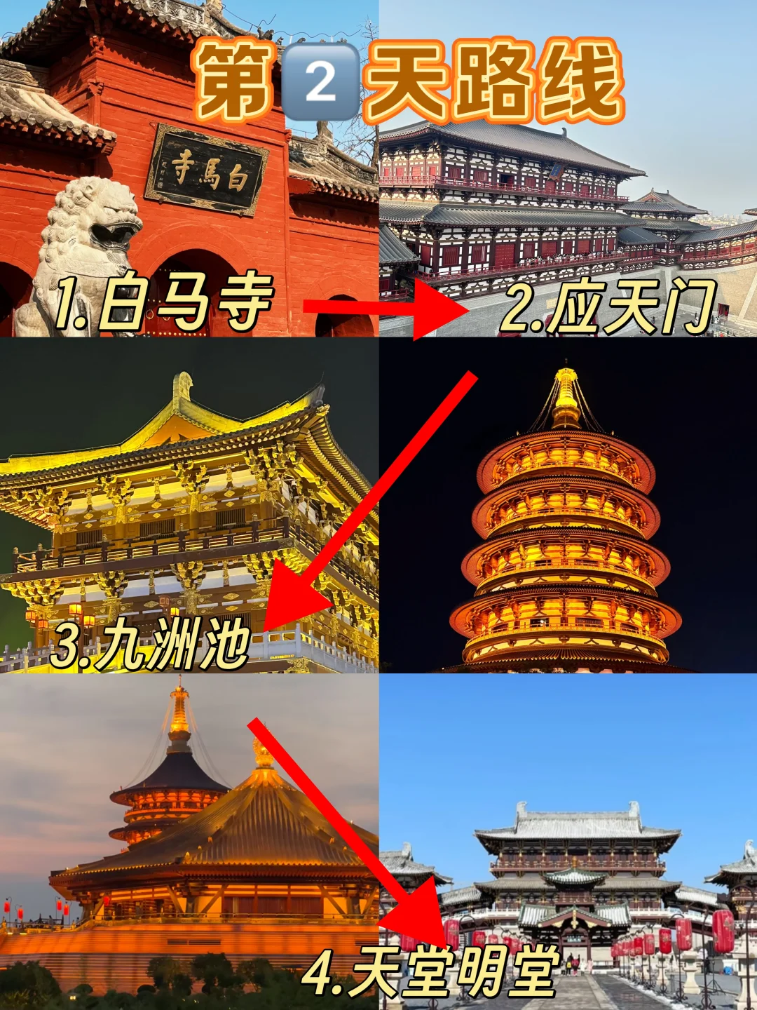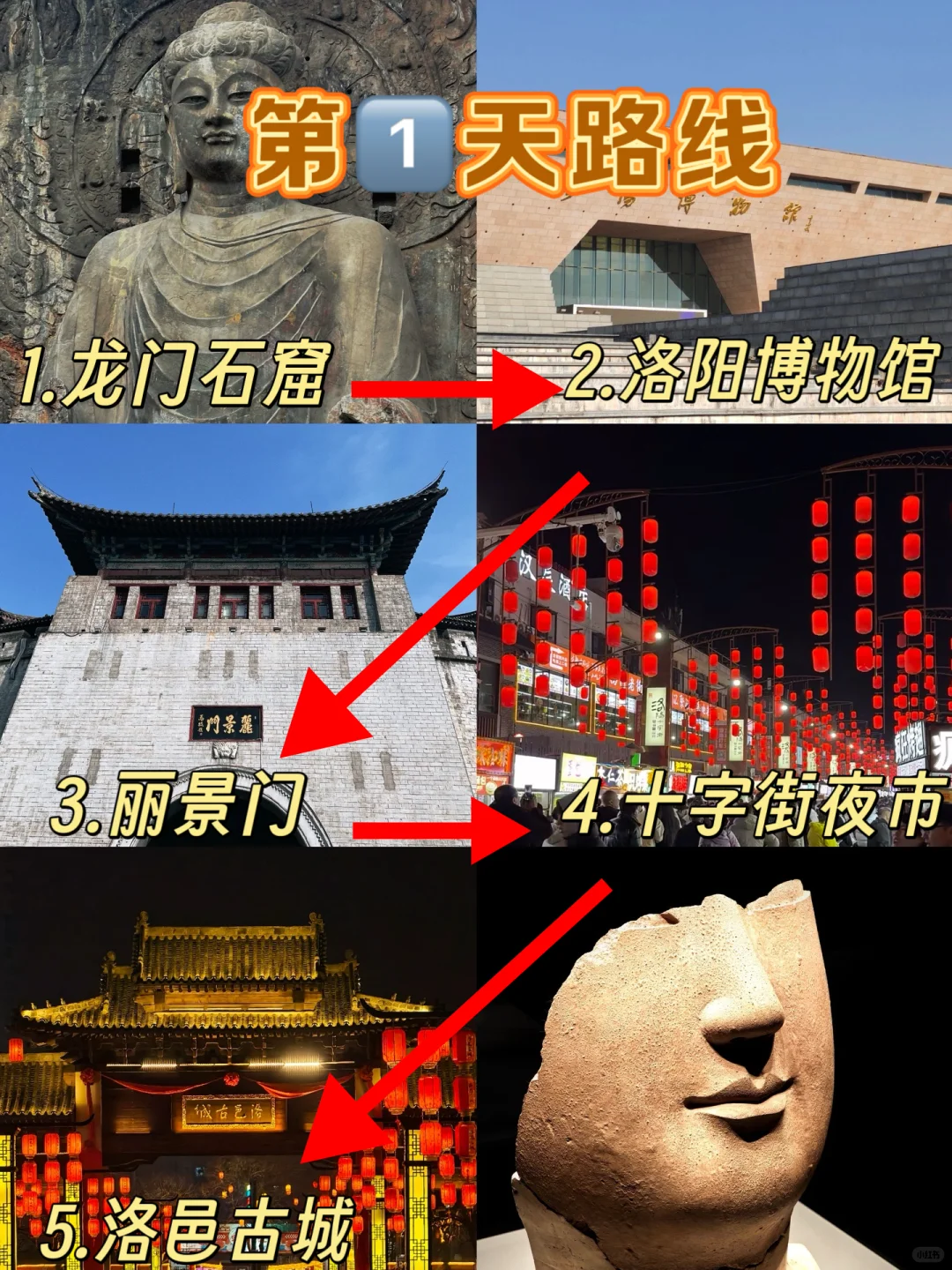 作为洛阳本地人,给大家总结洛阳2天1晚保姆级攻略!轻松打卡热门景点!\n第1️⃣天:\n上午:龙门石窟(游玩时间大概3-4小时)\n- 交通:洛阳火车站或者洛阳高铁站下车都可乘坐公交81路直达,下车步行步行900m左右。\n- 亮点:卢舍那大佛打卡、香山寺、白园…\n- 门票:90r(含西山、东山、香山寺)\n⬇️\n下午:洛阳博物馆(游玩时间2小时)\n- 交通:地铁🚇二号线文博园站下车步行600m\n公交🚌1路/77路/201路\n-时间:9:00-17:00(16:30停止入馆,周一闭馆)\n- 亮点:姐妹牵手女俑,珍宝馆,唐三彩馆\n- 🌟🌟🌟要提前在公众号预约免费票!\n- 文创店手串,冰箱贴、杯子都好好看!\n⬇️\n傍晚:洛邑古城➕丽景门➕十字街夜市\n-交通:推荐路线:🚇丽景门站A口出➡️丽景门(登阙楼30r),从丽景门步行到十字街夜市(大概15min)➡️步行到洛邑古城(大概15min)\n一路上全是小吃,十字街推荐刑记面筋卷饼,老爷爷的糯叽叽牡丹香糕\n-除了登阙楼,都是不需要门票的,洛邑古城需要刷身份证\n第2️⃣天:\n上午:白马寺(游玩时间2-3小时)\n- 交通:公交🚌56路下车直达\n- 亮点:中国第一古刹,含中、印、缅、泰四国风格佛殿。\n门票🎫35r。\n⬇️\n下午:隋唐洛阳城(应天门➕天堂明堂➕九洲池)\n-交通:地铁🚇一号线应天门站直达\n- 应天门门票🎫60r\n-明堂天堂门票🎫120r\n-九洲池门票🎫30r\n这三个地方离得很近,基本步行5-10min\n晚上九洲池不同时间段还有表演!\n适合夜游,灯光亮起拍照很出片!附近也有很多汉服店!方便妆造!\n⬇️⬇️⬇️\n🌟这三个地方离洛阳站很近,打车🚗10min左右,坐车很方便!\n⬇️⬇️⬇️\n-文案:\n📍𝐋𝐮𝐨 𝐲𝐚𝐧𝐠|洛阳\n“若问古今兴废事,请君只看洛阳城”\n“一座洛阳城,半部华夏史”\n“风起洛阳,梦入神都”\n“千年帝都,牡丹花城”\n“千窟为佑,太平无忧”\n“见山,见佛,见世界”\n“我本无意入龙门,奈何千窟入我心”\n“𝑳𝒖𝒐𝒚𝒂𝒏𝒈📍第一古刹”\n“白马寺 -“佛用佛心爱世人””\n“顺遂无虞,皆得所愿”\n“风起洛阳,梦入神都”\n#洛阳 #洛阳旅行 #洛阳美食 #旅游文案 #洛阳旅游 #洛阳 #五一 #白马寺 #龙门石窟 #文案 #洛阳文案 #洛阳博物馆 #应天门 #洛邑古城 #天堂明堂 #洛阳十字街 #游玩攻略 #洛阳旅游攻略