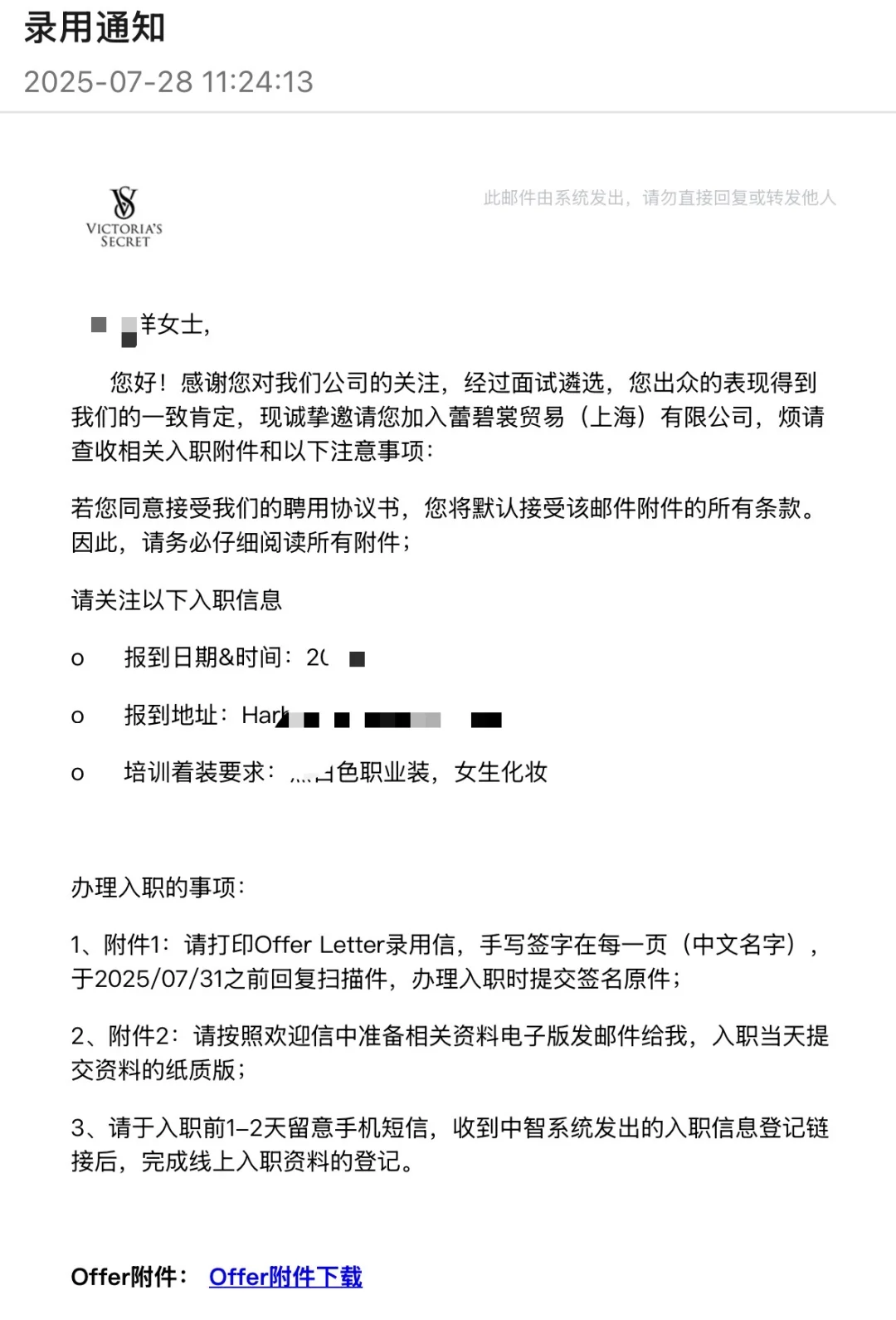 😭从初试到现场面试到收到offer的这50天,每天都在疯狂刷小红书接好运🍀,现在终于轮到我来还愿啦~\n \n面试那天特意穿了简约的白衬衫配高黑色裙子,化了清透的伪素颜妆,面试官超温柔,区经的问题也真的很敏锐,也#时尚从业者 可以感受到能力的体现,问的问题都围绕着“对美和自信的理解”“如何帮顾客找到适合的尺码”,全程保持微笑和眼神交流真的很加分!\n \n收到offer邮件的时候手都在抖,立刻拉着闺蜜去买了新的高跟鞋👠,想象着以后每天在满是蕾丝和香水味的环境里工作,还能第一时间摸到新款内衣,这大概就是女生梦想中的职场吧!\n \n偷偷告诉你们,面试时真诚自信比套路更重要哦~ 把对品牌的喜欢和对服务的热情说出来,就已经赢了大半啦!祝所有在追梦的姐妹都能如愿以偿,我们都值得闪闪发光✨\n \n面试还赠送了,面试礼物,身体乳和笔记本📒,真的超级细心,#晒晒我的offer #斩获offer的秘诀 #轮到我晒offer了 #对女性友好 #时尚行业打工 #感谢品牌方邀请体验 #解锁人生新成就 #维秘 #维多利亚的秘密