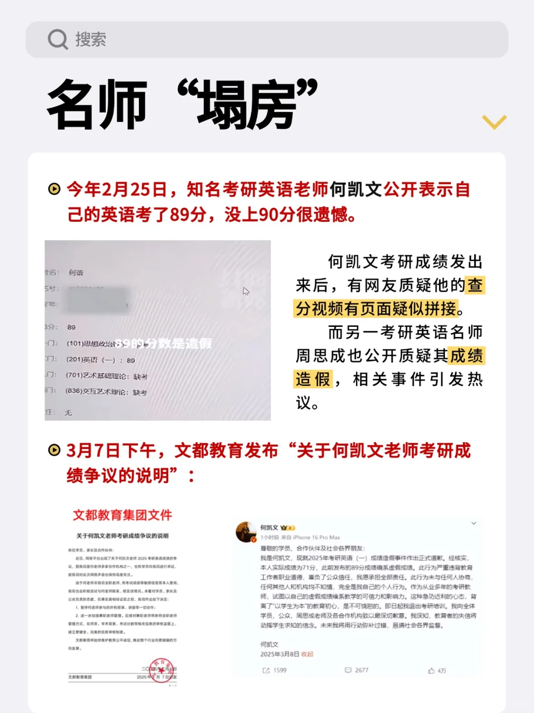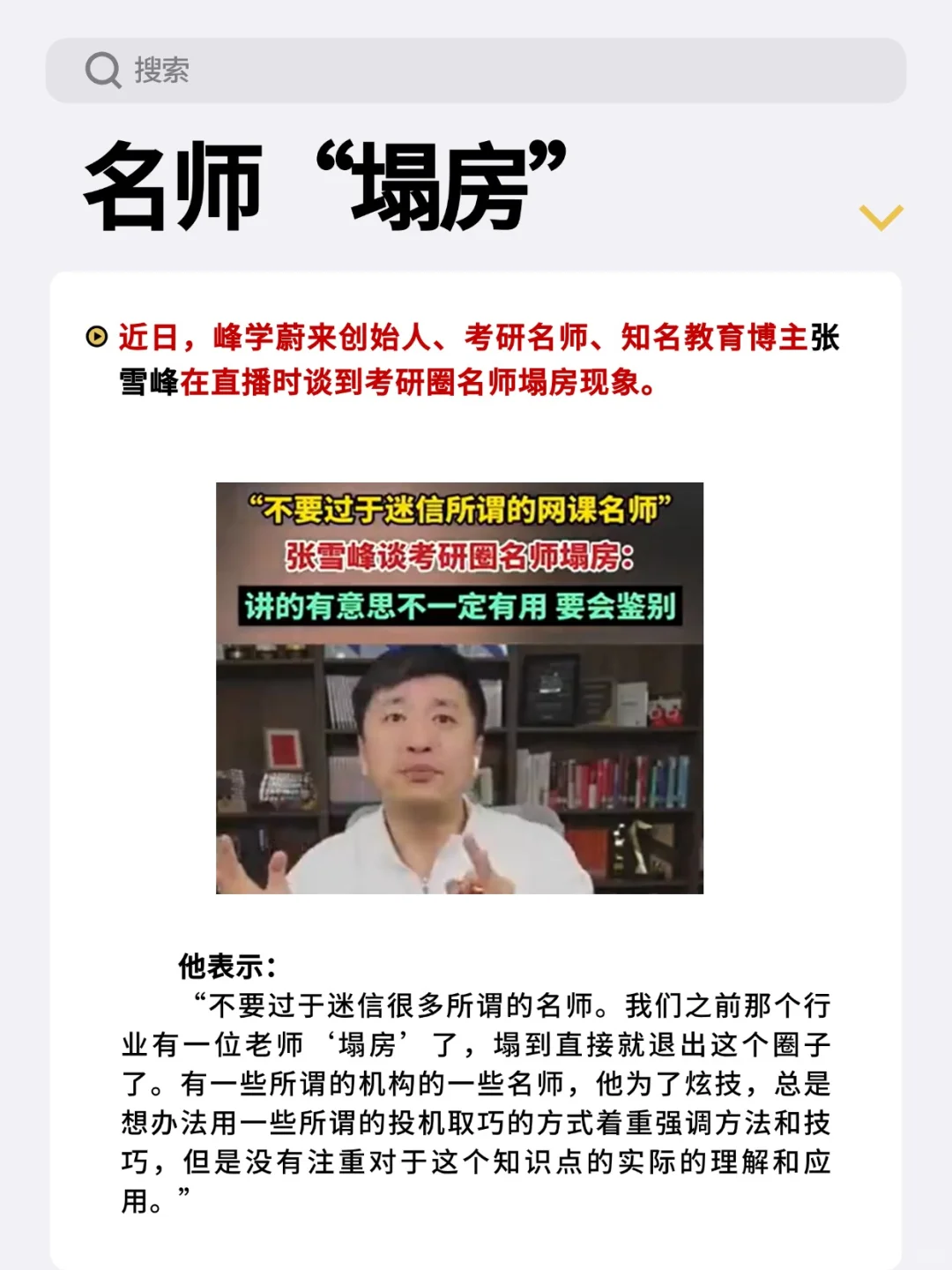 近日,峰学蔚来创始人、考研名师、知名教育博主张雪峰在直播时谈到考研圈名师塌房现象👀。\n \n他表示:“不要过于迷信很多所谓的名师。我们之前那个行业有一位老师‘塌房’了,塌到直接就退出这个圈子了。有一些所谓的机构的一些名师,他为了炫技,总是想办法用一些所谓的投机取巧的方式着重强调方法和技巧,但是没有注重对于这个知识点的实际的理解和应用。”\n \n今年 2 月 25 日,知名考研英语老师何凯文公开表示自己的英语考了 89 分,没上 90 分很遗憾。\n何凯文考研成绩发出来后,有网友质疑他的查分视频有页面疑似拼接。而另一考研英语名师周思成也公开质疑其成绩造假,相关事件引发热议。\n \n✅3 月 7 日下午,文都教育发布 “关于何凯文老师考研成绩争议的说明”:\n1. 暂停何老师参与的所有授课、讲座等一切合作;\n2. 进一步加强兼职老师管理。后续对兼职老师将参照全职老师管理方式,在师资、学术背景、考试分数等相关信息的审核监管上建立更健全、完善的信息审核制度。\n \n这一事件折射出当前教育培训行业的诸多深层问题,值得从多个维度进行理性分析:\n✅一、名师效应的双刃剑⚔️\n💡教育资本化催生的 \"造神运动\" 催生了过度包装现象,部分机构为追求流量效益,刻意打造教师 \"全知全能\" 的人设,导致行业出现本末倒置的异化倾向。\n💡学生群体普遍存在的应试焦虑与信息不对称,使 \"名师崇拜\" 成为市场刚需。\n✅二、知识传授的本质回归\n教育心理学研究表明,真正有效的学习应建立在知识体系建构(如布鲁纳结构主义理论)与认知迁移能力培养基础上📚。单纯的技巧训练容易导致 \"解题机器\" 现象🤖,这在近年考研命题反套路化趋势下愈发凸显。\n \n✅三、学生选择的理性指南\n💡建立 \"三维评估模型\":学术资历(学历、研究成果)占 40%、教学口碑(往届学生实证反馈)占 35%、课程体系科学性占 25%。\n💡警惕 \"承诺陷阱\",对于宣称 \"押 | 题 | 必 | 中\"\" 速 | 成 | 秘 | 籍 \" 的课程保持审慎,重点关注是否包含学术思维训练模块。\n \n正如苏格拉底所言:\"教育不是灌输,而是点燃火焰\", 一万次灌输不如一次真正的唤醒💖。\n#马鞍山 #名师 #人民教师 #教师 #教育 #考研 #马鞍山家长 #马鞍山二中