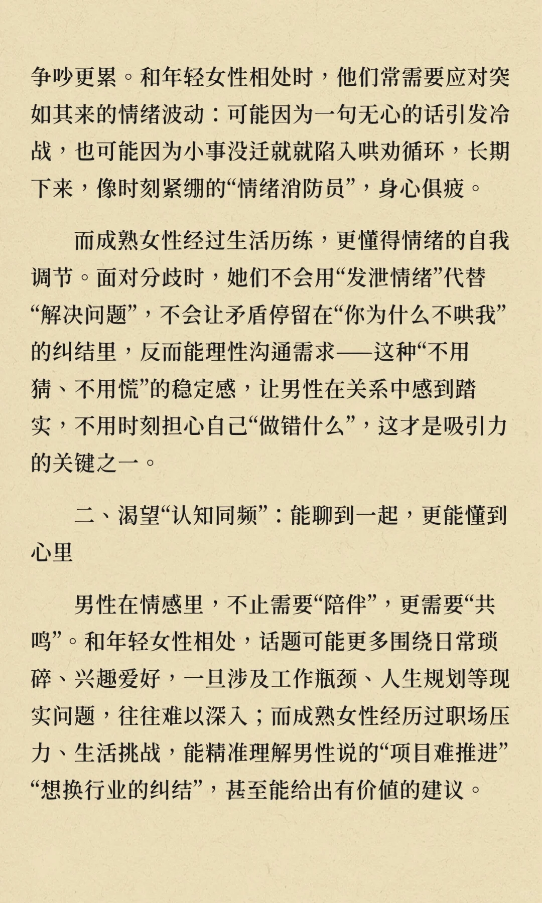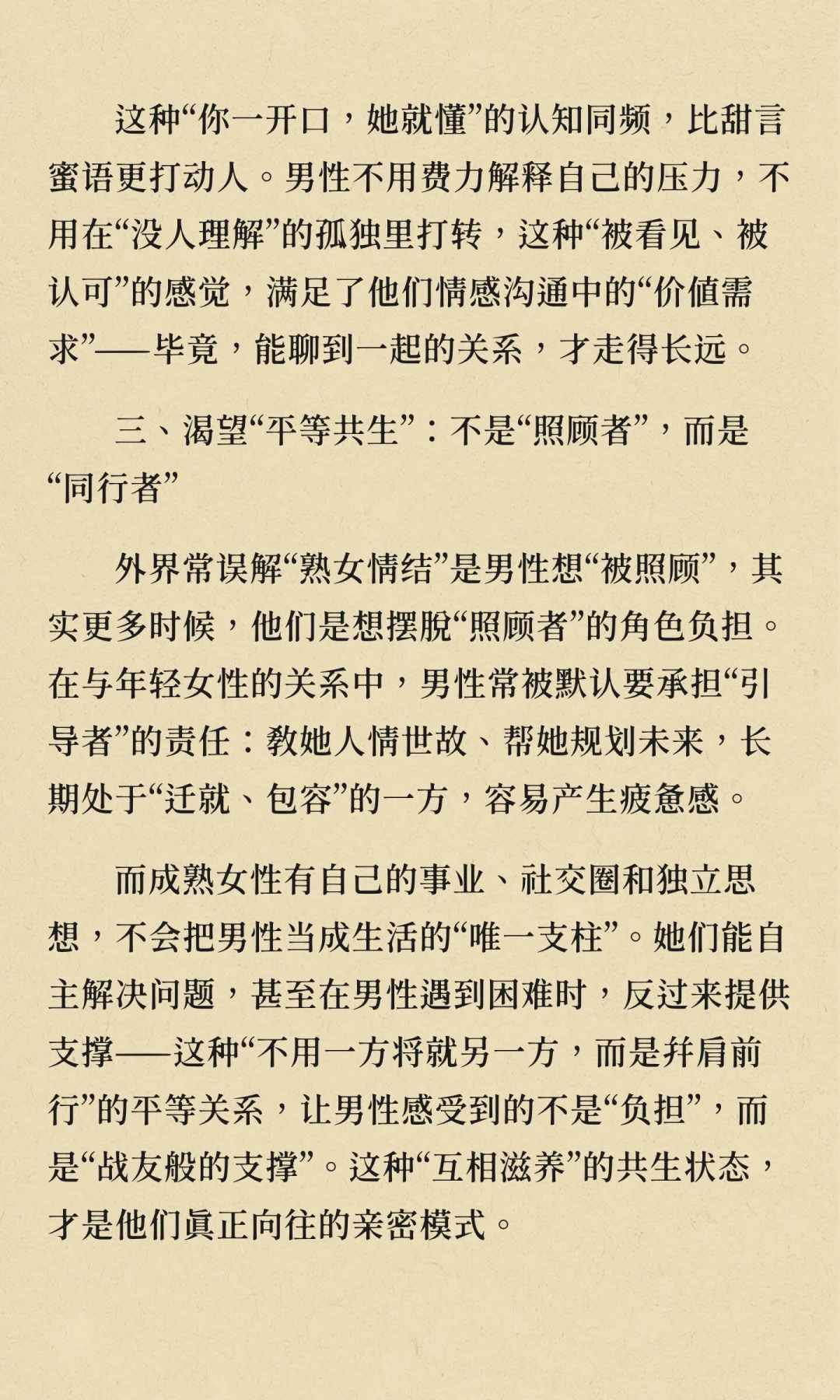 男人的“熟女情结”并非单纯喜欢成熟女性的外表,而是渴望在亲密关系中获得情绪稳定、认知同频和平等共生的满足感。成熟女性能提供理性沟通、深度共鸣和相互支持,帮助男性在关系中感到踏实和被理解,这才是他们真正向往的亲密模式。