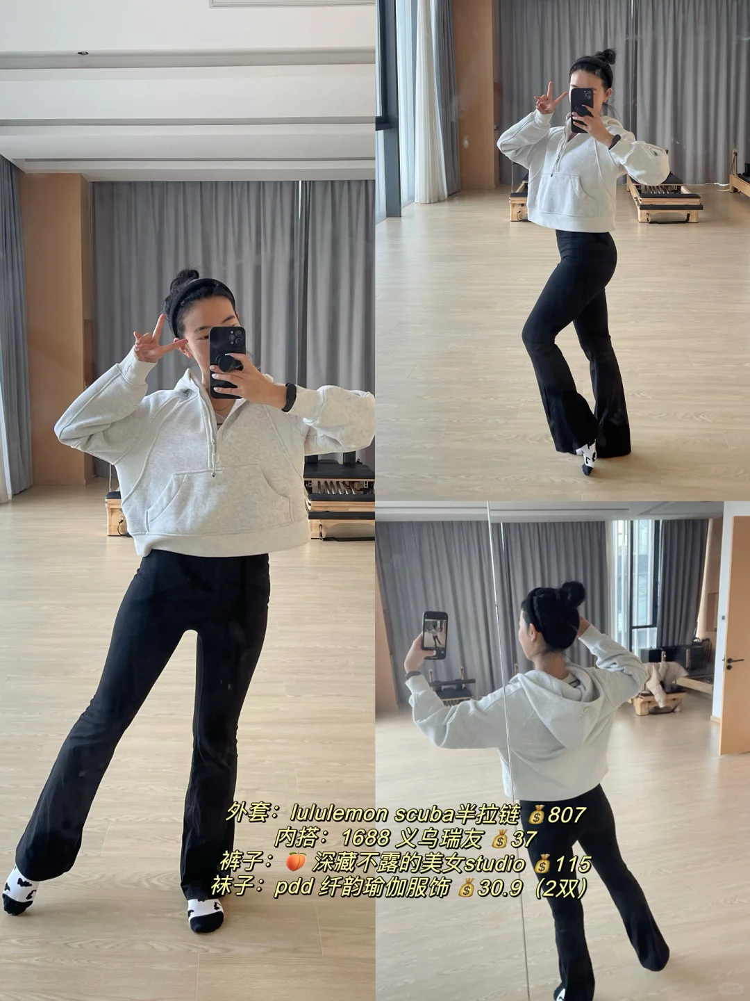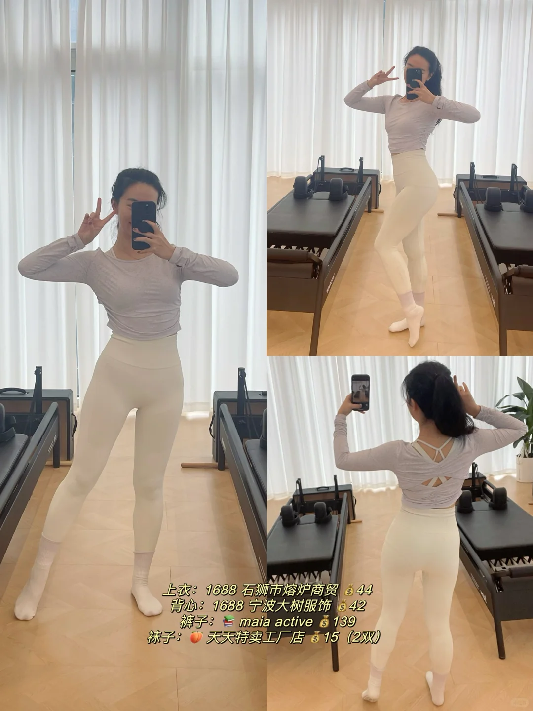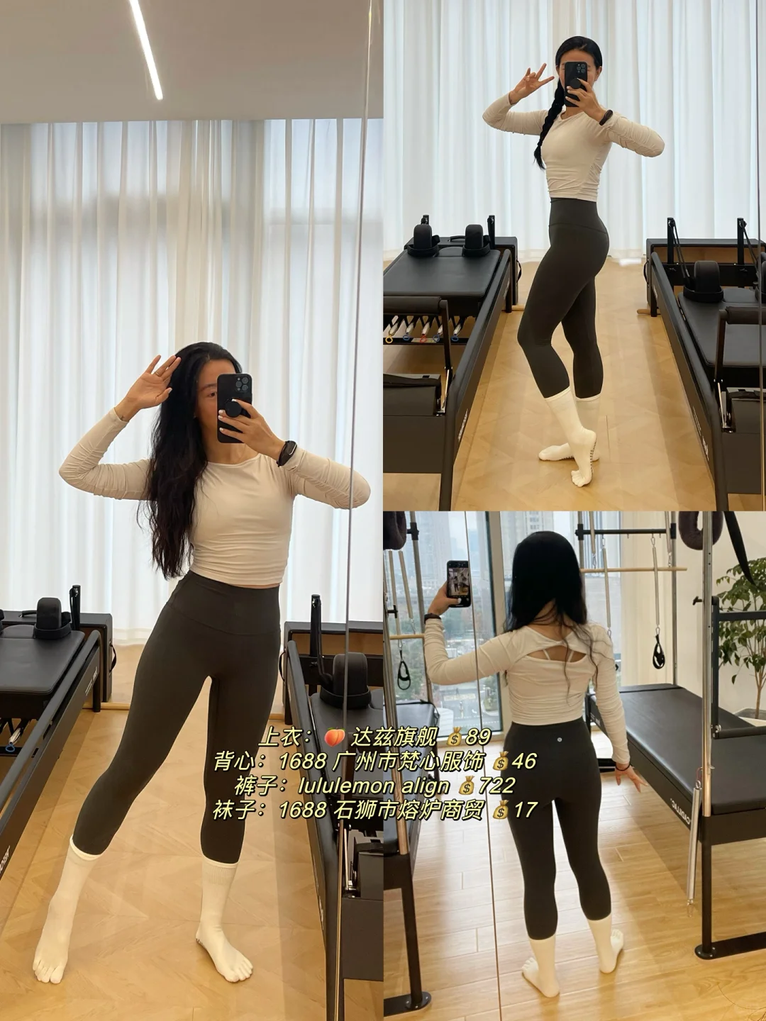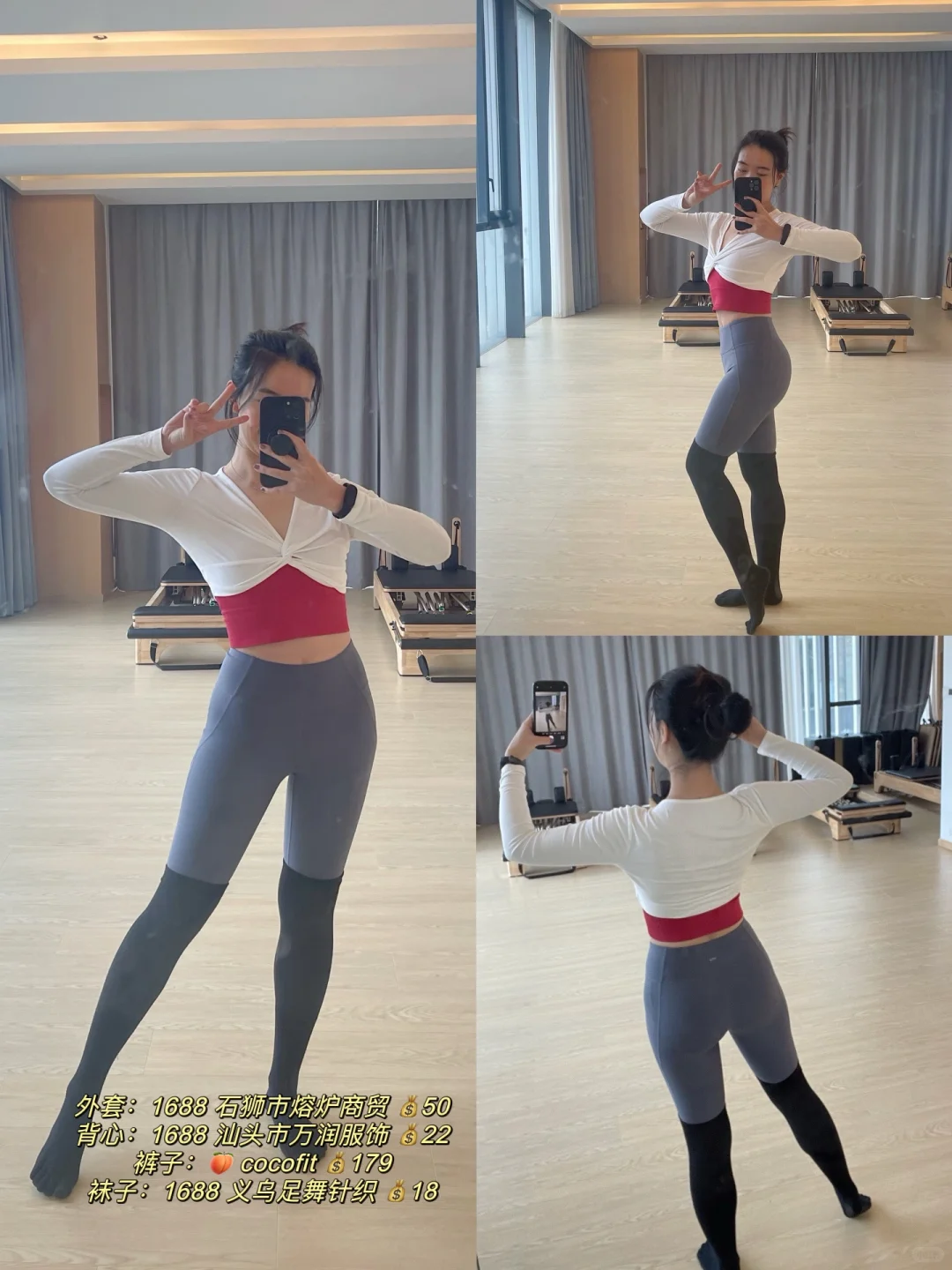 😁前段时间拍了好多ootd,\n一直没时间分享出来~\n \n今天想分享下:\n【冬天练瑜伽&普拉提,\n应该怎么穿~】\n \n作为一名瑜伽&普拉提老师,\n我的冬季穿衣原则是:\n保暖、好看、舒适,\n三者缺一不可~\n \n保暖:\n冬天天气寒冷,\n瑜伽馆如果没有地暖的话,\n垫上或器械上都还是蛮冷的,\n一定要做好足部保暖,\n穿上瑜伽袜,\n还可以需要看看要不要穿袜套~\n \n瑜伽服可以换成长款的上身&夏装,\n也可以里面穿短款背心,\n外面穿上贴身的长款上衣~\n无论如何,\n保暖是我的di一要义~\n \n舒适:\n瑜伽服要贴身,\n方便教练看到你的肌肉发力、\n身体曲线,\n有助于教练帮你调整体式正位,\n在正确的动作下进行练习。\n \n具有包裹性的同时,\n注意也不要过紧过肋,\n影响自然顺畅的呼吸~\n也影响练习时的动作。\n \n选择合适自己的尺码,\n弹力比较好的材质,\n舒适柔软的面料~\n \n好看好看好看!\n好看也是购买和选择瑜伽服的重要因素!\n尽管到了冬天好像窗外一片凋敝,\n但通过彩色系的穿搭,\n好像能让练习的时候更愉悦~\n \n再加上运动本身会分泌多巴胺和内啡肽,\n让你更加愉悦和满足~\n除了黑白灰这种常规不出错的颜色,\n也可以通过彩色系的穿搭,\n让自己成为教室里坠靓的崽!\n \n图片里都附上了穿搭的来源和💰,\n我的原则是:\n只买对的,不执着于贵的\n(而且作为自由瑜伽&普拉提老师,\n收入真的不高啊啊啊,\nlulu这种价位的买几件差不多了😅)\n \n因为每天几乎都是瑜伽穿搭,\n也挖到了很多性价比超高的宝藏店铺 🤪\n \n#瑜伽 #瑜伽日常 #普拉提 #我的普拉提日常 #瑜伽穿搭 #瑜伽服 #瑜伽服推荐 #瑜伽普拉提 #瑜伽服搭配 #瑜伽老师 #瑜伽老师的日常 #瑜伽老师养成记 #瑜伽老师日常穿搭 #普拉提老师 #普拉提教练日常 #我的瑜伽服穿搭