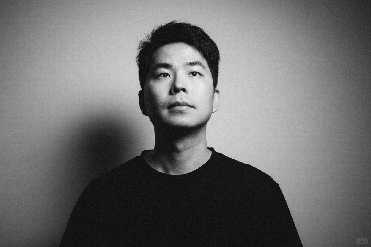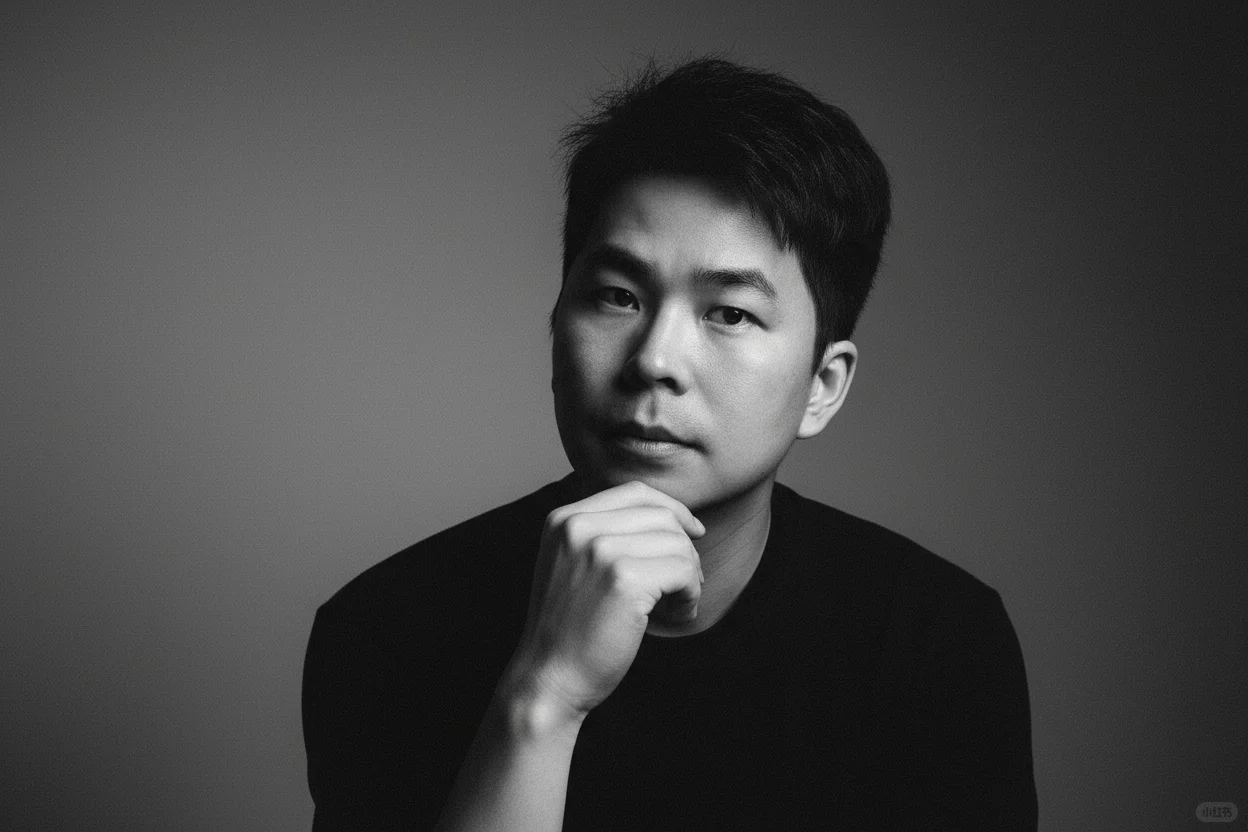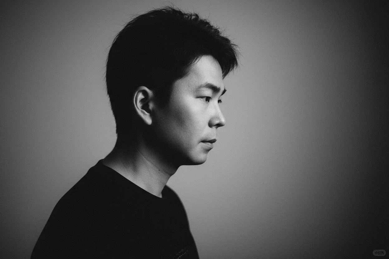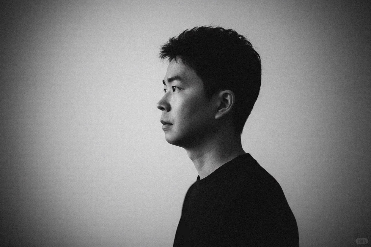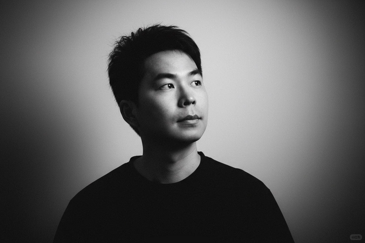 一束温柔的定向光,柔和地漫射开来,轻抚他的面颊曲线,或在眼中闪现光点——这是画面的情感核心。其余部分以大量负空间占据,刻意保持简洁,使画面自由呼吸。画面中没有文字、没有标志——只有光影与情绪交织。