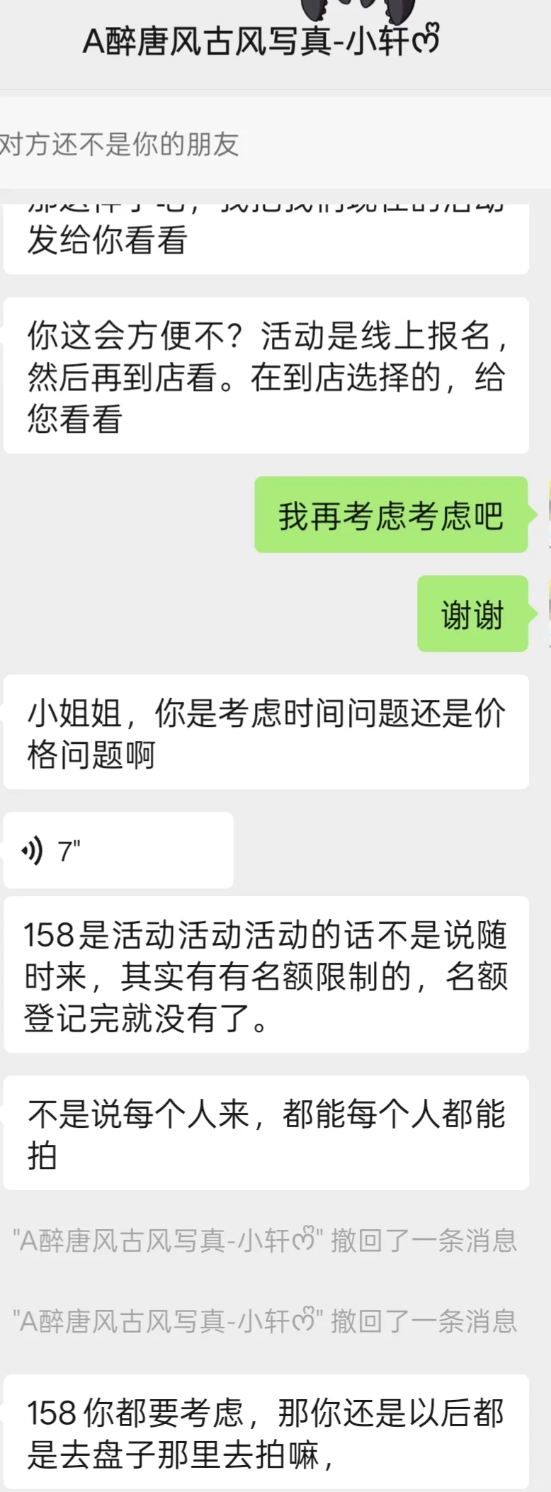 实际情况可以看别人反映,我这个卡在客服环节……这个客户组的小哥一直不说这个158的衣服和妆造底片情况,同时发别的高级妆造诱惑我(惯用的手法),我就直接问那些高级妆造的价格,他一直要我去线下谈(方便现场pua),有什么不能线上谈,问就是他们的服装都是原创
