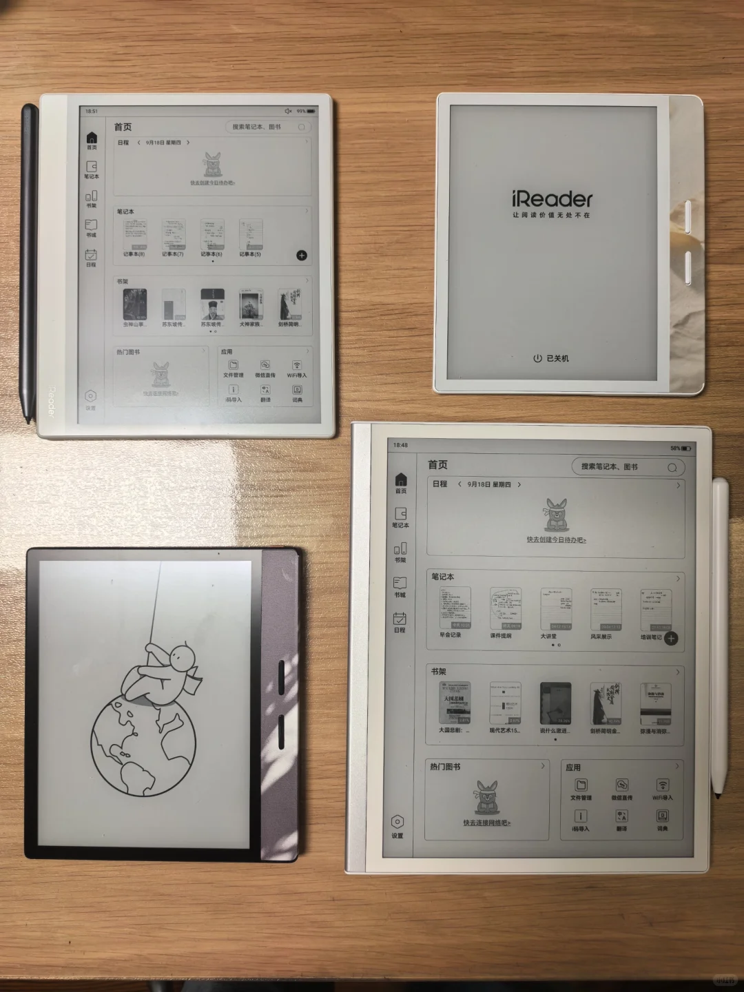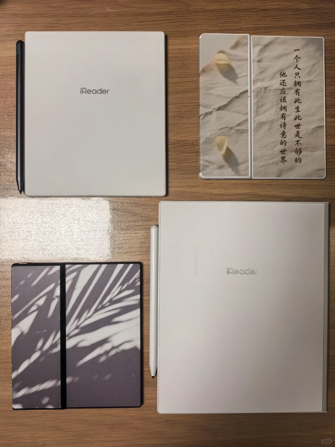 用过很多电子书,文石功能确实确实强大,汉王手写确实舒服,墨案小屏确实实惠。。。\n \n但没办法,最爱的,始终是掌阅。\n \n从塞班时代的一个读书应用开始,掌阅那由三本书组成的logo就已深入我心。\n \n那是真正对读书需求的一种理解。\n \n所以尽管近几年掌阅也推出了很多开放系统的电子书,但我的4台掌阅,全部是封闭版本。\n \n封闭系统有什么优点?\n \n让你心无旁骛,避开七猫番茄的网文侵扰,认认真真读本好书。\n \n省电,充一次能待机一个月、看书半个月,让电子书回归书的本质而非电子产品。\n \n稳定且节省空间,不用纠结要装什么、能装什么,买它就是用来纯粹地阅读。\n \n这四台掌阅,最大的10.3寸,读写皆能,第二大的那台8寸,也能读写,几乎是最完美的机型,却已停产,仅仅冲着收藏都能入一台。\n \n我喜欢白色,所以这两台都是白色,放在一起,就像孪生姐妹(图3)。\n \n剩下两台则都是7寸,一黑一白,贴了保护膜,装了磁吸套,物理翻页键提供了超乎想象的阅读体验,是我使用频率最高的机器。(图4)\n \n型号分别是ocean3和ocean4长续航版,不带T,带T就是开放系统了。顺便说句,白色那款磁吸套是定制的,写的是我最爱的王小波箴言。\n \n有它们在,我不会孤独。\n#掌阅 #电子书阅读器推荐 #一张图证明你墨水屏爱好者 #一张图证明你墨水屏爱好者