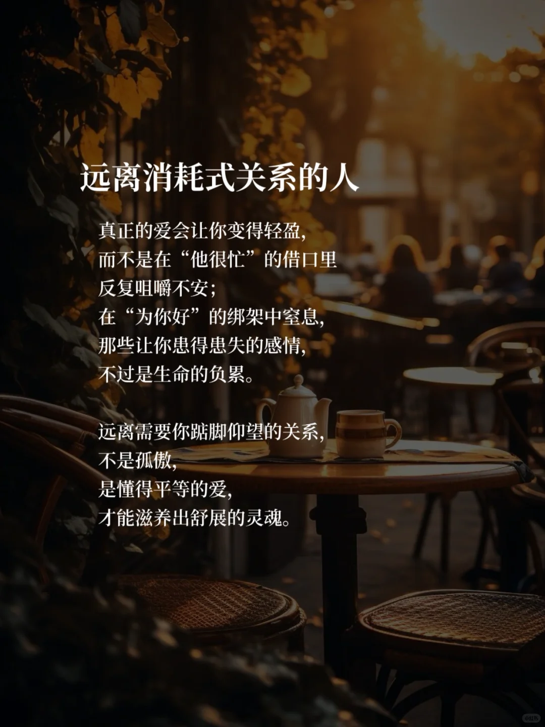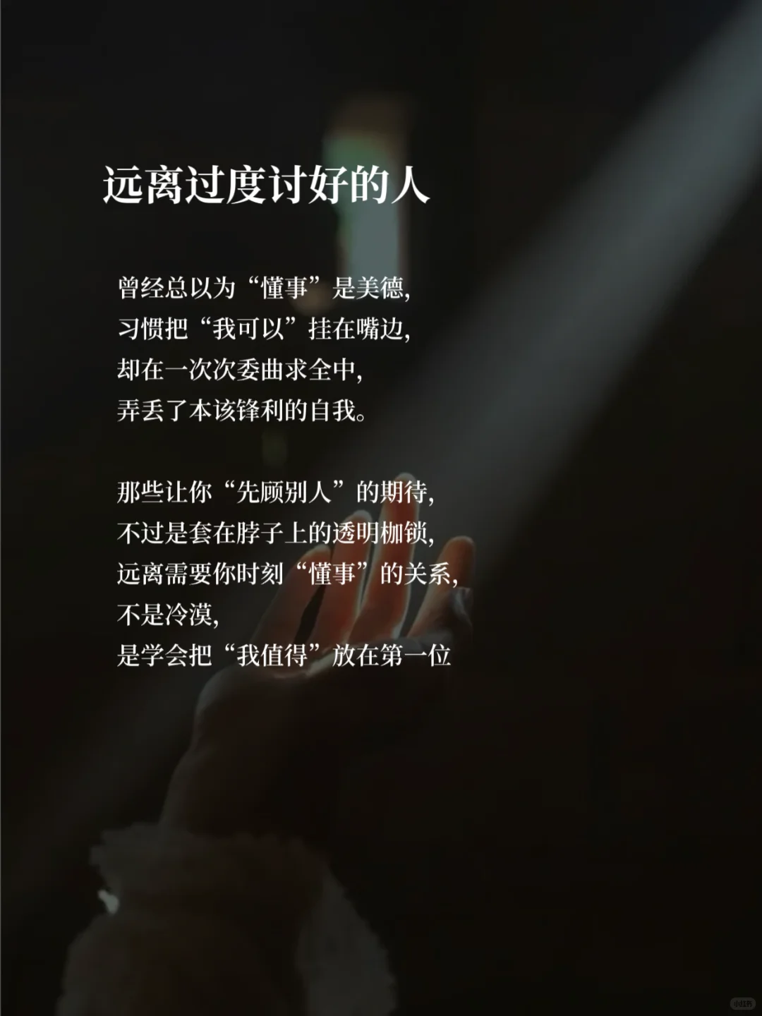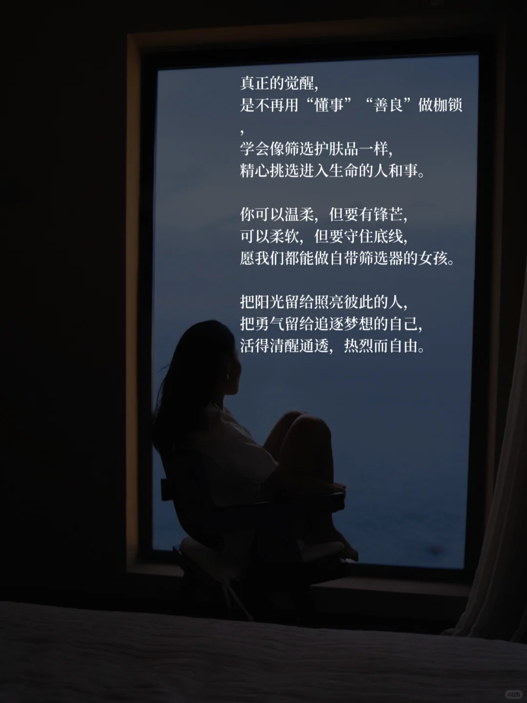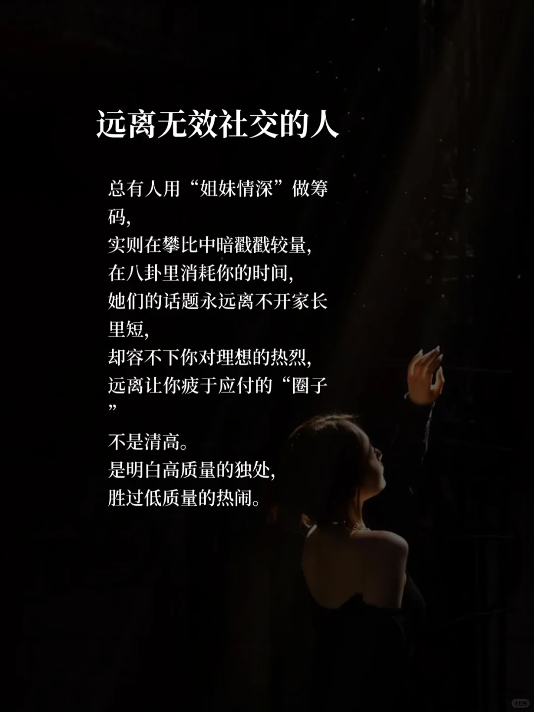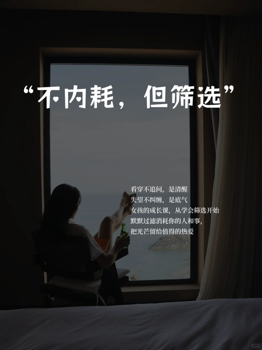 看穿不追问,是清醒;\n失望不纠缠,是底气。\n女孩的成长课,从学会筛选开始,\n默默过滤消耗你的人和事,\n把光芒留给值得的热爱。\n \n🌸远离过度讨好的人\n曾经总以为“懂事”是美德,\n习惯把“我可以”挂在嘴边,\n却在一次次委曲求全中,\n弄丢了本该锋利的自我。\n那些让你“先顾别人”的期待,\n不过是套在脖子上的透明枷锁。\n远离需要你时刻“懂事”的关系,\n不是冷漠,\n是学会把“我值得”放在第一位。\n \n🍃远离无效社交的人\n总有人用“姐妹情深”做筹码,\n实则在攀比中暗戳戳较量,\n在八卦里消耗你的时间,\n她们的话题永远离不开家长里短,\n却容不下你对理想的热烈。\n远离让你疲于应付的“圈子”,\n不是清高,\n是明白高质量的独处,\n胜过低质量的热闹。\n \n🌞远离精神内耗的人\n那些习惯性否定你的声音,\n像蒙在心上的灰色滤镜。\n“你这样肯定不行”“女生最好别折腾”,\n他们用焦虑做诱饵,\n让你在自我怀疑里原地打转。\n远离持续打压你能量的人,\n不是冷血,\n是守护内心那簇,\n本该肆意燃烧的火种。\n \n🌌远离消耗式关系的人\n真正的爱会让你变得轻盈,\n而不是在“他很忙”的借口里,\n反复咀嚼不安。\n在“为你好”的绑架中窒息,\n那些让你患得患失的感情,\n不过是生命的负累。\n远离需要你踮脚仰望的关系,\n不是孤傲,\n是懂得平等的爱,\n才能滋养出舒展的灵魂;\n真正的觉醒,\n是不再用“懂事”“善良”做枷锁,\n学会像筛选护肤品一样,\n精心挑选进入生命的人和事。\n你可以温柔,但要有锋芒;\n可以柔软,但要守住底线。\n \n愿我们都能做自带筛选器的女孩,\n把阳光留给照亮彼此的人;\n把勇气留给追逐梦想的自己,\n活得清醒通透,热烈而自由。\n \n💌 我是专注女性成长的浮生\n📷 谢谢你看到这里\n愿每个女孩都能读懂“自我优先”的勇气\n#女性觉醒 #情绪自由 #自我重塑 #GirlsTalk #拒绝内耗 #清醒自知 #成长治愈系 #做自己的光 #女性力量 #女性成长