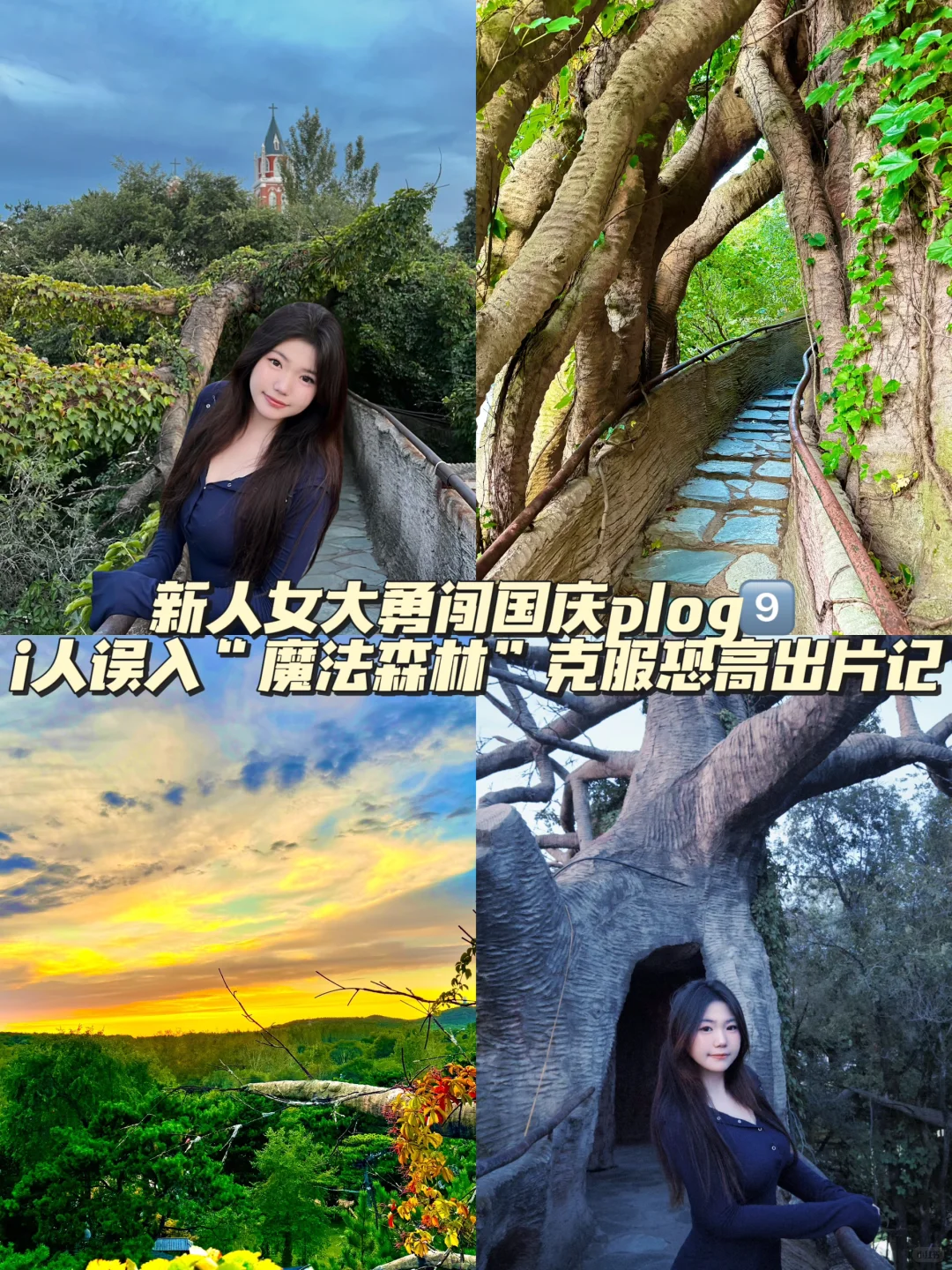 哈喽宝子们!欢迎来到加勒比海带的小频道~作为新人博主第9️⃣天,我直接把国庆旅行玩成了“童话冒险+出片教学”现场,连恐高、社恐i人姐妹都能抄作业的那种!\n \n朋友一见到这棵超大古树就触发巨物恐惧症,在栈道上颤颤巍巍不敢迈步;而我这个“来都来了”的中国女人,只要听到“三二一”的指令,瞬间切换pose一摆谁也不爱📸 我靠着这几招,哪怕恐高心跳加速,也能在“三二一”时秒变镜头宠儿📸 今天把压箱底的“社恐i人出片秘籍”全分享给你们,看完直接变身氛围美女!\n \n🔥【古树秘境打卡&出片保姆级攻略】\n \n• 机位选择:\n① 栈道中段俯拍,利用古树盘根错节的线条营造“闯入森林”的纵深感\n② 树洞入口处侧身站立,让树洞框住自己,童话感直接拉满\n③ 日落时分找开阔草地,以古树为背景拍剪影,橘子海天空当天然滤镜\n \n• 姿势万能公式:\n✅ 手扶栏杆看远方(假装欣赏风景,避免直面镜头的尴尬)\n✅ 慢走抓拍(动作自然不僵硬,还能营造动态感)\n✅ 利用道具(比如头发、衣角,轻轻拨动增加画面层次)\n \n• 避坑Tips:\n别选正午顶光拍摄,下午4-6点的柔和光线最出片;栈道较窄,错峰打卡更能从容摆拍哦~\n \n谁懂啊!钻进古树树洞的瞬间,真的像被施了魔法穿越进童话森林!抬头是缠绕的藤蔓和透过枝叶的碎金阳光,傍晚日落更是把天空烤成了橘子海,从暖黄到粉紫的渐变,这趟“现实版童话”之旅,我不允许你们错过✨\n \n我是你们的养成系博主小海带~新人博主们速来评论区互动抱团!下一期…我赌十包辣条,你们绝对猜不到我又挖到了什么人少景美的神仙打卡地!\n \n(宝子们快把你们的拍照困扰丢在评论区,我来帮你们一一破解!)\n#新人博主冲鸭 #女大学生plog #国庆旅行天花板 #古树秘境 #童话风旅行#plog博主养成记 #自然治愈系 #追日落狂魔 #巨物景观打卡 #拍照姿势教学 #养成系博主 #国庆小众秘境 #旅行plog天花板 #流量密码 #小红书爆款 #大学生旅行 #小众旅行地 #打卡拍照 #小红书成长笔记 #城市漫游计划 #治愈系风景 #我的旅行日记#拍照教程 #打卡地攻略\n@小红书成长助手 @小红书创作学院 creator academy @小红书成长笔记 @小红书体验站 @走走薯 @城市情报官@城市情报官@生活薯