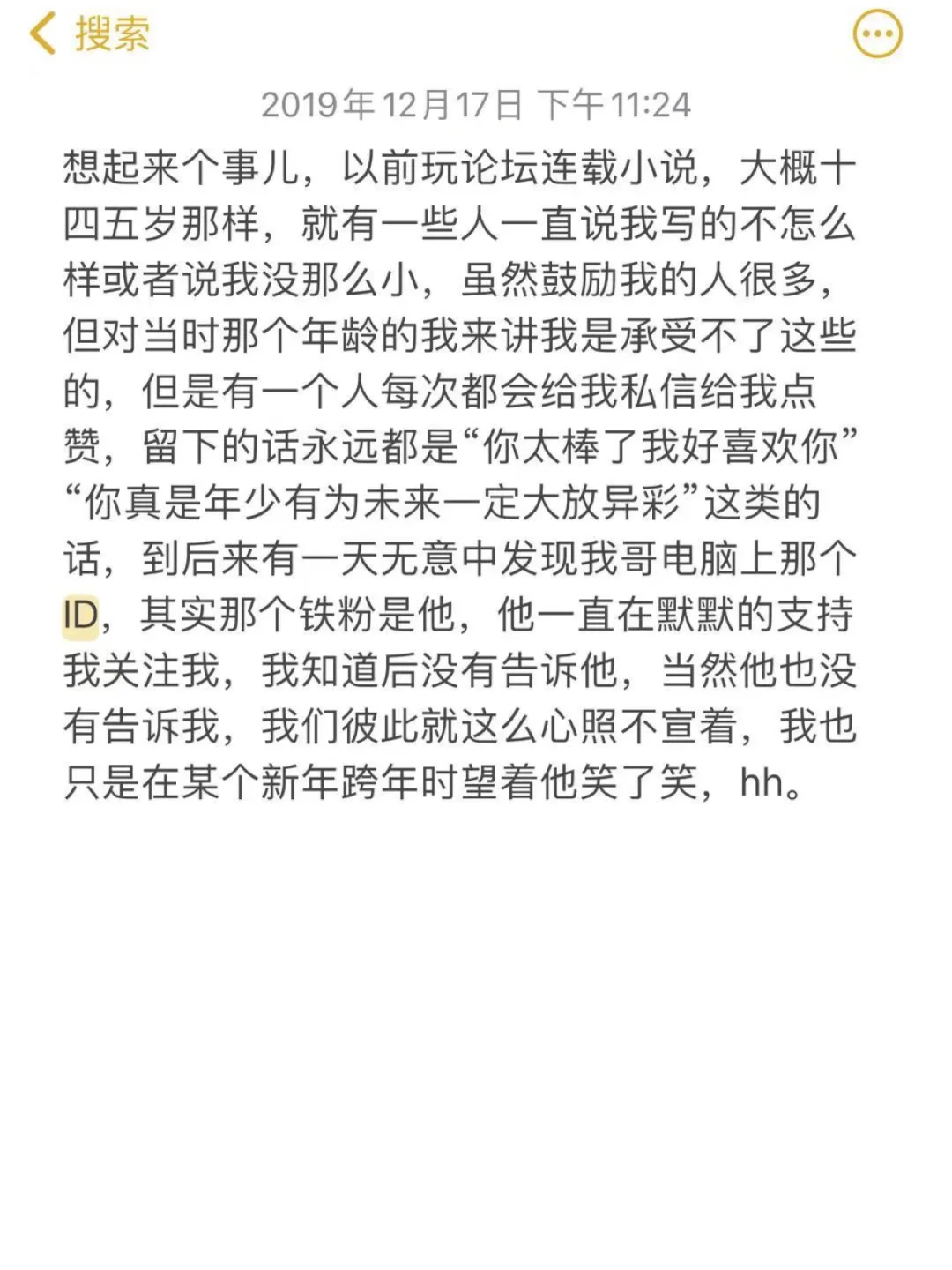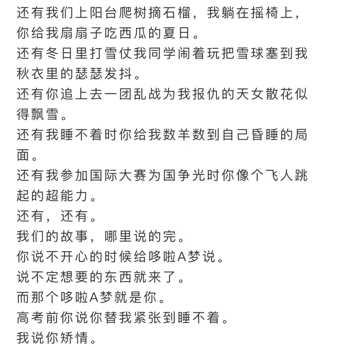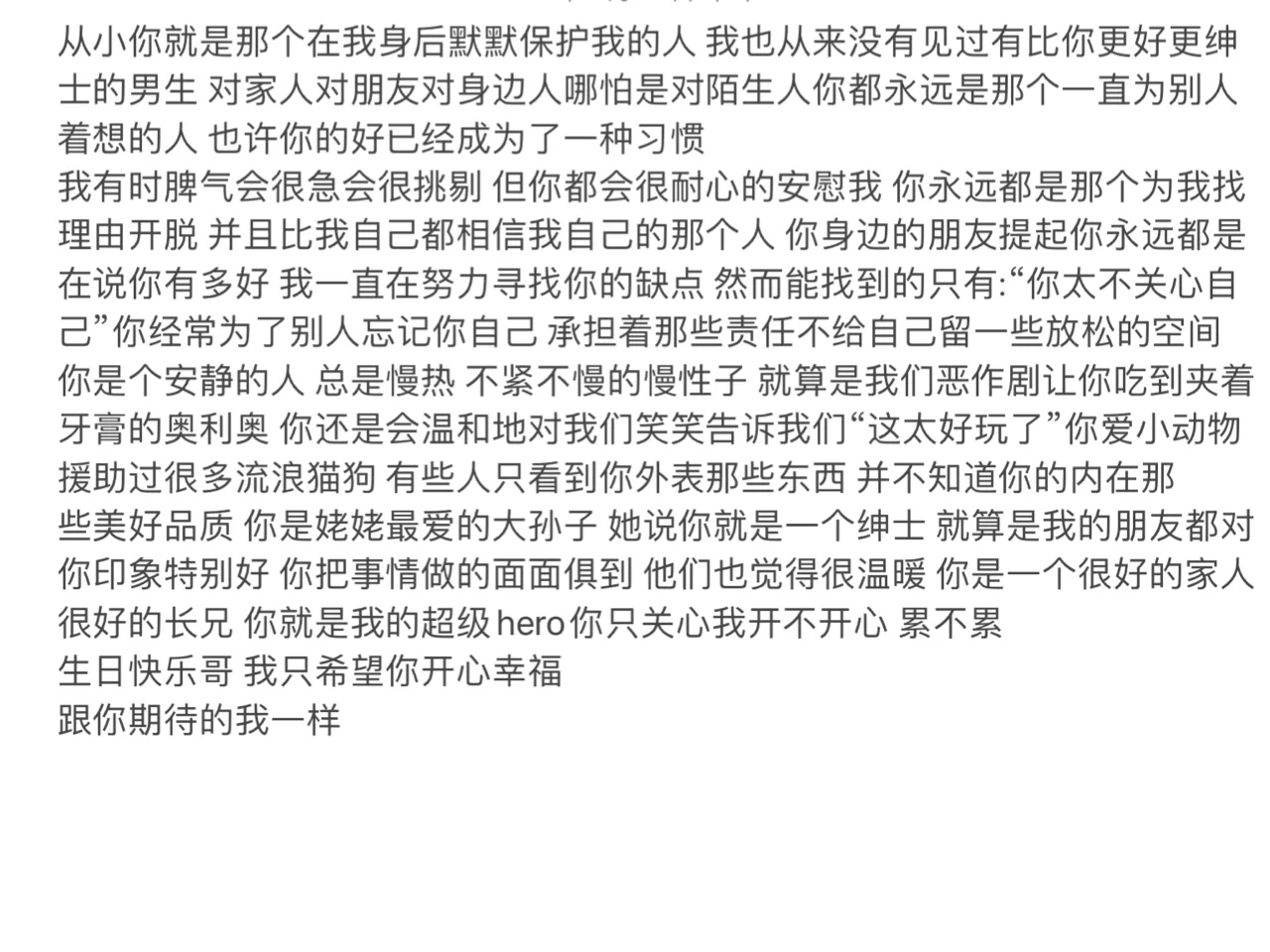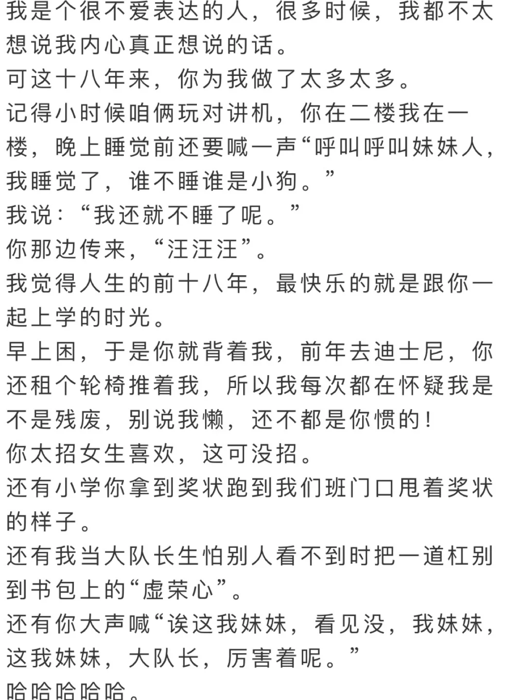 居然看到我哥发的帖引起这么大的关注哈哈哈\n关于我哥有多好 我都是听别人讲给我的 因为他是我哥 也习惯了 他比我细腻很多 脾气比我好太多太多 小时候一直觉得他也就那样?别人说他帅说他优秀 我说还好吧反正没我厉害哈哈哈哈哈哈 他第一次在我心里开始有形象就是从我写文章开始的 那时我感觉我心灵都被震撼了……现在想想也好感动🥲\n他很自律 在家时每天都会早上六点起床跑步健身 给家里做早饭 自己看书弹钢琴 记得有次打开手机通讯录 他自己拿我手机改成“全世界对我最好的哥哥” 嘴上说他干嘛乱改其实我心里很感动 有次在外面我过敏不舒服吐的哪里都是 他什么都没说就拿纸帮我擦 之后跑去买水给我 出车祸时打石膏 他在上面给我画小熊 怕我不开心就每天想办法逗我 我们爬山到山顶 他大吼“希望妹妹天天开心啊”还有好多好多说不完的回忆\n如果问我最骄傲的事是什么 那一定是我有他这个哥哥 朋友都知道我有一个对我很好很好的哥哥 而他的朋友都知道他最疼我 我决定了 以后不气他不吼他了 我身在福中不知福\n让我们一起为他点首歌 “听我说 谢谢你 因为有你 温暖了四季” 对我来说 他真的温暖了我的四季🥰