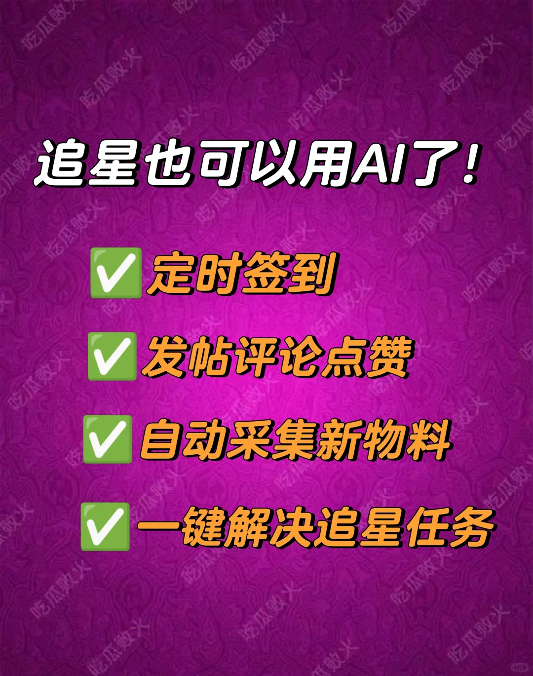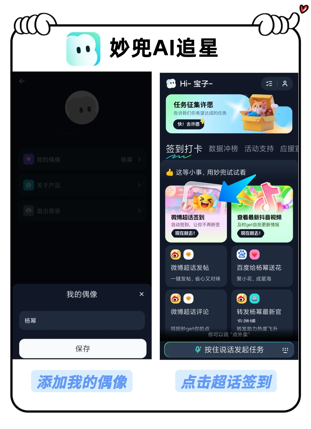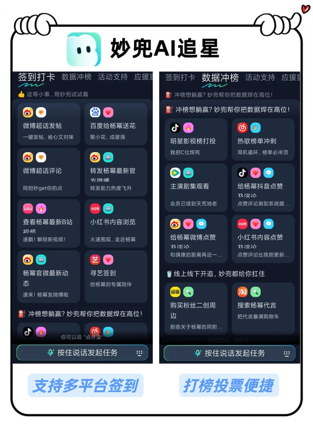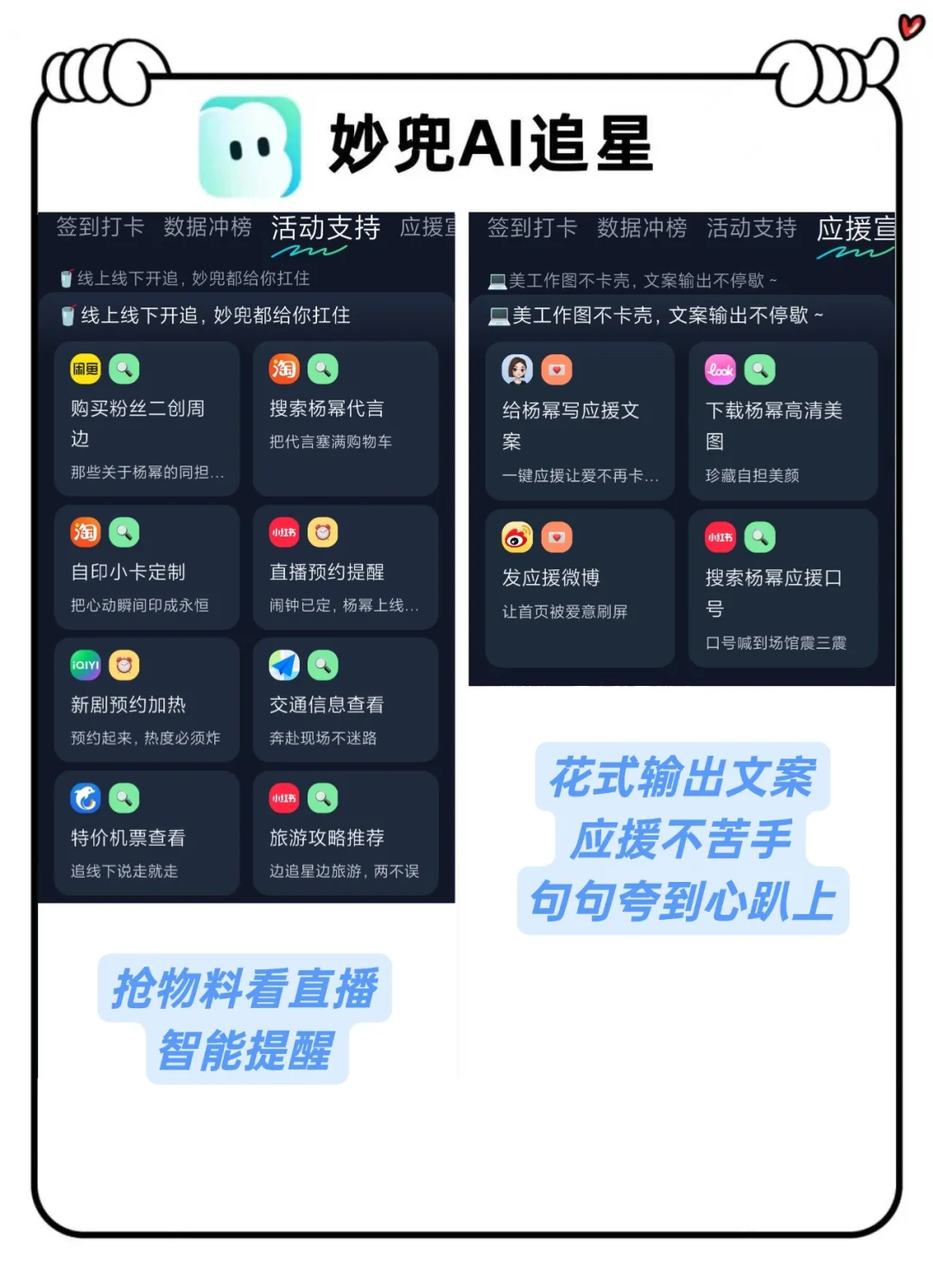 🌸姐妹们!有没有为了爱豆的超话签到定闹钟?(超话断签的崩溃只有追星er能懂!)\n📊是不是每天为数据🚿榜、发帖评论、空瓶反黑累到想躺平,但一看到爱豆的新动态又瞬间满血复活!\n💡别焦虑,咱们追星界也可以用上黑科技了--妙兜APP!只需要下一句指令,就能拯救所有烦恼,追星更简单!👏👏\n📍妙兜使用起来也很简单,输入偶像名字后,我担社交媒体更新、新作品动态等都可以实时推送,妙兜会聚合平台信息。\n📊另外它还能做其他应援任务,只需要给出指令,就能快速完成签到与互动,转发我担最新🧣,评论点赞,查看🎶最新视频,一键预约我担直播、新剧!还能为偶像写应援文案发🧣!我终于不用再疯狂切换APP了,妙兜全搞定!🎉🎉\n#妙兜AI#追星女孩必备APP#追星干货 #追星的意义#追星生活 #宝藏软件