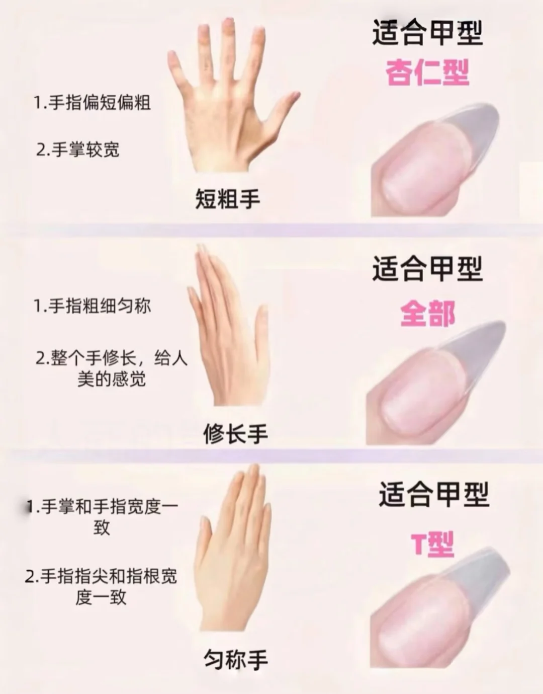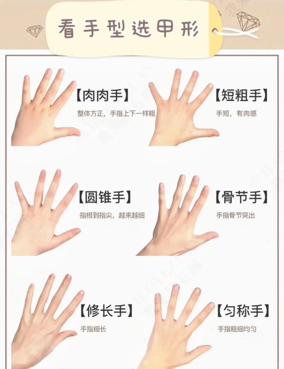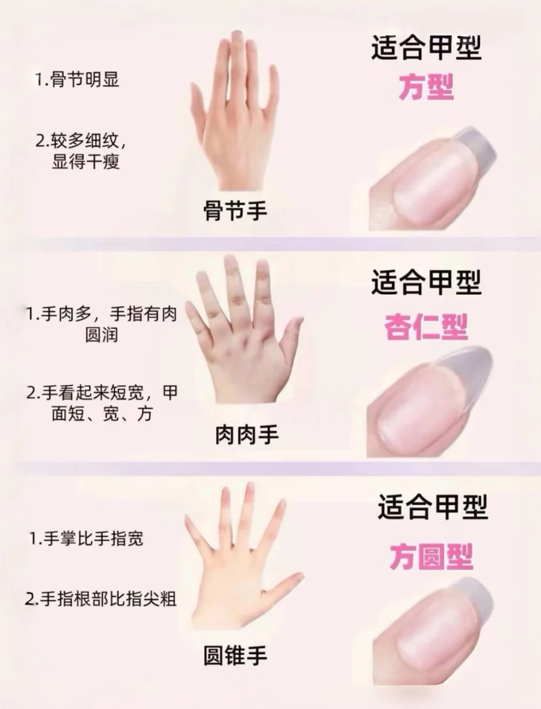 救命🆘我好像发现了女生好看美甲的密码\n#美甲甲型\n美甲甲型选不对!\n款式再美也没用\n3秒选出最适合你的甲型\n公主请看❗❗❗\n1⃣️短粗手\n手指上下一样粗,显得比较方正可爱,手掌比较肉嘟嘟,那么椭圆形甲是最适合的\n2⃣️娃娃手\n手指短,整体有圆润肉感,整个手形偏方。适合圆形甲\n3⃣️骨节手\n手指关节处突出,比较有棱角适合方形、梯形甲片,柔和手部线条\n4⃣️尖锥手\n般手掌比手指部分宽厚许多,手指从上往下越来越细,适合的甲型是方圆形\n5⃣️纤长手\n梦中情手,什么甲型都适合\n当然了,只是建议不同手型有不同适合的美甲甲型,其实公主们想做什么美甲款就做什么款!自信公主是最美哒#帮我选美甲 #新手美甲 #学美甲 #甲型选择指南 #甲型选择攻略 #美甲教学