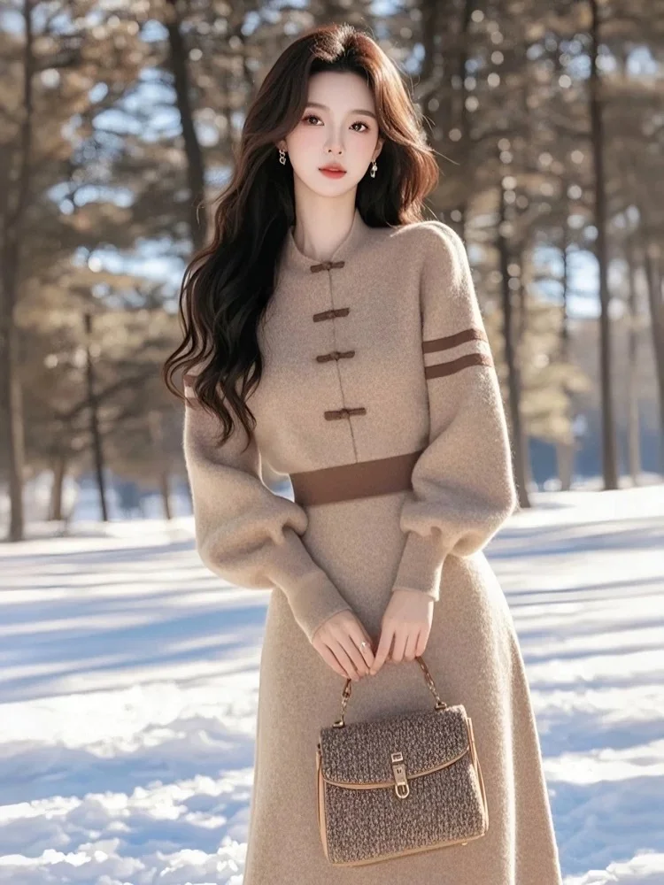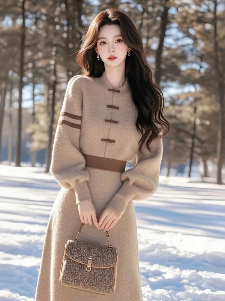 宝子们,又被我挖到宝啦!这件新中式毛衣裙必须分享给你们~\n❶ 整体是温柔的卡其色调,高级又显气质,在冬日暖阳下,氛围感直接拉满。盘扣的设计太有中式韵味了,精致又独特,满满的复古风情。\n❷ 袖口和腰间的棕色条纹,增添了细节感,打破纯色的单调,还能修饰身材比例。泡泡袖的款式,俏皮可爱,还能很好地遮住拜拜肉。\n❸ 毛衣裙的长度也很合适,刚好到小腿,走路带风,优雅又大气。面料超级柔软,贴身穿很舒服,保暖性也不错,在雪地里拍照也不怕冷啦~\n❹ 搭配一个同色系的小方包,质感满满,整体造型更精致。无论是日常出街还是参加聚会,穿上它都能美美的,回头率超高!\n❺ 喜欢新中式风格的宝子千万别错过,赶紧冲!\n#新中式穿搭 #秋冬毛衣裙 #氛围感穿搭 #时尚单品