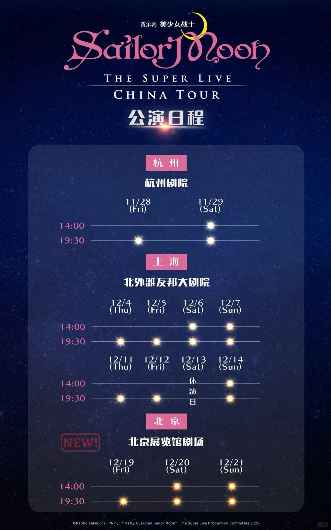 一听到《美少女战士》DNA就动了是吧?\n不仅是童年回忆!\n美少女战士可能还是我们的时尚穿搭启蒙!\n.\n原作者武内直子老师审美高级,擅长把高级时装的设计融入到自己的画作里,为美战创造了经典的水手服+超短裙+高跟鞋的搭配,以及许多各有特色的日常服,甚至各位少女们的发型,妆容,配饰,放到现在都不过时。\n.\n因为拥有了超高的时尚嗅觉,美战和时尚高奢品牌的联名可以说是强强联合,各种时尚单品层出不穷。\n.\n而这一次!给你个机会即刻拥有美少女战士的限定周边!\n.\n美少女战士 the super live即将年末开启中巡,杭州上海北京三地连演,首轮只开了杭州和上海部分场次,而二开将有上海剩余场次(12.11—14日)和北京全场(12.19—21日),10.15日两城同开!\n10:19优先go开启,可以提前一小时开抢,看到很多姐妹也都是丝滑买到的。11:19则是全网可买!\n.\n重点来了‼️ 怎么获取周边!!!\n.\nSS席位:方形写真用于收藏+帆布包日常就能背+专属贵宾牌,感觉这次的随票周边还是很惊喜的\nS席:方形写真+帆布包\n \n有人在纠结这两个位置怎么选择!如果你有很喜欢的演员,想参与击掌会,ss席位就是蕞优选\n没有很想近距离贴贴的,可以选s席的过道,毕竟过道位置也是有可能有饭撒的!\n \n首图来源于明思哲(侵删)\n \n#美少女战士#SailorMoonSuperLive#美少女战士音乐剧#音乐剧美少女战士SailorMoon#音乐剧美少女战士#美少女战士国内巡演#音乐剧#北京演出#上海演出#二次元#漫改#杭州演出