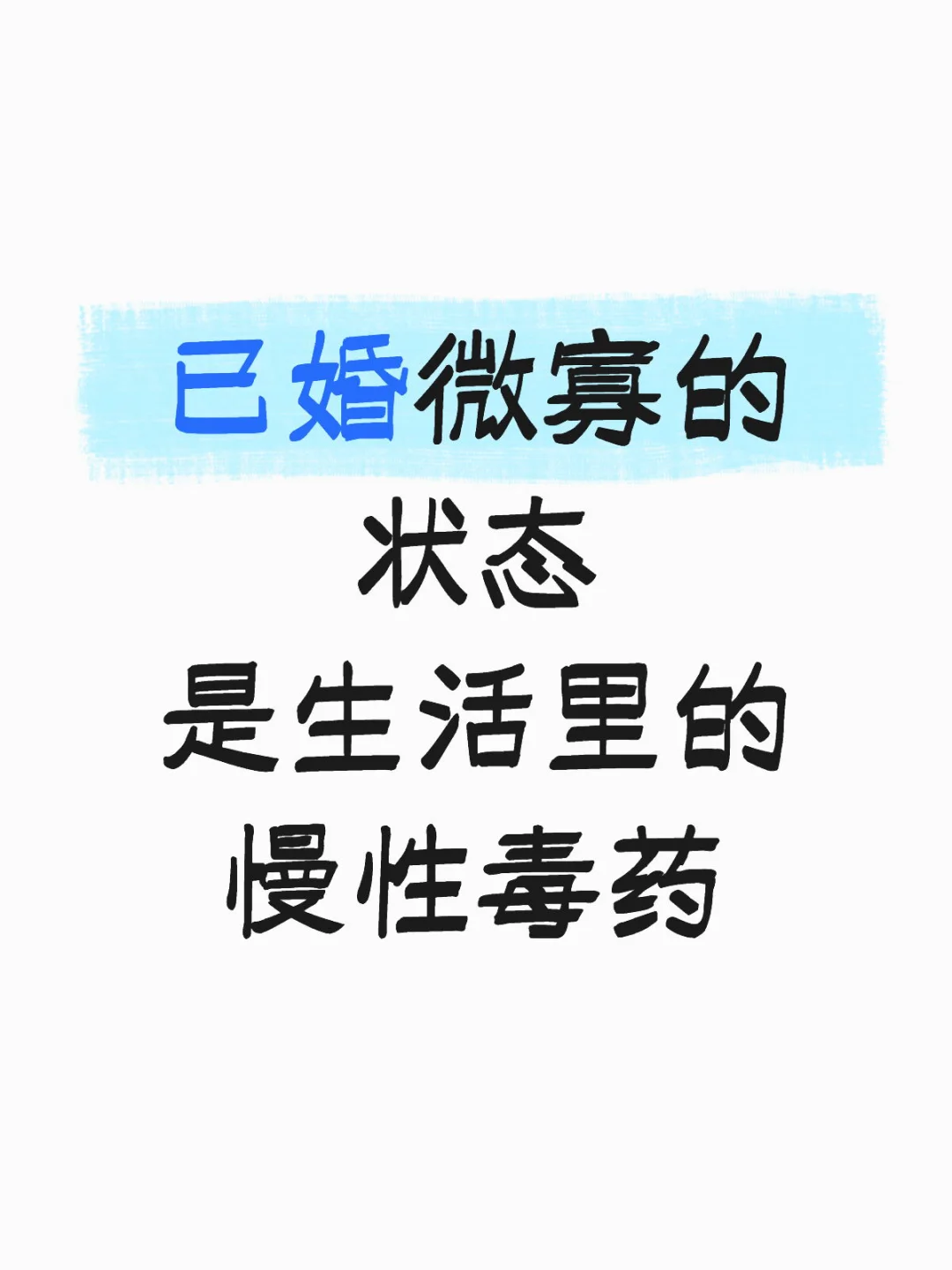 “已婚微寡”这个词,精准地描绘出一种在婚姻中普遍存在却又难以言说的状态——物理上已婚,情感上守寡。\n它具体表现为:\n· 同住一个屋檐下,却活得像室友:没有深度的交流,只有事务性的对话(“水电费交了吗?”“孩子接了吗?”)。\n为什么说它是“慢性毒药”?\n因为它伤害的方式是隐匿且全面的:\n1. 对自我的绞杀:长期的情感忽视会让你开始自我怀疑——“是我不够好吗?”“是我的需求太多了吗?” 你会逐渐失去自我价值感,变得卑微、焦虑或不自信。\n2. 情绪的腐化:被压抑的情感(孤独、愤怒、委屈)不会消失,它们会转化为隐性攻击、身体疾病(如失眠、头痛、肠胃问题)或深度的抑郁。\n3. 生命力的枯竭:婚姻本应是滋养彼此的港湾,但“已婚微寡”的状态却成为一个不断抽取你能量和希望的黑洞,让你对生活和工作都失去热情。\n4. 为孩子塑造扭曲的关系模板:孩子在这种冰冷、无连接的家庭氛围中长大,会潜意识认为“婚姻就是这样的”,从而影响他们未来建立健康亲密关系的能力。\n \n如何解毒?\n第一步:停止自我欺骗,承认现状\n· 不要再为对方找借口(“他只是工作忙”、“他性格就这样”),也不要再粉饰太平(“至少孩子有个完整的家”)。\n第二步:从“指责”模式转向“自我关怀”与“自我建设”\n· 把能量收回到自己身上:停止期待对方来填补你的情感空洞。去做能让你自己快乐和充实的事:发展爱好、投入工作、经营自己的社交圈。\n第三步:发起一次“真诚而高风险”的沟通\n· ✅ 真诚:“我感到非常孤独,特别是在我需要分享和倾诉的时候,我们之间好像隔着一堵墙。我渴望我们能重新连接,像以前一样说说话。这是我非常看重的。”\n第四步:根据对方的反应,做出清醒的选择\n· 选择一:带着清醒的认知留下。不再抱有幻想,彻底放弃从对方身上获取情感支持。将婚姻视为一个合作养娃、分担经济的共同体,同时全力以赴地在婚姻之外构建自己丰富、饱满的人生。这需要极其强大的内心,但至少你不再内耗。\n· 选择二:勇敢地离开。当一段关系的核心已经死亡,离开不是失败,而是对自己的生命负责,是去追寻重新获得爱与连接的可能性。\n“已婚微寡”的状态,是对生命的一种缓慢凌迟。它所剥夺的,是你体验爱与活力的基本权利。\n是选择在寂静中慢慢枯萎,还是选择勇敢地打破沉寂,哪怕会伴随暂时的剧痛,去争取一个重新呼吸、重新活过来的机会——这取决于你对自己有多珍视。