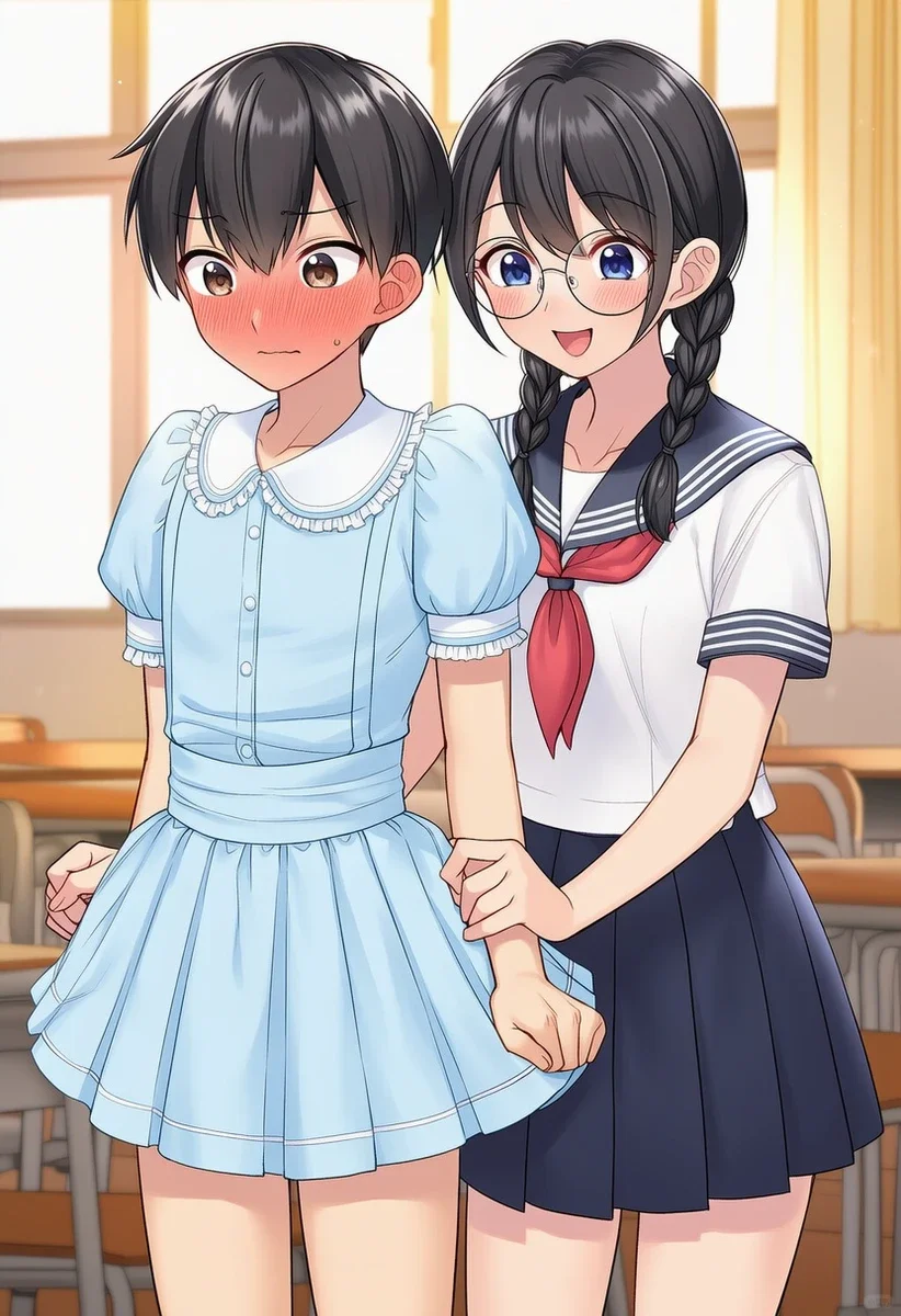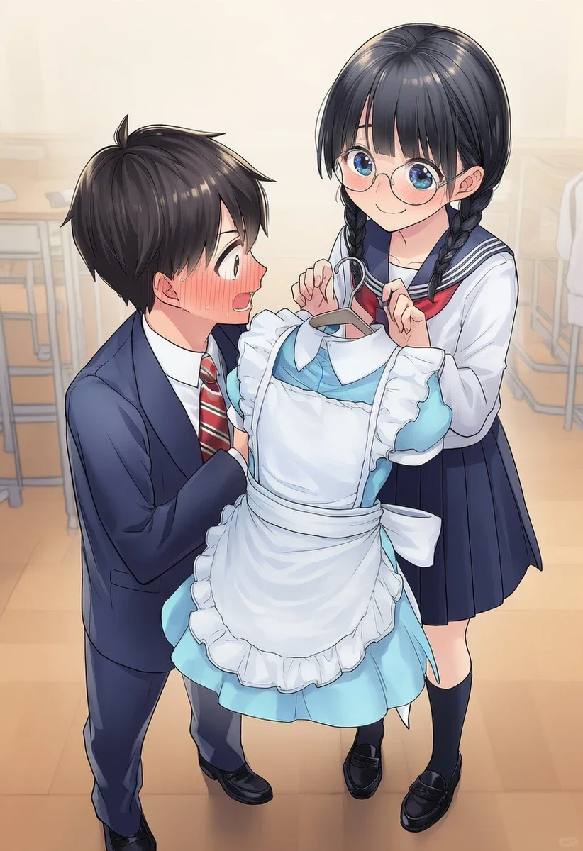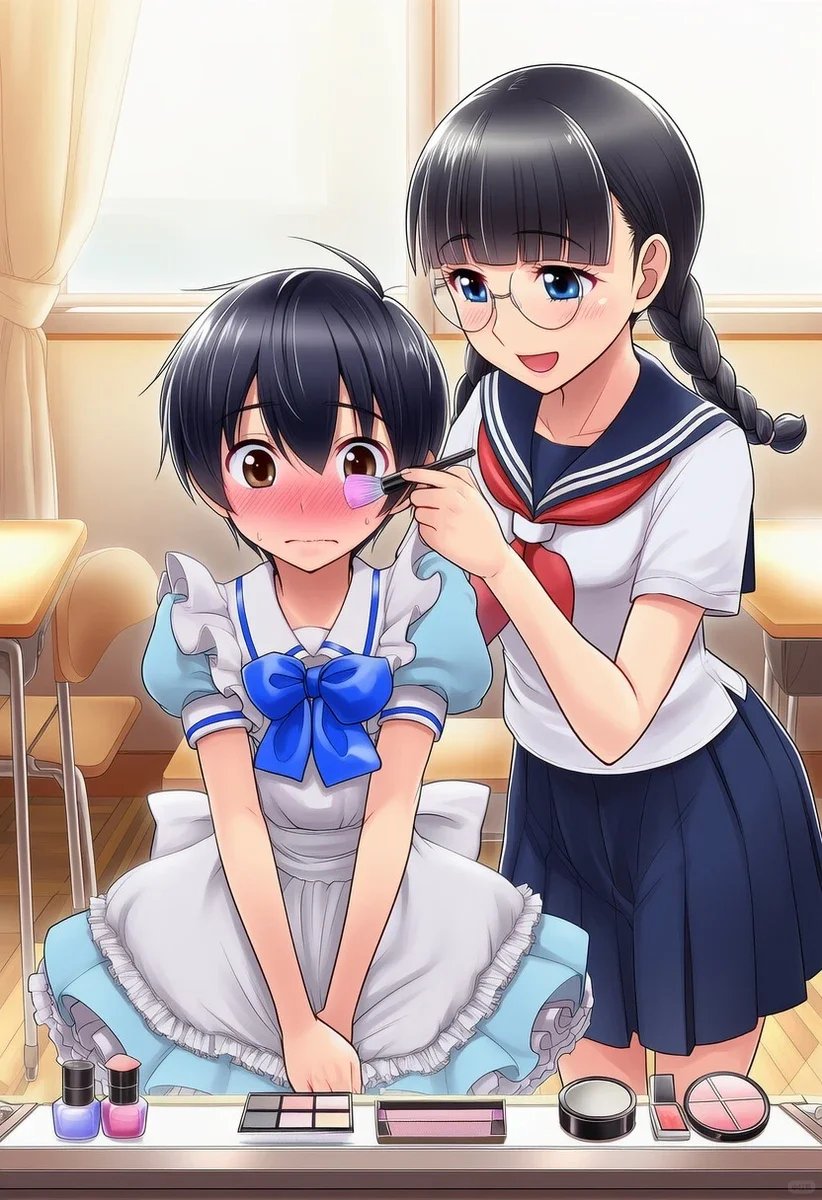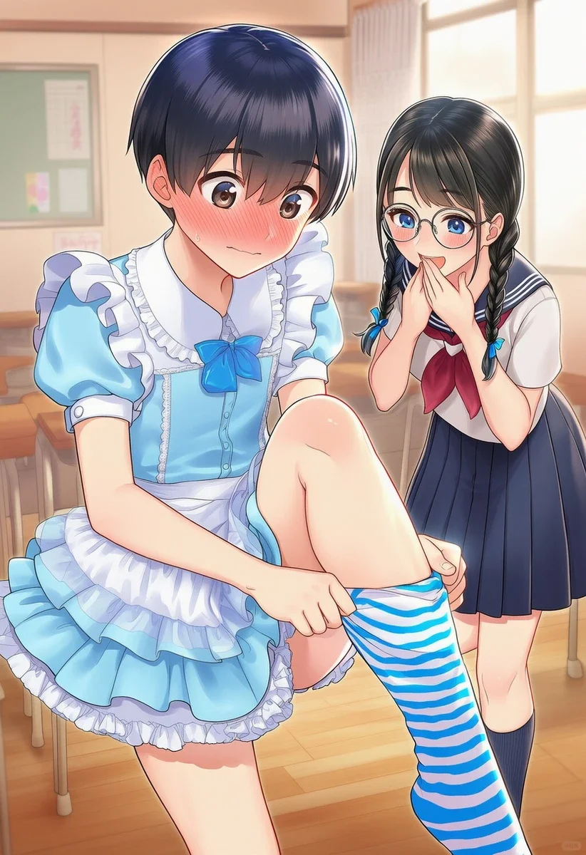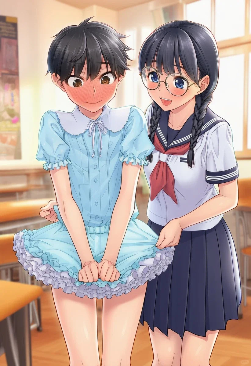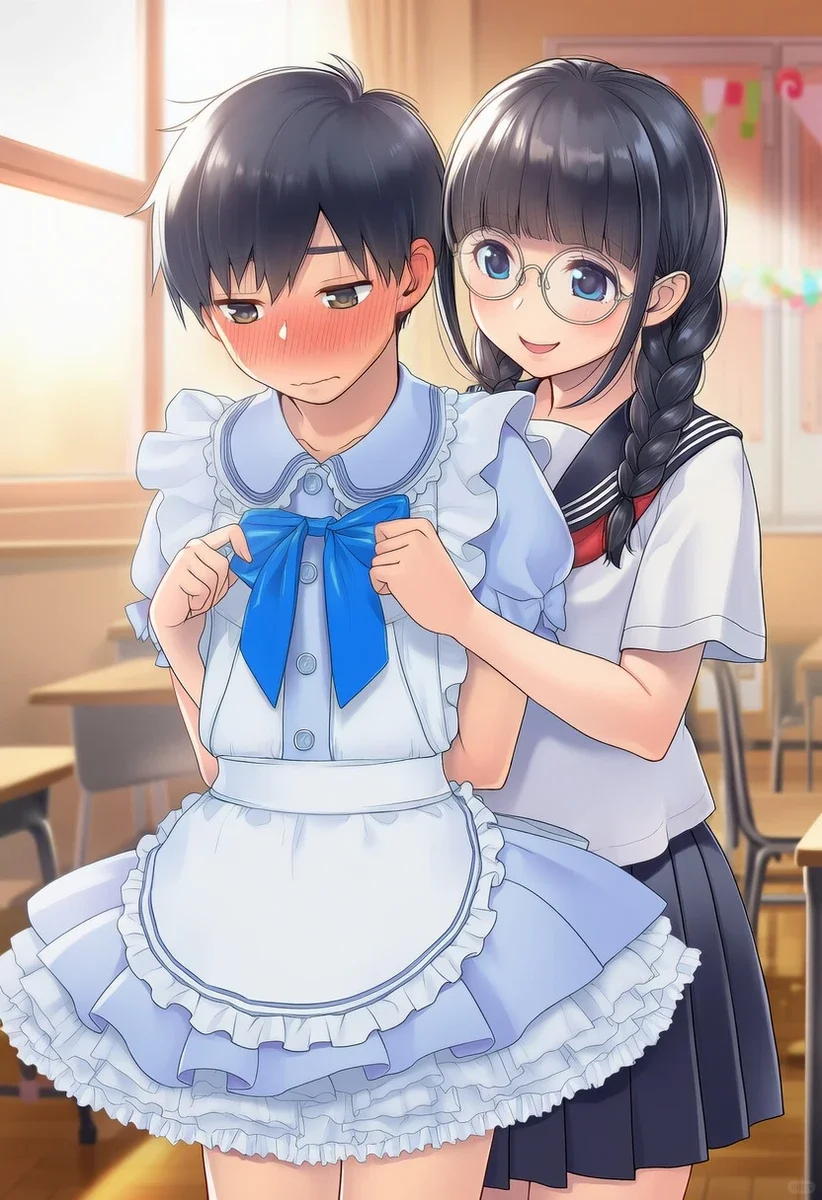 “这套衣服很适合你。”班上的女生将女仆装展示给我看。\n“好了,不要扭捏了,快换衣服吧。”\n“不用了,我自己来。”学园祭被选中当女仆,自知跑不了,我只能认命。\n“乖乖别动,男生不知道怎么穿女装,还是我帮你吧,嘿嘿嘿。”说着班长温柔的帮我换衣服。\n“那么把这里垫上吧。”\n“呜呜,男生穿这个太羞耻了。”\n“穿好衬衫,还有裙子,里面也换上,戴上围裙,系好蝴蝶结,再稍微画个妆,然后带上假发扎个双马尾,一个新鲜的美少女就出炉了。”\n“好了,快去给大家看看吧。”\n“救命啊,我好想找个地缝钻进去。”我穿着女装站在同学面前,羞耻的浑身颤抖。\n“太好看了,我要发到校报上。”\n“嗯,学校的橱窗就放这张照片。”\n“快比个心,然后大喊萌萌甜甜圈。”\n“萌...萌...甜甜圈。”\n“太萌了!”\n这是我最难忘的一个学园祭。\n#卡通 #图片 #动画 #穿女装的男人