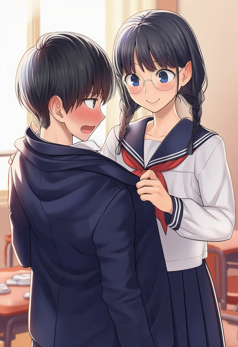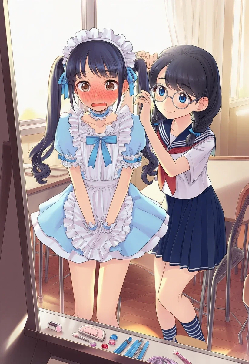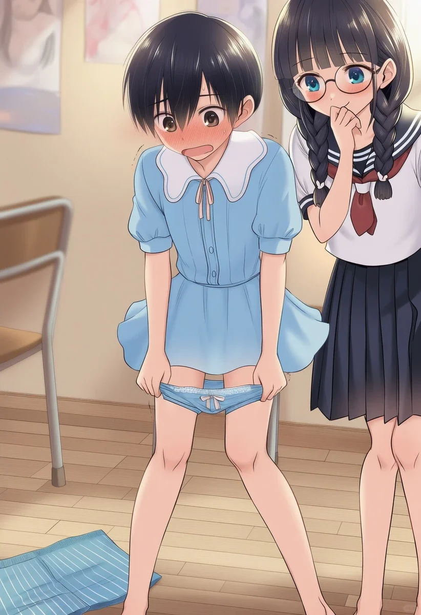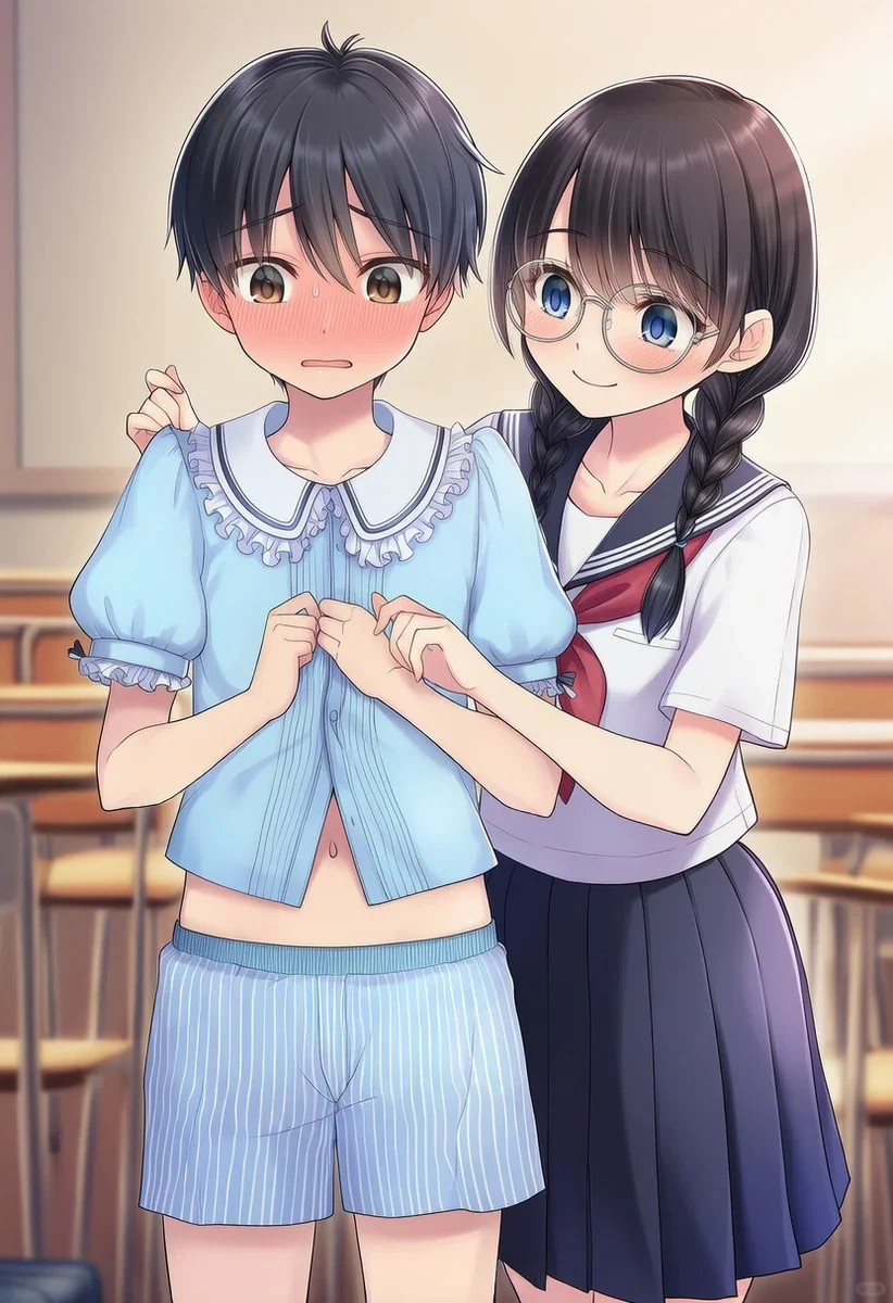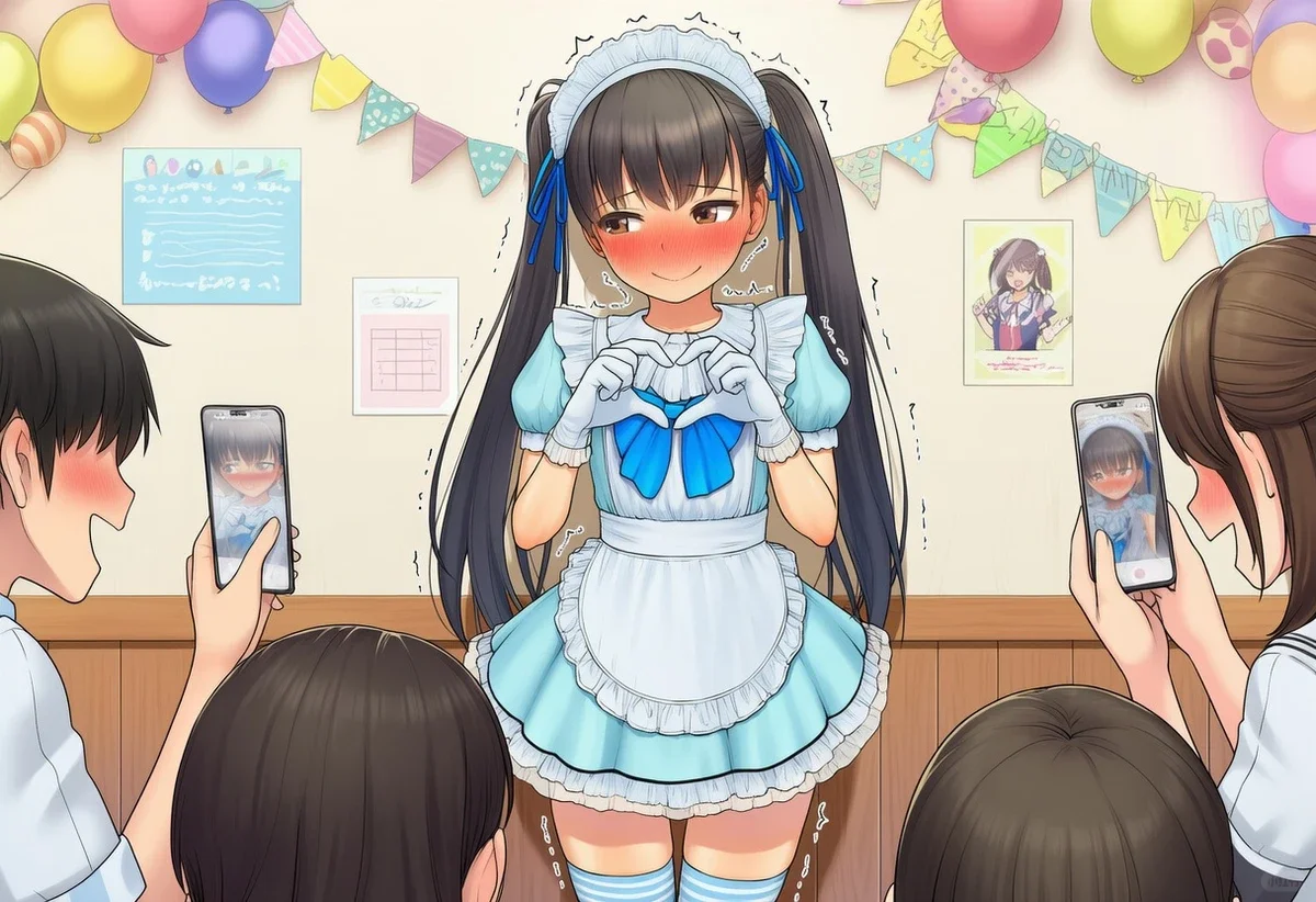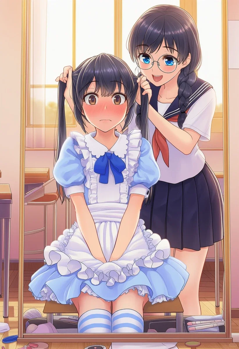 “这套衣服很适合你。”班上的女生将女仆装展示给我看。\n“好了,不要扭捏了,快换衣服吧。”\n“不用了,我自己来。”学园祭被选中当女仆,自知跑不了,我只能认命。\n“乖乖别动,男生不知道怎么穿女装,还是我帮你吧,嘿嘿嘿。”说着班长温柔的帮我换衣服。\n“那么把这里垫上吧。”\n“呜呜,男生穿这个太羞耻了。”\n“穿好衬衫,还有裙子,里面也换上,戴上围裙,系好蝴蝶结,再稍微画个妆,然后带上假发扎个双马尾,一个新鲜的美少女就出炉了。”\n“好了,快去给大家看看吧。”\n“救命啊,我好想找个地缝钻进去。”我穿着女装站在同学面前,羞耻的浑身颤抖。\n“太好看了,我要发到校报上。”\n“嗯,学校的橱窗就放这张照片。”\n“快比个心,然后大喊萌萌甜甜圈。”\n“萌...萌...甜甜圈。”\n“太萌了!”\n这是我最难忘的一个学园祭。\n#卡通 #图片 #动画 #穿女装的男人