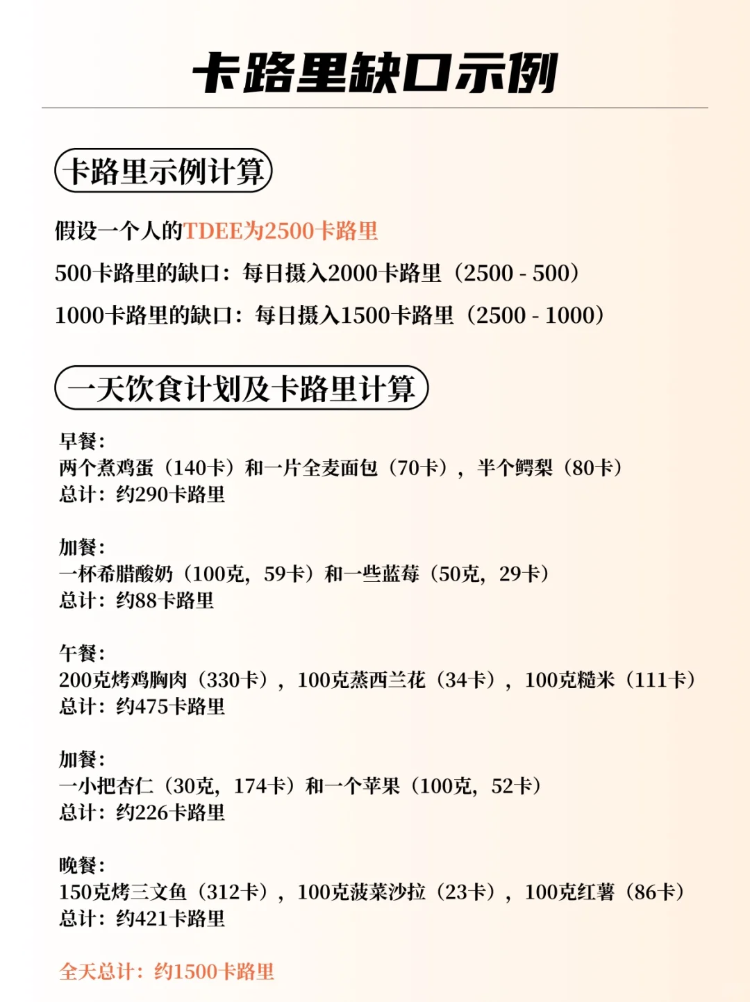#新手健身101问 -No.7\n科学减脂,快乐瘦身\n一篇详解新手减脂期卡路里缺口的计算方法\n \n🍠『卡路里缺口』\n摄入的卡路里小于消耗的卡路里\n身体消耗储存的脂肪来补充能量,达到减脂的效果\n·\n🧮『如何计算』\n第1️⃣步:计算基础代谢率(BMR)\n在休息状态下每天消耗的卡路里,具体计算公式🉑参考图2。\n \n第2️⃣步:计算活动水平系数(PAL)\n根据日常活动水平,乘以一个系数来估计日活动消耗,具体计算可以参考图2。\n \n第3️⃣步:总消耗卡路里(TDEE)\nTDEE=BMR+PAL\n·\n🌱『制造卡路里缺口』\n根据减脂目标设定:\n减脂期卡路里缺口=消耗卡路里−摄入卡路里\n每天500-1000卡的卡路里缺口,可以实现每周减0.5-1公斤的健康减脂目标。若你的每日消耗卡路里为2500卡,饮食摄入的卡路里应在1500-2000卡之间。\n·\n✍️『记录和调整』\n* 使用应用程序如MyFitnessPal、薄荷健康(教练推荐)记录每日摄入的卡路里。\n* 每周一次测量体重和身体脂肪比例,调整卡路里摄入和运动计划。\n·\n好啦,希望今天的健身干货可以帮到你更了解自己的身体,从而有规划地科学有效地进行减脂,让你离目标更近一步!\n#健身干货 #体脂率 #碳循环 #低碳饮食\n#香港生活 #沙田健身 #香港健身房 #瘦身日记\n#鱼越健身工作室 #鱼越健身 #香港鱼越健身房\n#鱼越健身荔枝角店 #鱼越健身火炭店