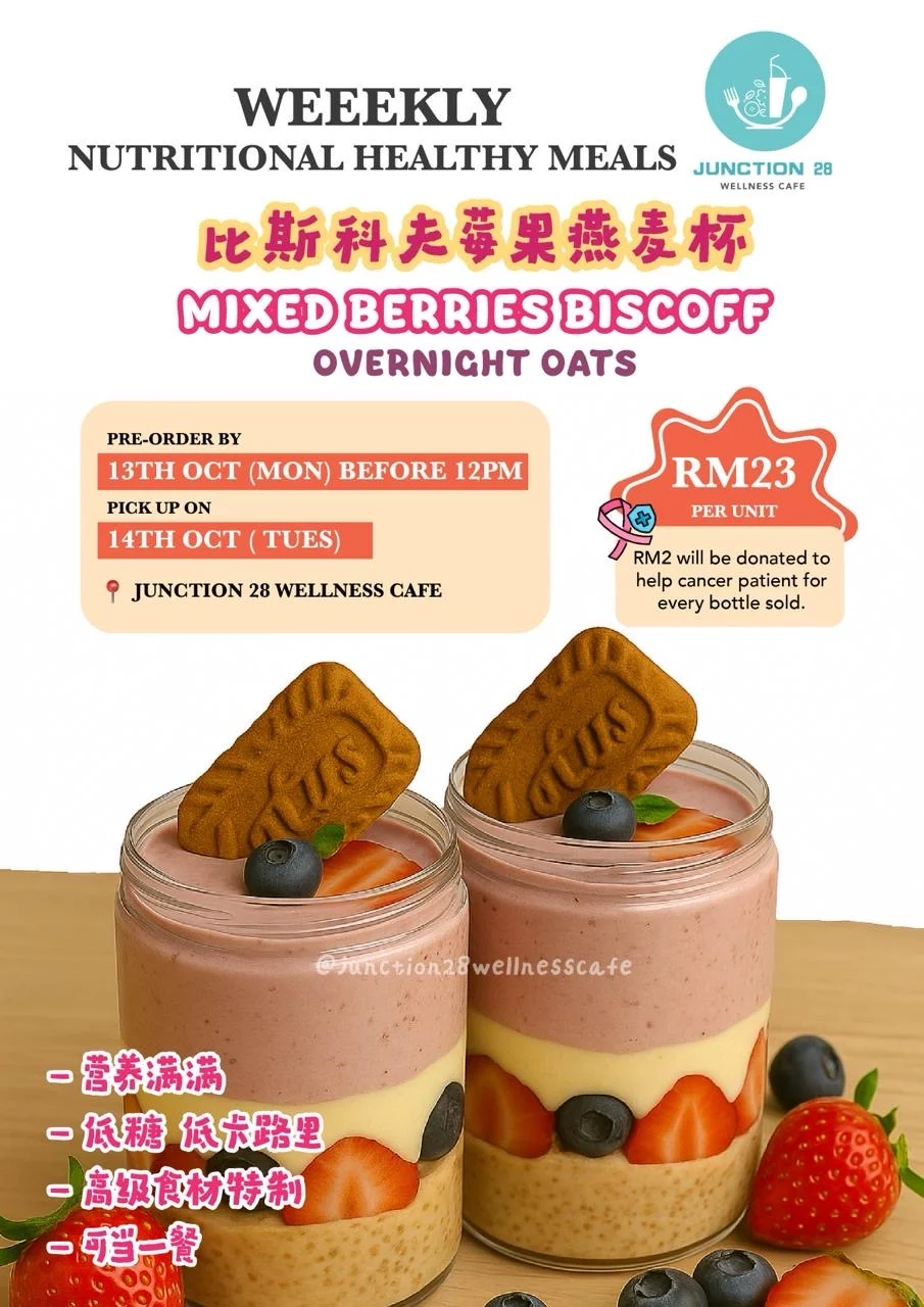 这个十月,让每一口都更有意义💕\n10月是 乳癌防治宣传月(Breast Cancer Awareness Month) 🎀\n让我们用一份健康餐点,传递一份爱与力量💗\n每售出一份的Overnight Oats 或 Sip & Shake,\n我们将捐出 🐎2 给马来西亚国家癌症协会(National Cancer Society),支持乳癌防治、关怀更多需要帮助的女性。\n🥣 健康|美味|有意义\n每一口燕麦、每一杯奶昔,都是为自己补充营养,也是为别人点亮希望的温柔行动✨\n \n📅 本周菜单已开放预订!(Monday, 13 Oct 2025)\n快约上家人、朋友一起加入这场「健康+爱心」的美味行动吧💪🌸\n \n#健康饮食 #健康甜点分享 #健康生活 #OvernightOats #低卡路里美食 #甜蜜无负担 #善意从一餐开始 #燕麦杯推荐 #减脂餐 #怡保
