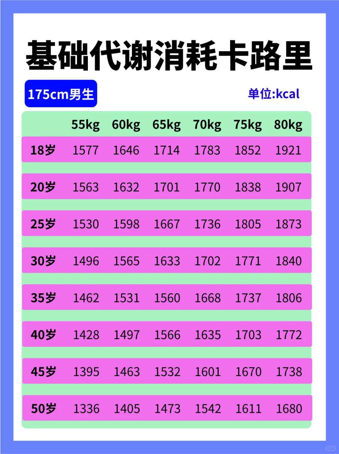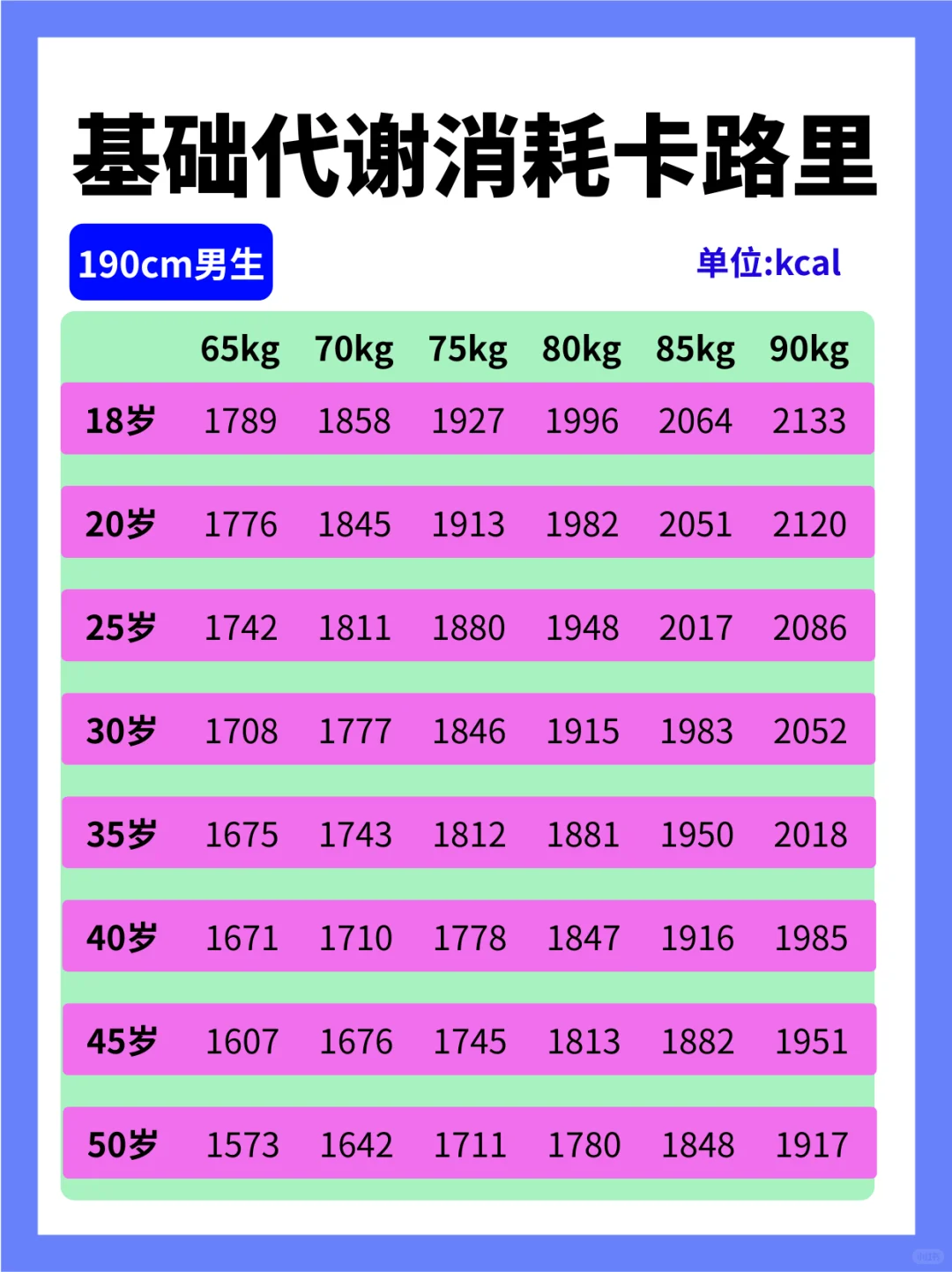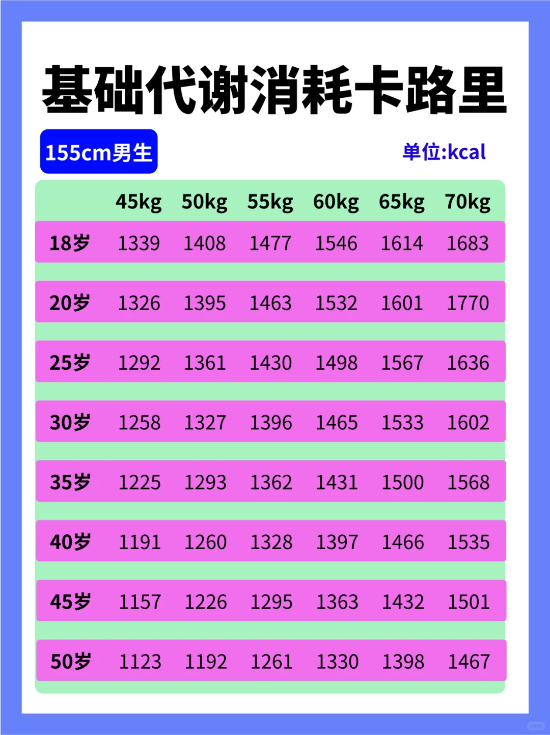 男生必看!155-190cm不同体重基础代谢统计\n原来身高体重差5kg,代谢能差这么多🔥\n#代谢 #代谢高了自然就瘦了 #热量消耗 #消耗热量 #自然代谢 #100天运动打卡挑战 #去班味养生局 #增强代谢能力 #基础代谢