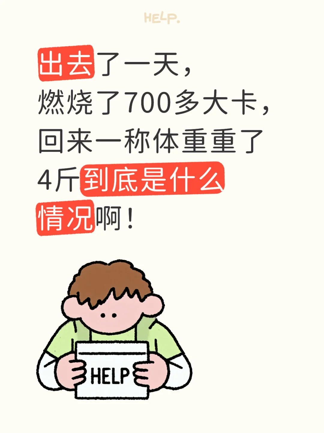 出去了一天,燃烧了700多大卡,回来一称体重重了4斤到底是什么情况啊!七月中旬体重逼近140斤,努力游泳➕控制饮食,周五好不容易减肥到133斤,因为今天去杭州玩了一天,又回到了139到底咋回事啊,要崩溃了!而且我现在肚子空空的啊!