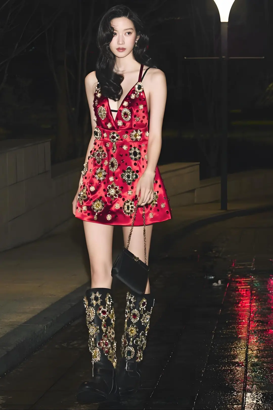 #文佳煐 #文佳瑛 #时尚 #穿搭 #韩流 #女星 #性感 #优雅 #女装 #女明星穿搭\n \n近日,被称为“韩国最敢穿的女明星”的文佳煐,为代言的意大利某奢侈品牌拍摄了一组秋冬系列大片。镜头贯穿白日繁华到夜幕璀璨,文佳煐则化身「COOL GIRL」,以优雅、率性、自信的姿态诠释品牌系列的核心看点,将自信与优雅凝聚于光影瞬间。\n图1:黑色露背透视长裙:\n文佳煐身着黑色透视与露背长裙,尽显性感与优雅,若隐若现的透视设计突出女性曲线,露背剪裁也大胆展现了文佳煐对身材的自信。\n图2:红色宝石吊带裙\n裙子上装饰的宝石色彩浓烈,闪耀夺目,剪裁如艺术品般精致,短版设计更显女性俏丽风姿,红色饱和度拉满,如火焰般耀眼,让文佳煐成为夜幕下最引人注目的焦点。\n图3:白色网状流苏裙\n裙体的白色网状结构搭配流苏、羽毛细节,充分呈现文佳煐独立、柔美与灵动的自由风格。而内衬的黑色文胸则与白裙形成强烈对比,性感而不失优雅。\n图4:黑色套装裙\n套装以利落轮廓与合身剪裁,勾勒出现代女性的强势与干练姿态。全黑色的搭配,更能透射出坚毅的内敛气质。\n图5:豹纹大衣\n豹纹作为高辨识度的时尚元素,常被赋予“打破束缚”的象征意义,也常被用于展现穿着者的自我主张和独特审美。身着豹纹大衣的文佳煐举手投足充满自信,融合街头张力,展现出冷艳迷人的强大气场!\n图6-图18:回顾文佳煐的穿搭进化史,无论是参加大秀还是私服写真,衣品持续在线,说她是韩国最敢穿最会穿的女星也不为过!
