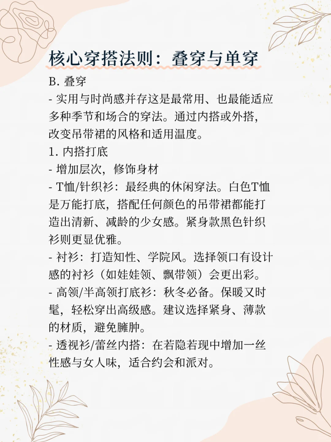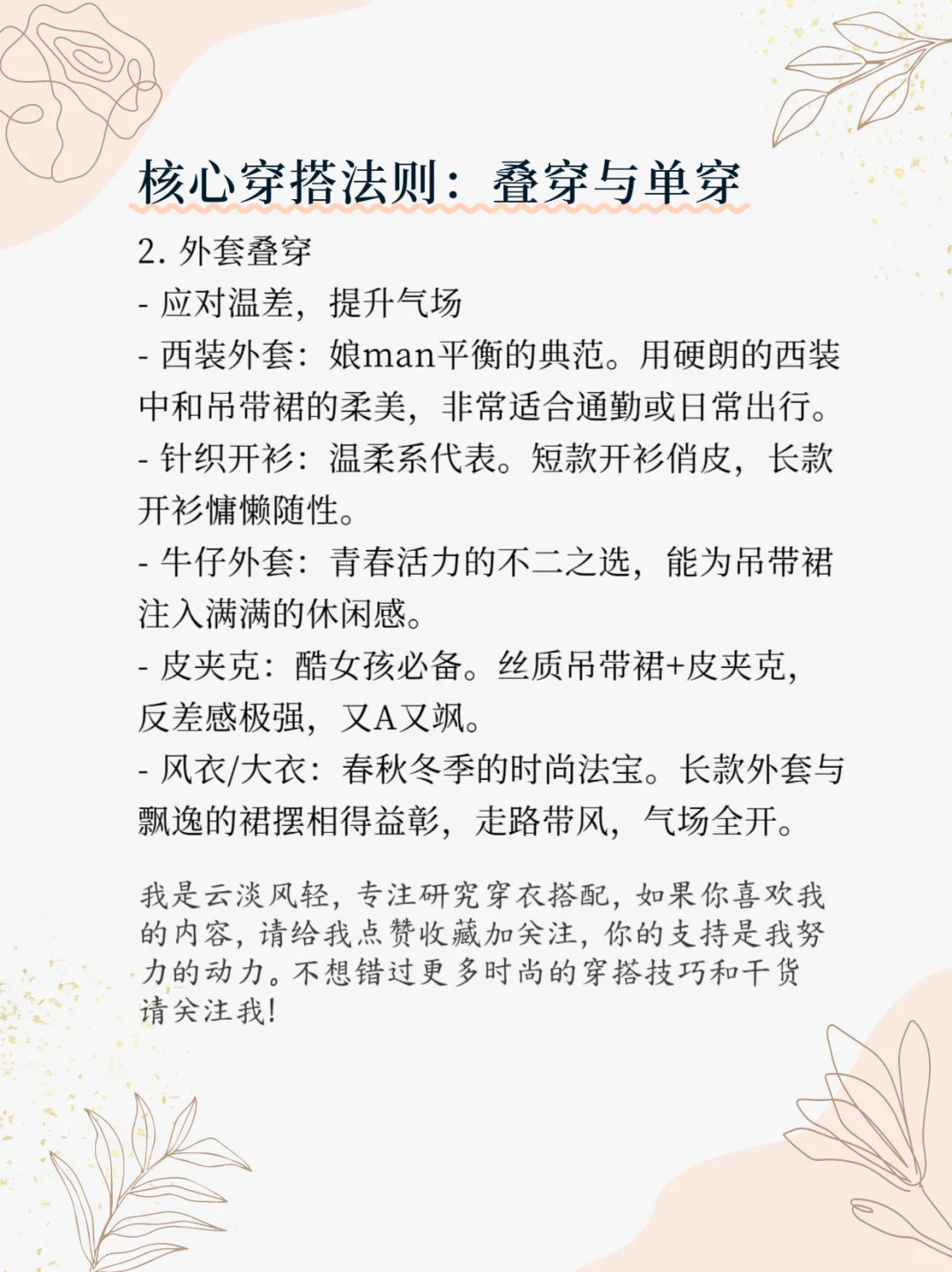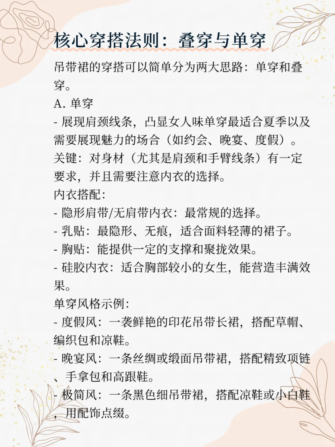 吊带裙是一件非常能展现女性魅力的单品,它可性感、可慵懒、可优雅,也能穿出休闲感。想要驾驭好它,关键在于搭配和场合的平衡。\n这里为你准备了一份超全的吊带裙穿搭指南,从风格到细节,一网打尽。\n我是云淡风轻,专注研究穿衣搭配,如果你喜欢我的内容,请给我点赞收藏加关注,你的支持是我努力的动力。不想错过更多时尚的穿搭技巧和干货请关注我!\n#吊带裙 #吊带裙穿搭 #吊带裙推荐 #吊带裙叠穿 #吊带裙搭配 #吊带裙外搭 #吊带裙里面穿什么内衣 #吊带裙内搭 #吊带裙秋季穿搭 #关注我每天分享穿搭技巧