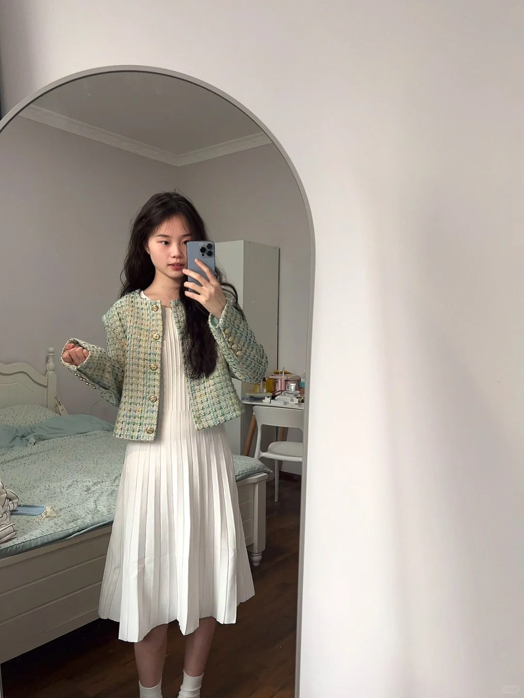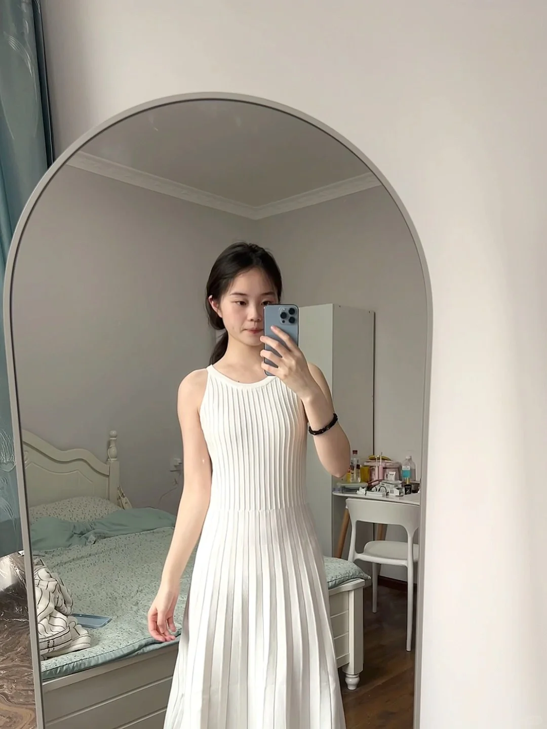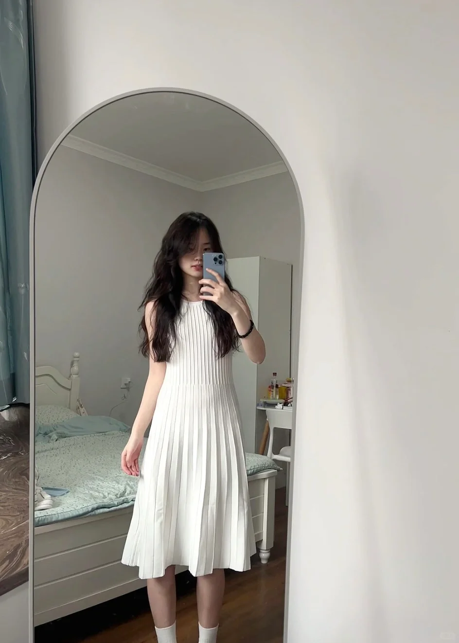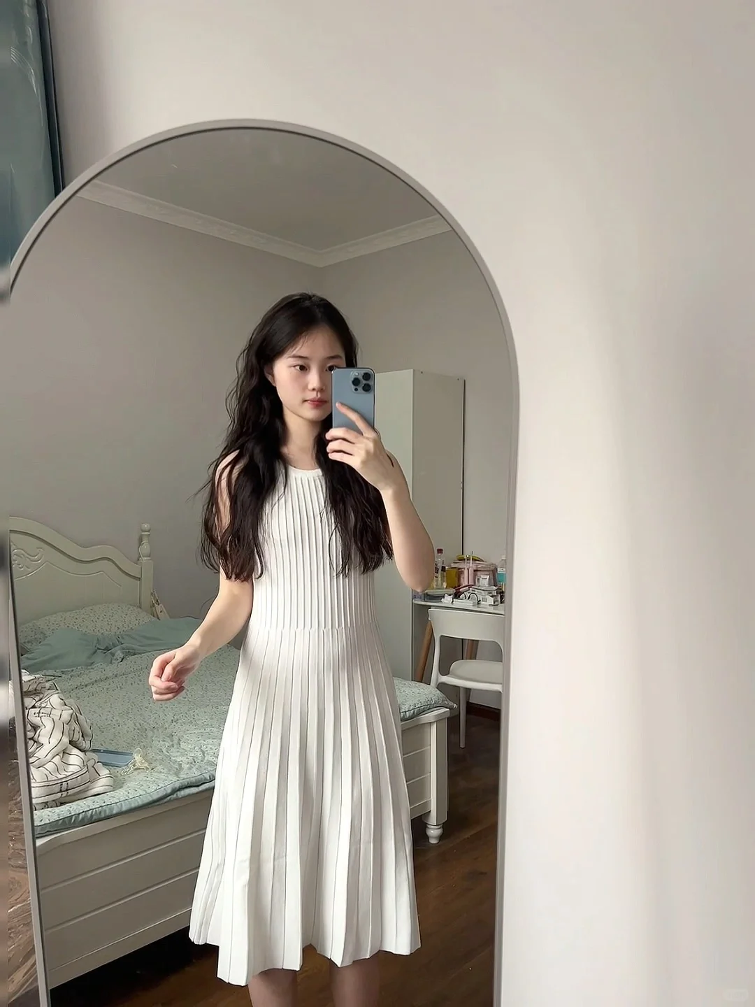 #温柔氛围感穿搭 #温柔穿搭 #温柔通勤 #每日穿搭 #开春穿搭 #白裙子 #清爽白色系穿搭 #干净穿搭 #小白裙 #裙子分享\n \n个人购衣分享!!\n \n第一条白裙子是被红薯上别的姐妹种草的。\n首先质感挺好的,也不算透,版型很显气质很仙气!并且个人觉得属于不烂大街的白裙。(下摆看着皱是因为拆了快递就试穿了,没熨,但是这种针织面料属于不易皱的)\n但是缺点是!肩颈部分有点显胖如p3所示,可以用长发遮挡或者搭配外套!且比较显肚子(针织面料的通病),也算是性价比挺高的一条裙子\n \n第二套是爱依服实体店买的,当时试穿完就直接拿下了,因为效果确实挺不错的。比较温柔通勤,简简单单就很好看,搭有跟的鞋子显得比例很好!\n裤子稍微有点显三角区不过我可以接受\n \n第一套适合瘦瘦的女孩子穿,第二套不挑人!