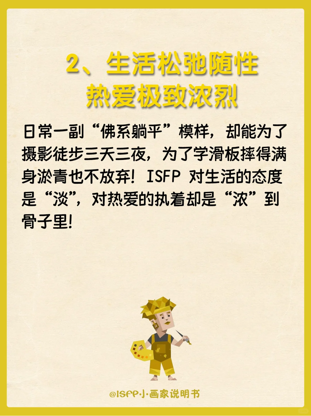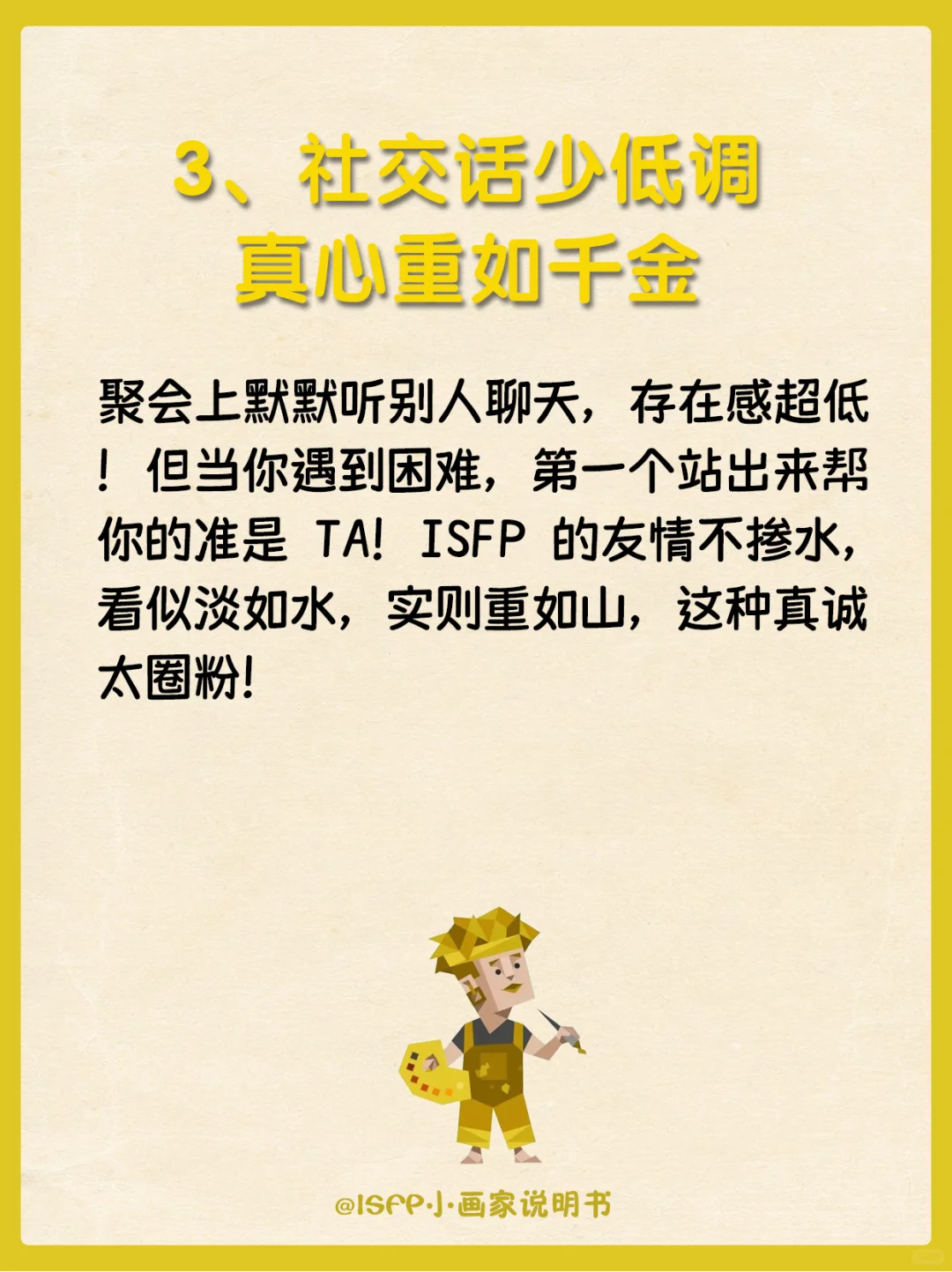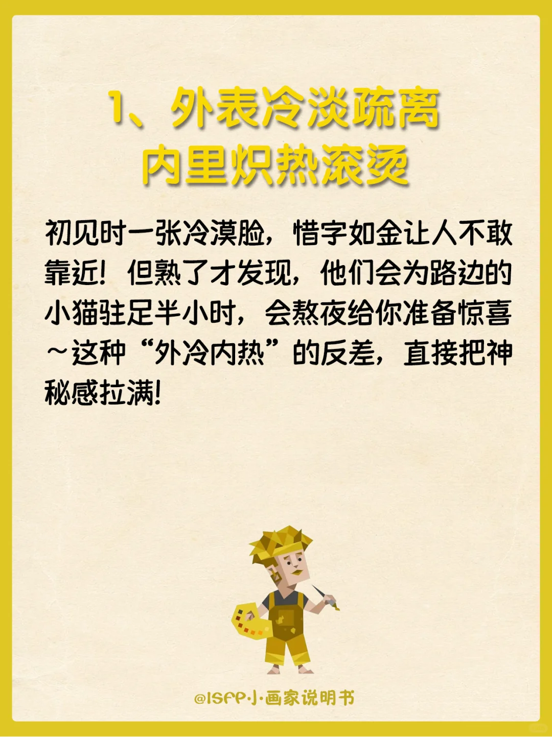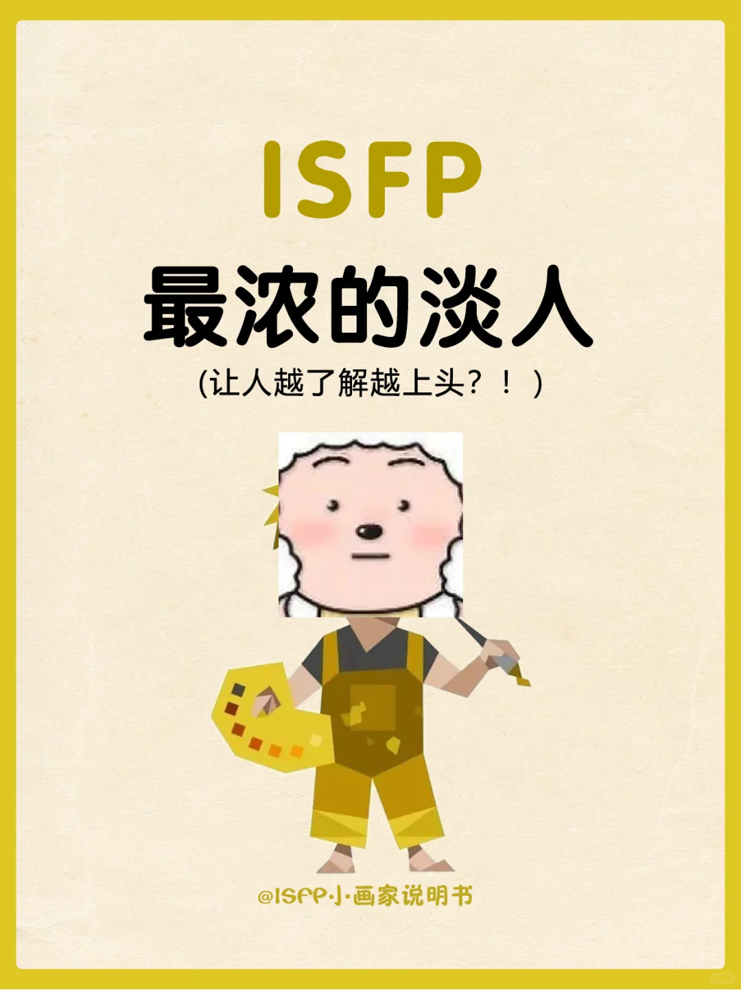 宝子们!要说 MBTI 里最矛盾又迷人的存在,ISFP 必须拥有姓名!明明是 “最浓的淡人”,却让人越了解越上头!今天就来盘一盘,他们这种 “矛盾感魅力” 为啥让人疯狂心动!\n.\n初见时一张冷漠脸,惜字如金让人不敢靠近!但熟了才发现,他们会为路边的小猫驻足半小时,会熬夜给你准备惊喜~这种 “外冷内热” 的反差,直接把神秘感拉满……\n.\nISFP 的 “淡” 是清醒,“浓” 是热烈,这种矛盾又和谐的特质,才是他们独一无二的魅力!愿每个 ISFP 都能自在做自己,也希望大家都能发现这份独特的美好~\n#isfp精神世界 #十六种人格 #isfp #浓人和淡人 #mbti梗图 #人格 #性格分析 #MBTI16型人格 #isfp小画家 #MBTI