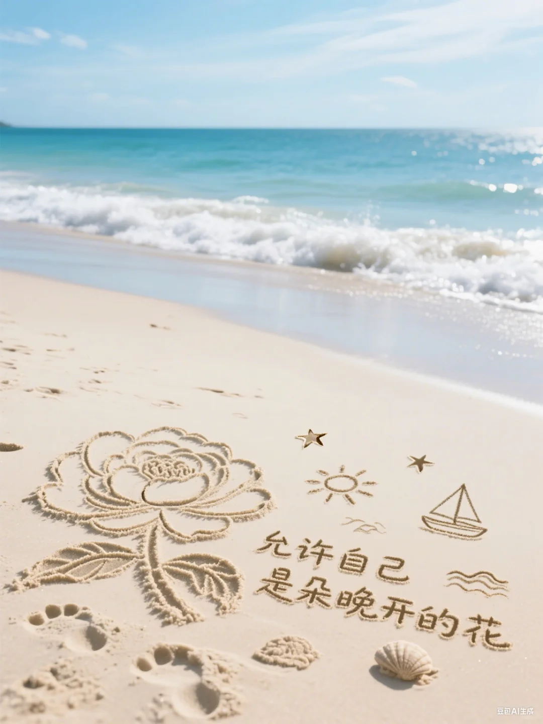 🌸 不必追赶他人的花期,你自有绽放的时节。\n就像海平线后的光,终会温柔照亮自己的天空。\n \n🌱有些花等待更久的阳光、更深的雨水,只为盛开出更独特的力量。\n慢一点成长也没关系,在静默的时光里扎根,在孤独中积蓄光芒。\n终有一天,你会站在属于自己的风景里,从容盛开,温柔且坚定。\n \n🌻允许自己晚一点开花,\n毕竟,好的人生,不慌不忙。\n \n🍀慢慢来,每一步成长,\n都在靠近美好,你值得这一路繁花相送~\n \n⚠️ 温馨提醒:图片禁止商用/二创!如需转载、搬运,需获得【AI 美学设计】的授权同意,且在正文注明 “原图出自 @AI 美学设计”。未经授权擅自转载、搬运、二创或商用的行为,我们将依法追究其侵权责任。感谢您对原创作品的尊重与支持!\n \n💞取图用作壁纸、头像或发⭕的宝子请告知所喜欢的图片编号,如”图1“,可自行下载使用~\n🌈如果你有想设计的图片,欢迎在评论区留下你的创意想法和文字内容~随缘挑选设计同款图!\n \n📣声明:本笔记的创作灵感与构思均为原创,图片由AI辅助生成,仅供娱乐,无任何引导。\n \n#治愈系风景 #浪漫生活的记录者 #壁纸 #治愈文案 #ai绘画 #豆包ai #AI #大海 #夏日 #小红书艺术发光计划