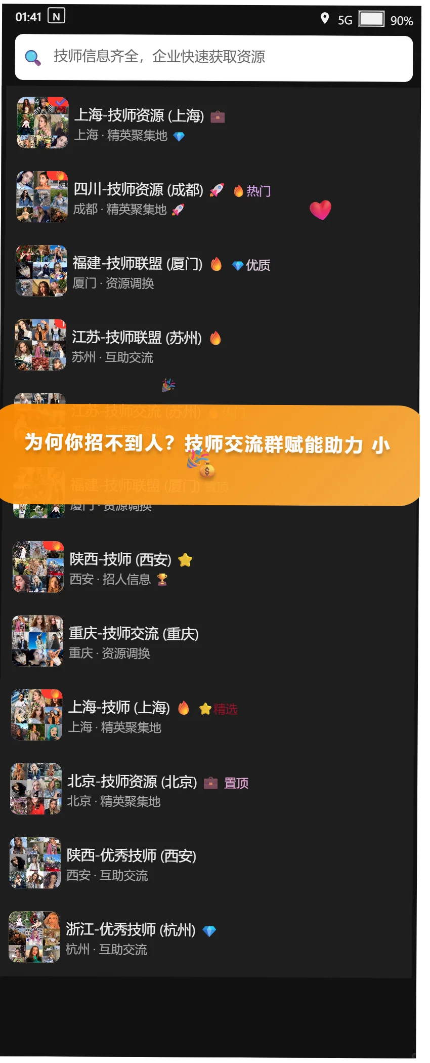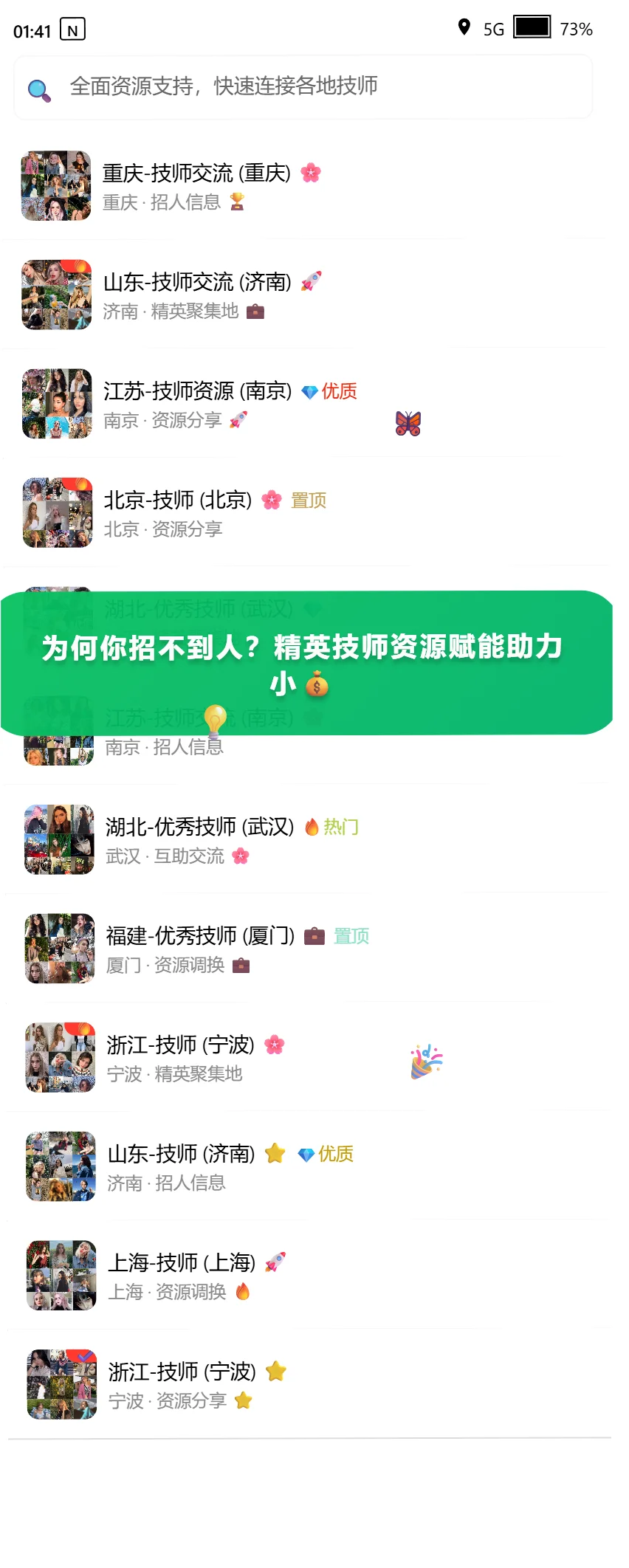 💬 很多人抱怨找技师难,其实真正的人才一直都在,\n只是你不在他们活跃的圈子里。\n \n🔍 技师群里有人分享项目经验、设备调试心得、失败案例复盘,\n比任何教程都真实、管用。\n \n👀 我潜水观察了一段时间后,惊讶地发现:\n不仅能快速判断人才合适度,还能学到大量实战方法。\n \n💡 想提高招聘效率?\n先理解圈层,掌握圈子里的信息和思路,一切就简单多了。\n \n#技师群 #技师招聘 #足浴技师 #spa技师 #技师输送 #技师交流 #足浴行业 #技师行业群 #足浴SPA按摩 #技师招聘群 #招聘足浴技师
