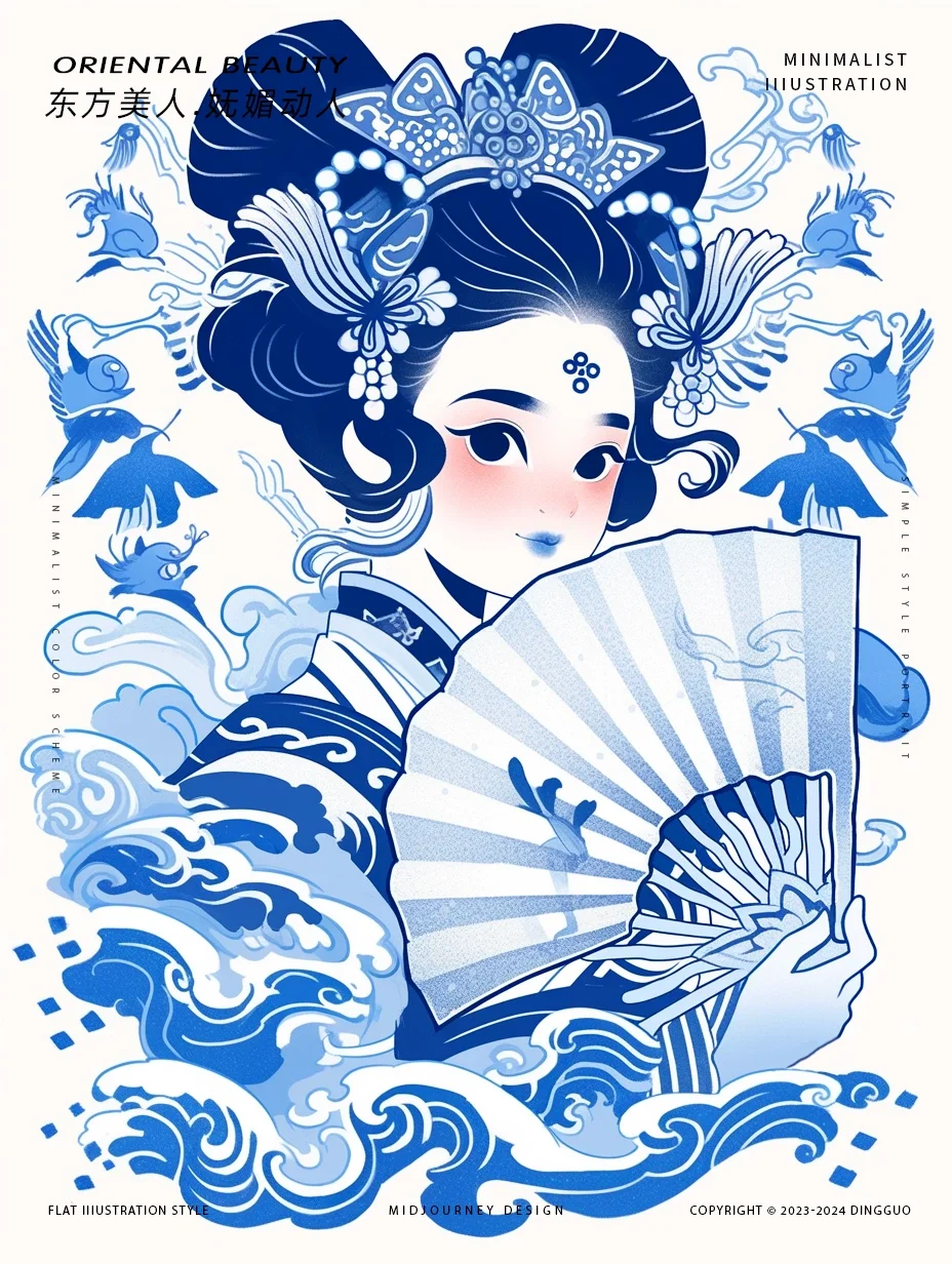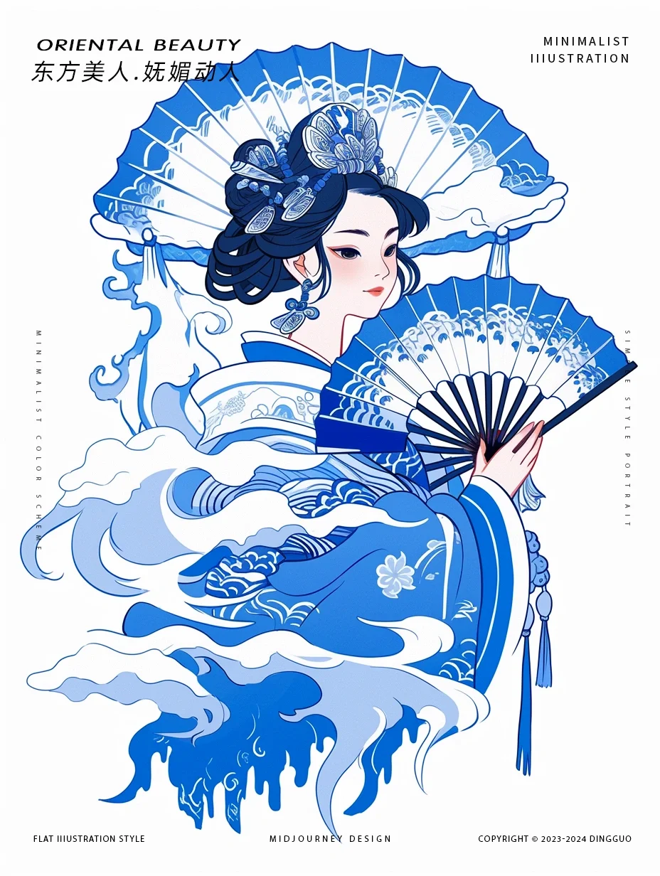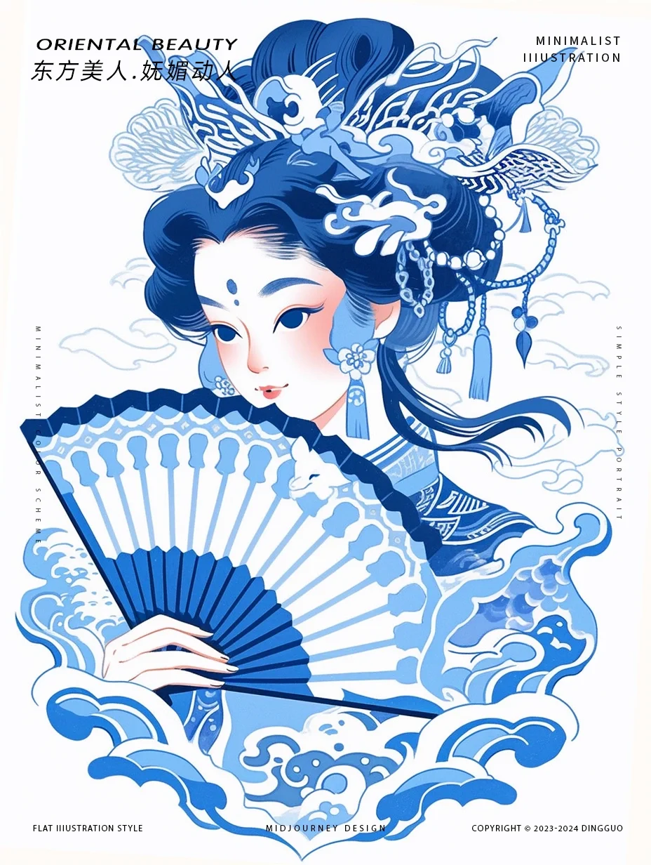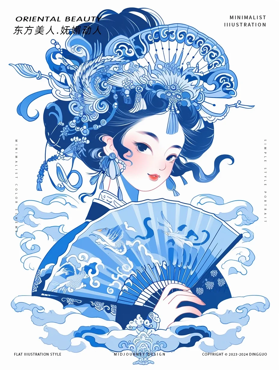 第二弹,继续古风探索,主题:东方美人-妩媚动人②,希望大家喜欢,谢谢\n 核心关键词说明:\n① Vector illustration 矢量插画\n② Woodcut printmaking 木刻版画\n③ Holding a paper fan 拿着纸扇\n④ gorgeous wooden screen 华丽的木质屏风\n⑤ blue and white glaze color 蓝白釉色\n \n#搞的就是艺术 #画画的日常#国风插画#原画#国潮插画#古风插画#Ai绘画#midjourney#文创#插画分享#原创插画#文创产品#氛围感头像#氛围感女生头像#插画头像#y园糖插画打卡21天#创意星球学院奖#自愈#自愈系#治愈插画#潮流艺术薯#嫦娥#嫦娥仙子#国风旗袍 #文创设计#商业插画#创意海报#银河插画村#插畵#嫦娥奔月#创意民族风格#蓝贵莲插画班#我的插画#每日插画#插画海报#扁平风插画#古風#民族风#人物插画#新国风插画#神话#东方美学 #国潮#女孩头像 #国漫#新国风#新中式国风#古风头像#经典配色 #女孩