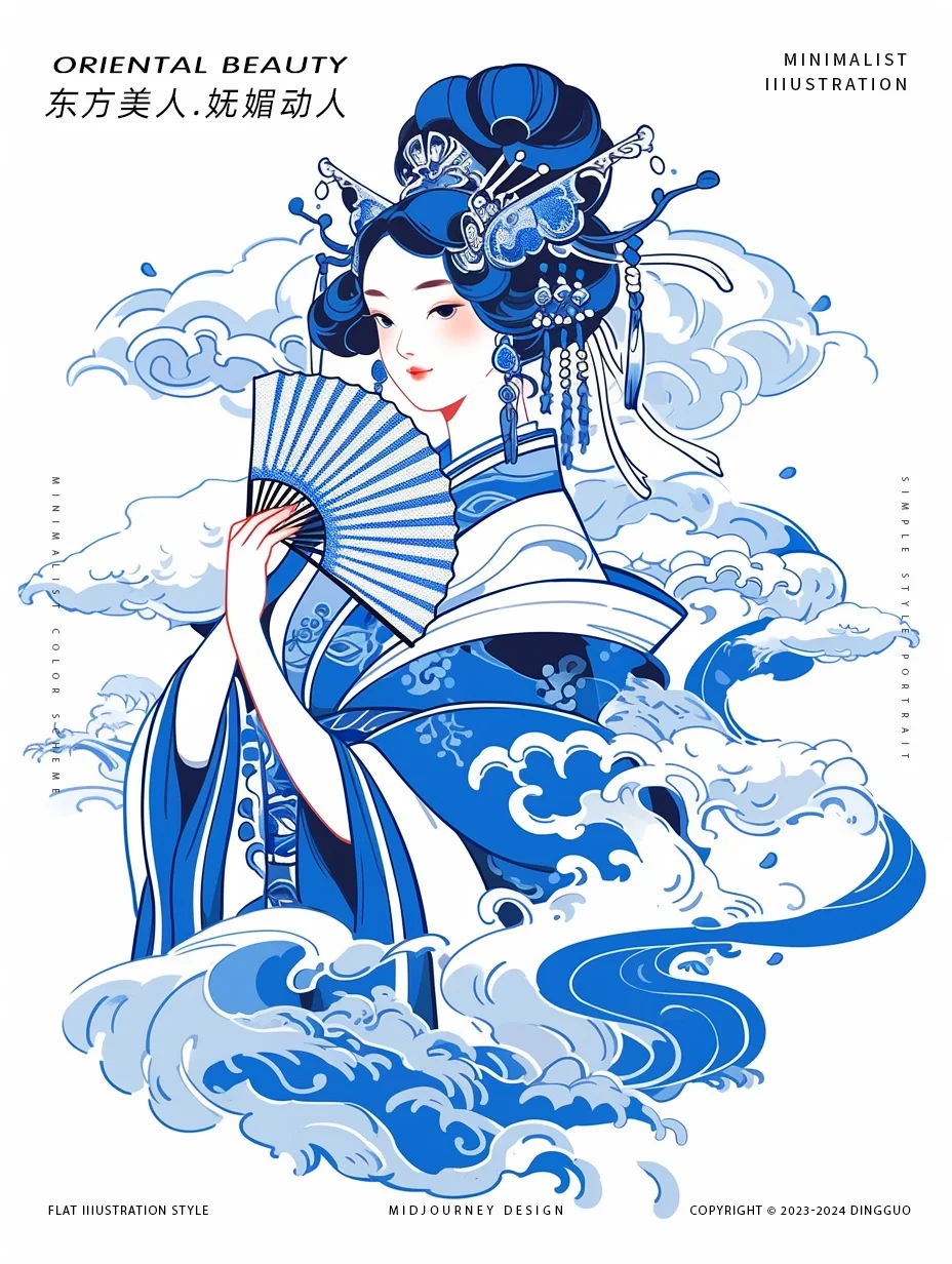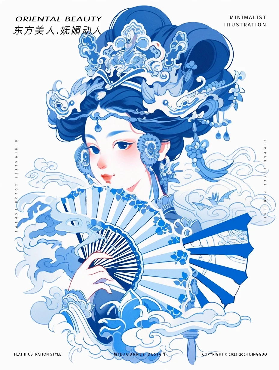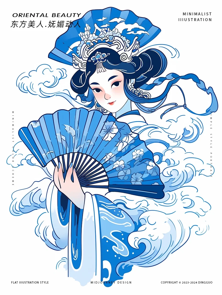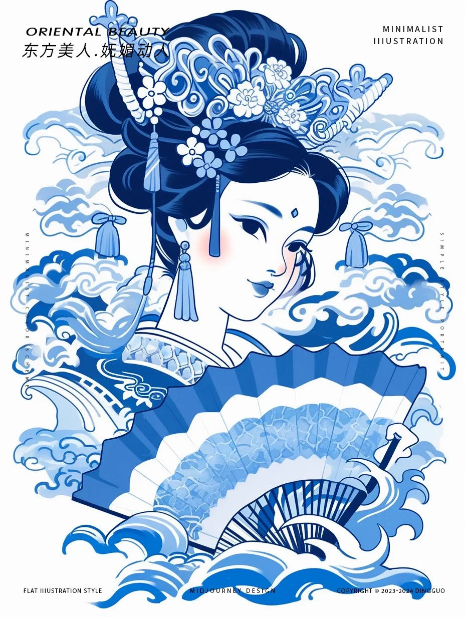 第二弹,继续古风探索,主题:东方美人-妩媚动人②,希望大家喜欢,谢谢\n 核心关键词说明:\n① Vector illustration 矢量插画\n② Woodcut printmaking 木刻版画\n③ Holding a paper fan 拿着纸扇\n④ gorgeous wooden screen 华丽的木质屏风\n⑤ blue and white glaze color 蓝白釉色\n \n#搞的就是艺术 #画画的日常#国风插画#原画#国潮插画#古风插画#Ai绘画#midjourney#文创#插画分享#原创插画#文创产品#氛围感头像#氛围感女生头像#插画头像#y园糖插画打卡21天#创意星球学院奖#自愈#自愈系#治愈插画#潮流艺术薯#嫦娥#嫦娥仙子#国风旗袍 #文创设计#商业插画#创意海报#银河插画村#插畵#嫦娥奔月#创意民族风格#蓝贵莲插画班#我的插画#每日插画#插画海报#扁平风插画#古風#民族风#人物插画#新国风插画#神话#东方美学 #国潮#女孩头像 #国漫#新国风#新中式国风#古风头像#经典配色 #女孩