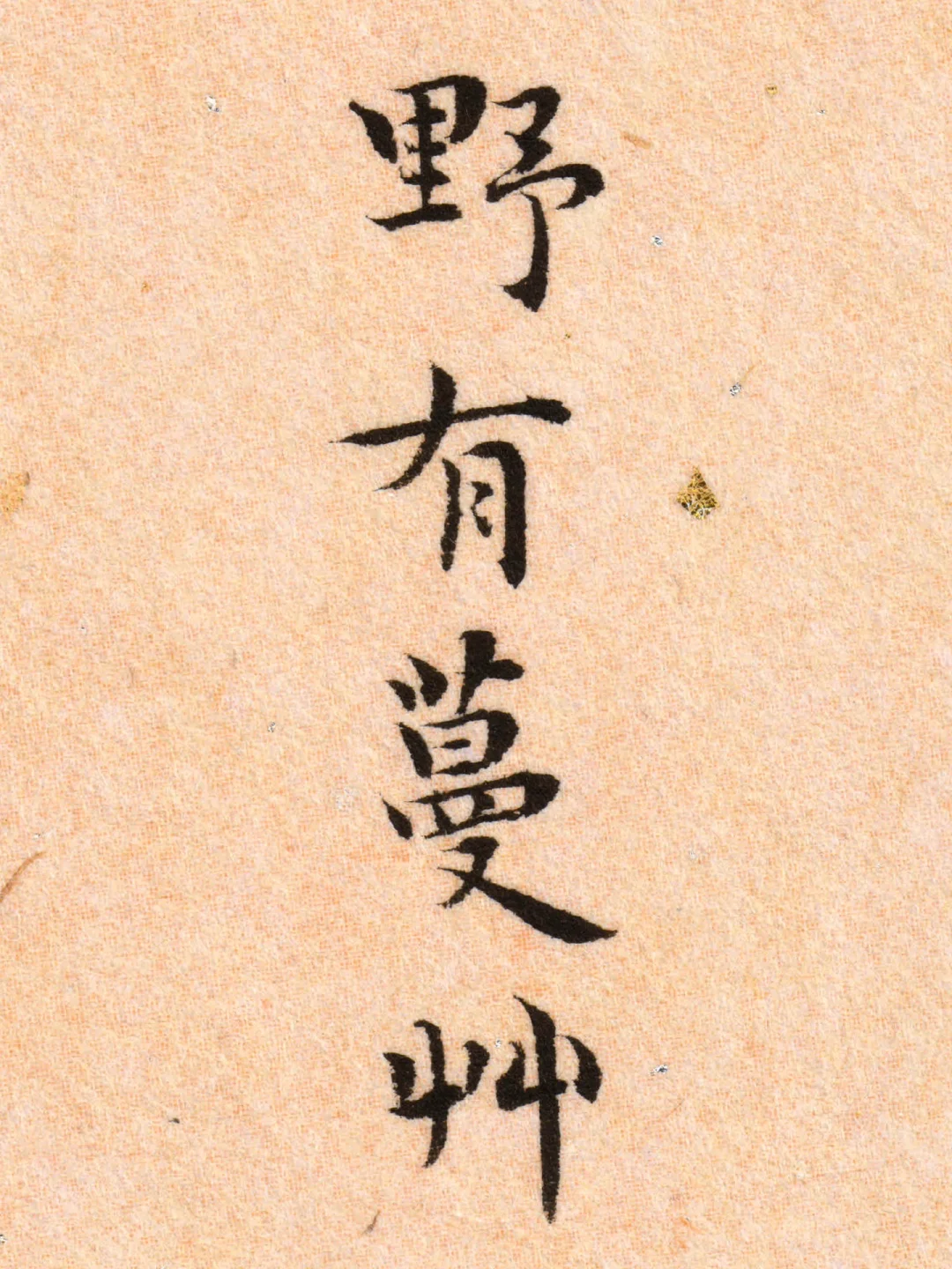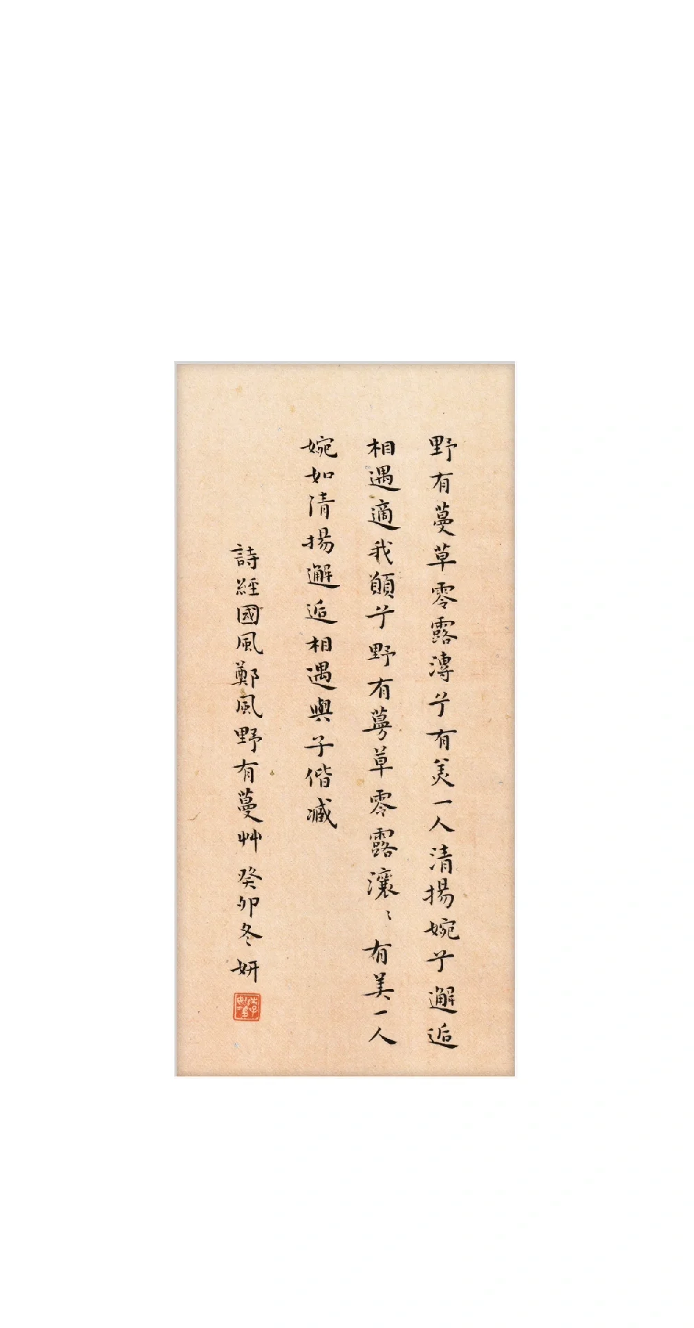 野有蔓草,零露漙兮。有美一人,清扬婉兮。邂逅相遇,适我愿兮。\n野有蔓草,零露瀼瀼。有美一人,婉如清扬。邂逅相遇,与子偕臧。\n \n蔓(màn)草:蔓延生长的草。蔓:蔓延。一说茂盛。\n零:降落。漙(tuán):形容露水多。\n清扬:目以清明为美,扬亦明也,形容眉目漂亮传神。婉:美好。\n邂(xiè)逅(hòu):不期而遇。\n适:满足。\n瀼(ráng):形容露水浓,多。\n偕臧(cáng):一同藏匿,指消失这草木丛中。臧,同“藏”;一说善,好。\n \n野草蔓蔓连成片,草上露珠亮闪闪。一位美丽的姑娘含情不语,飘然而至,那露水般晶莹的美目,秋波一转,顾盼流转,妩媚动人。不期而遇真正巧,正好满足我心愿。\n野草蔓蔓连成片,草上露珠大又圆。一位美丽的姑娘含情不语,飘然而至,那露水般晶莹的美目,秋波一转,顾盼流转,妩媚动人。不期而遇真正巧,与她幽会两心欢。\n \n#我的书法分享 #小楷 #手写 #国风 #诗经
