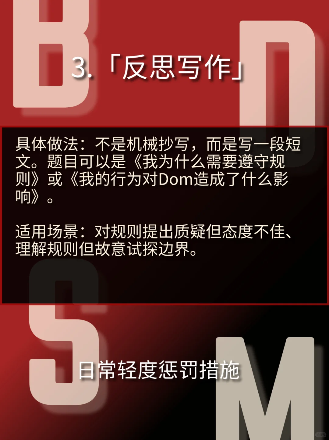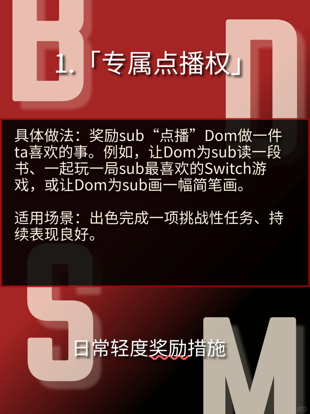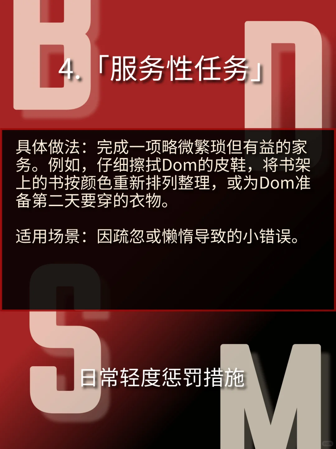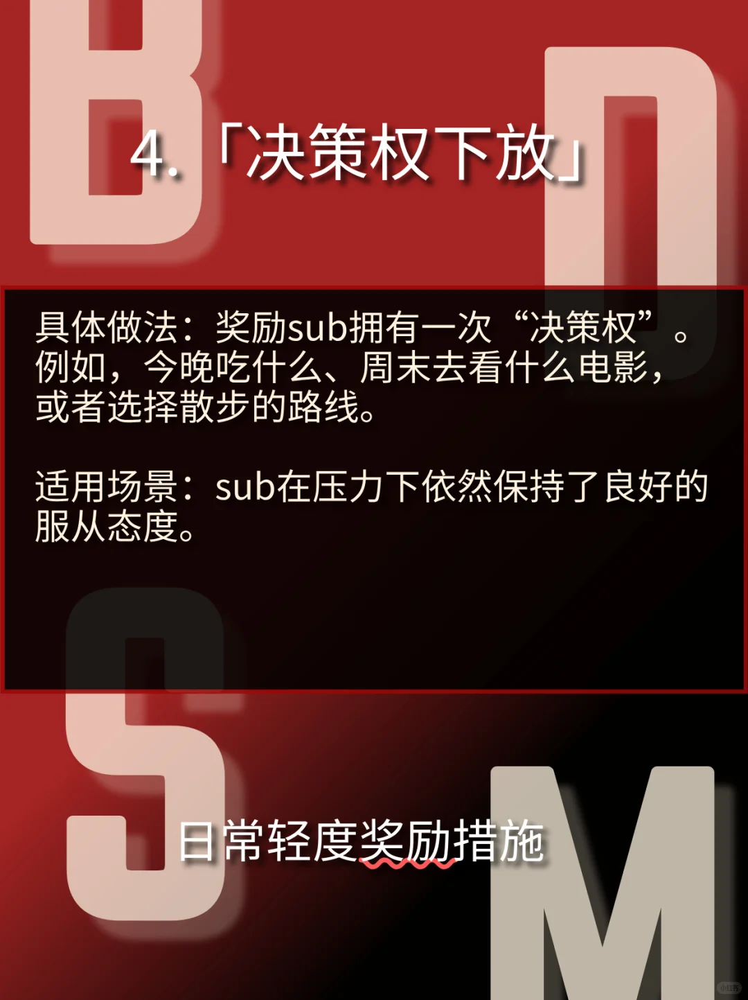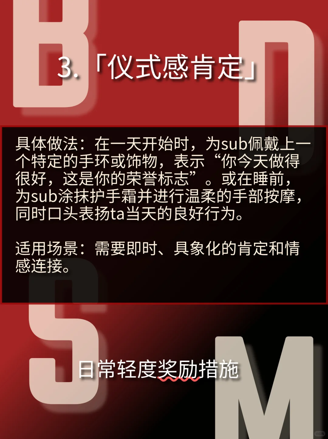 构建奖惩体系的核心原则\n在探讨具体措施前,请将以下原则作为一切行动的基础:\n动机纯正:惩罚的动机必须是 “建设性” 的,旨在纠正行为、回归秩序,而非发泄愤怒。奖励的动机是 “激励与肯定” ,强化良好行为,表达欣赏。\n逻辑关联:奖惩应尽可能与行为本身相关联。例如,因沉迷手机而耽误任务,惩罚可以是限制手机使用;因出色完成一项困难任务,奖励可以是享受一段无干扰的自由时间。\n比例适当:小过失小惩戒,大成就大奖励。把握“度”是Dominant最重要的功课之一。\n情感闭环:无论是奖惩,结束后都需要沟通和情感连接。惩罚后必须有事后关怀,让sub感受到即使被纠正,也依然被爱和被需要;奖励后则要共享喜悦,加深连接。#BDSM #年上 #小圈 #小众圈子 #字母圈 #SM #抖m #sub #dom #入圈