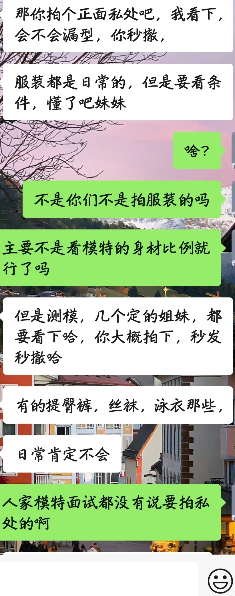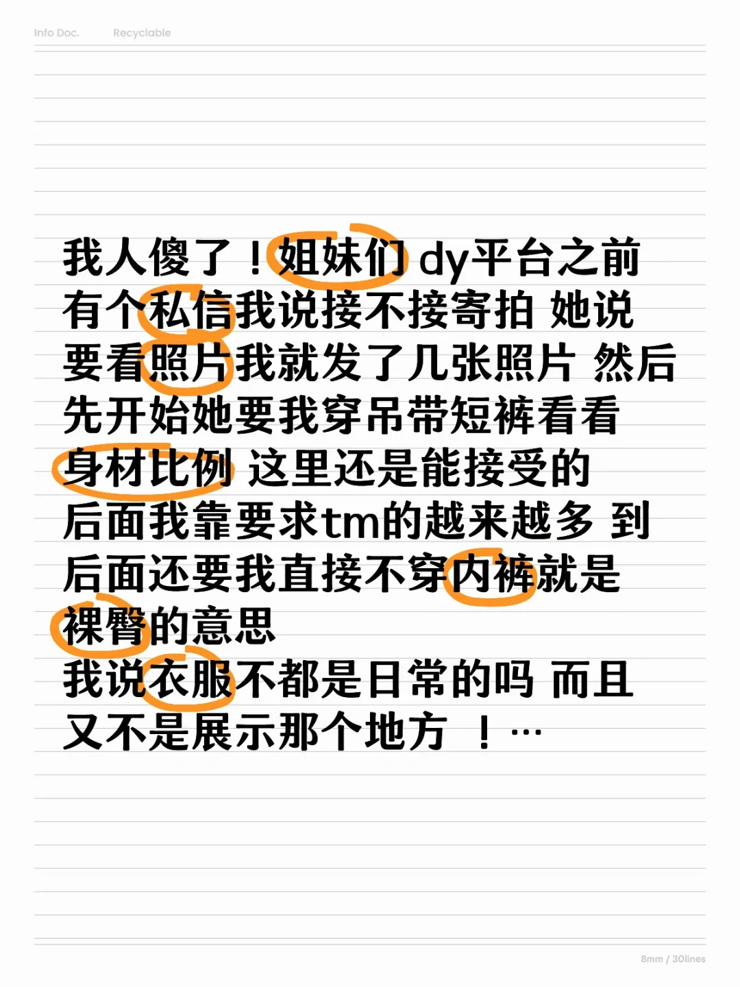 我人傻了!姐妹们 dy平台之前有个私信我说接不接寄拍 她说要看照片我就发了几张照片 然后先开始她要我穿吊带短裤看看身材比例 这里还是能接受的\n后面我靠要求tm的越来越多 到后面还要我直接不穿内裤就是裸臀的意思\n我说衣服不都是日常的吗 而且又不是展示那个地方 !\n只是拍拍衣服 就算是那种专业模特 也不需要这样吧 我TM真的人傻了 姐妹们碰到这种赶紧跑吧\n不要为了这一点钱就放弃原则底线了!\n#寄拍骗局套路