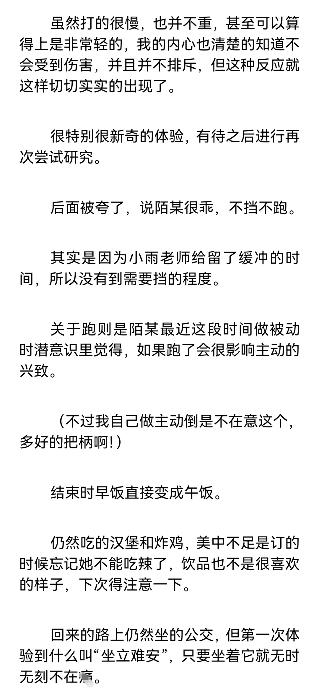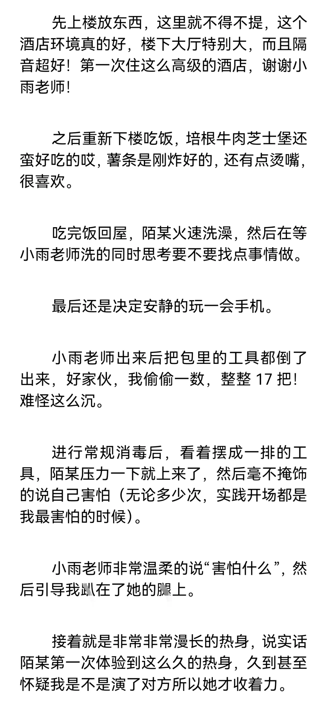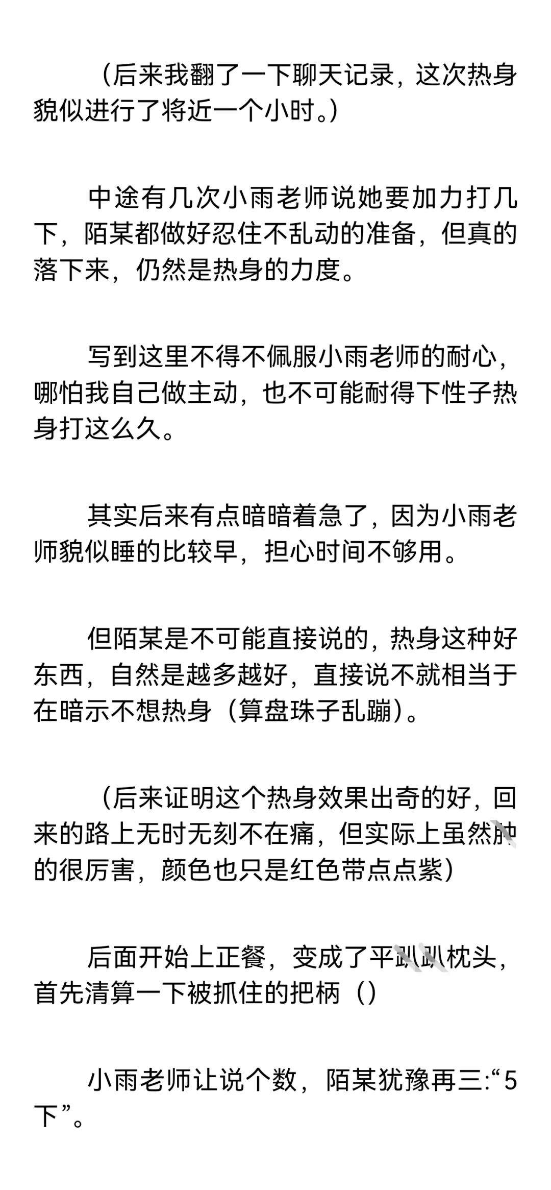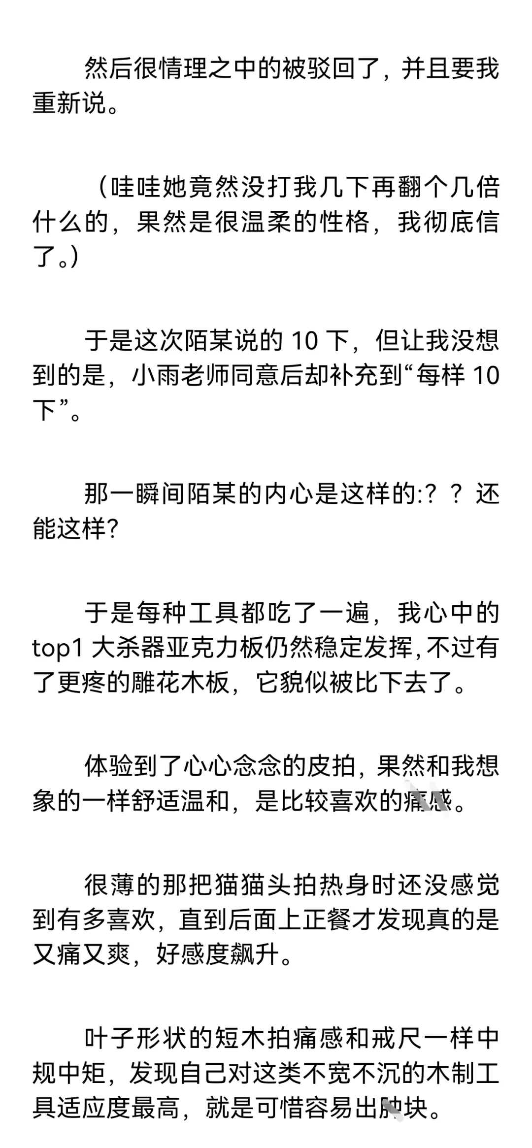 【小圈预警,训诫预警,不懂勿入,不喜勿喷。】\n \n【再次预警,不感兴趣请直接划走谢谢合作!如继续阅读默认知晓小圈。】\n \n这篇是我和小雨姐认识满一个月的时候,进行的第一次实践。\n \n这个时候我俩还没有处关系哦,因为刚认识没多久,所以陌某还很客气的叫她“小雨老师”。\n \n篇长三千七百多字,除去封面共记12页,如有被吞情况请联系我。\n \n声明: 虽然tag打训诫文标签,但这确确实实是我真实经历并发生的,不是伪纪实或半纪实。\n \n一点备注:\n陌某属性双偏被,遇到小雨姐之前都是约的纯实践,既约过主动也约过被动,但不玩guanjiao。\n(我比较钻牛角尖,只有我认可的愿意处关系的人才会服管,小雨姐是第一个。)\n \n小雨姐属性双偏主,同我一样也主动被动都约过,被我在群里捞到的时候正处淡圈状态,工具很多,但人很温柔,不会过多的干涉管束我,让我保持一种松紧适中的舒适感。\n \n#训诫文 #sp #小圈 #桃子红了 #小圈实践 #小圈日常 #ff