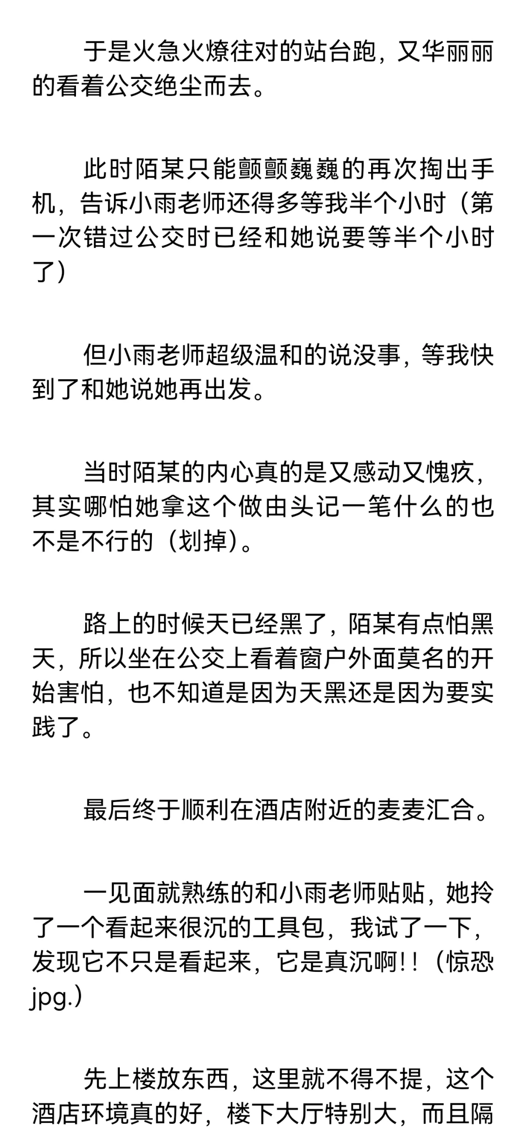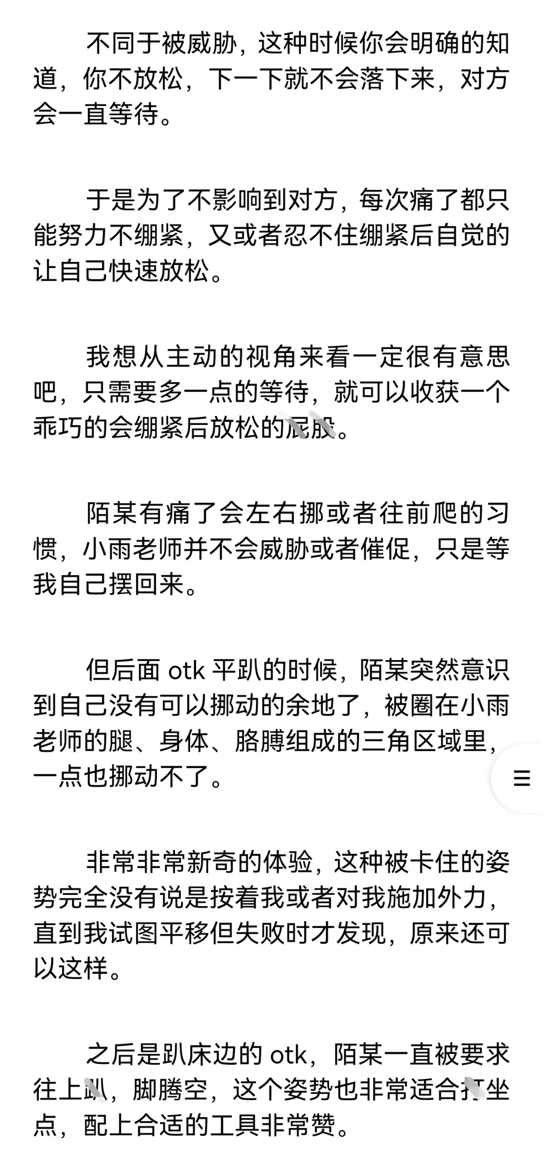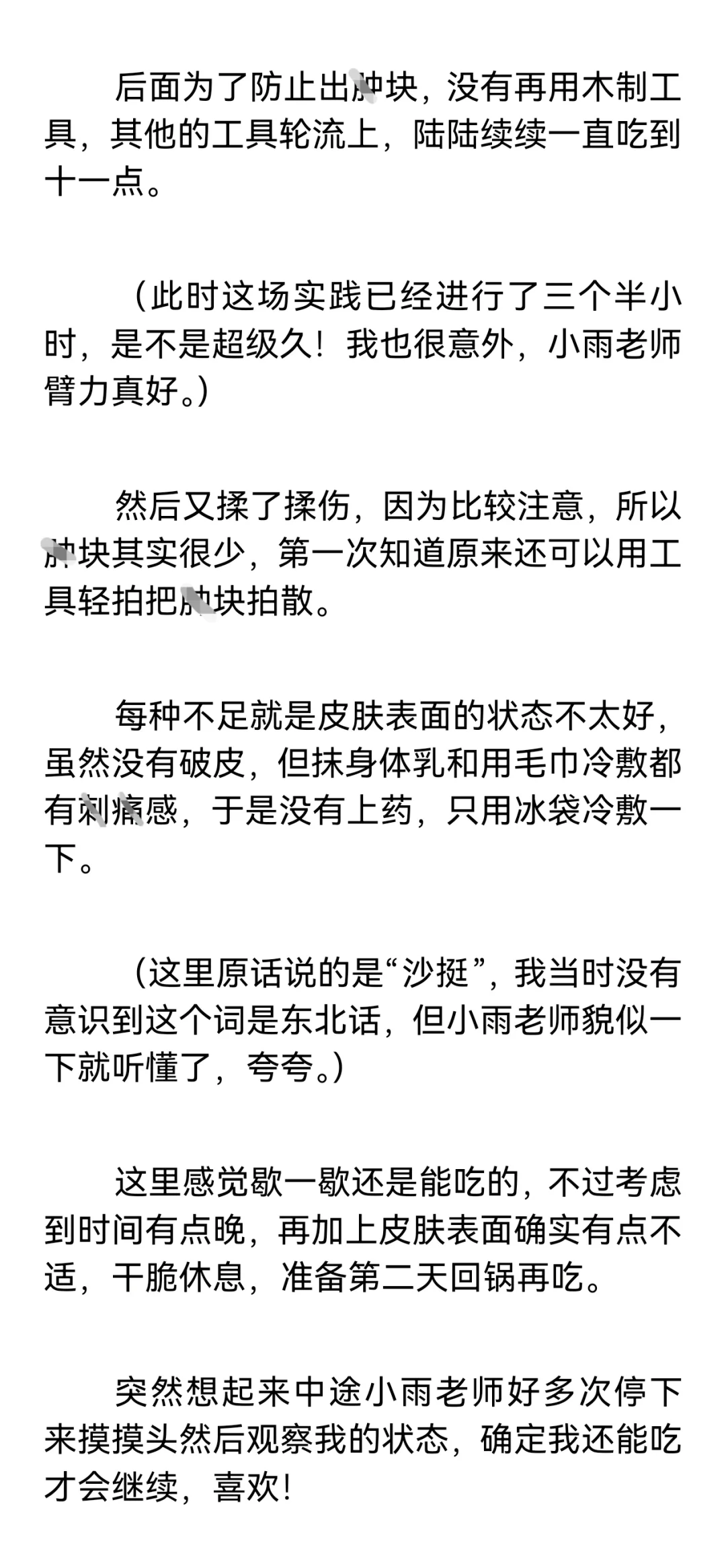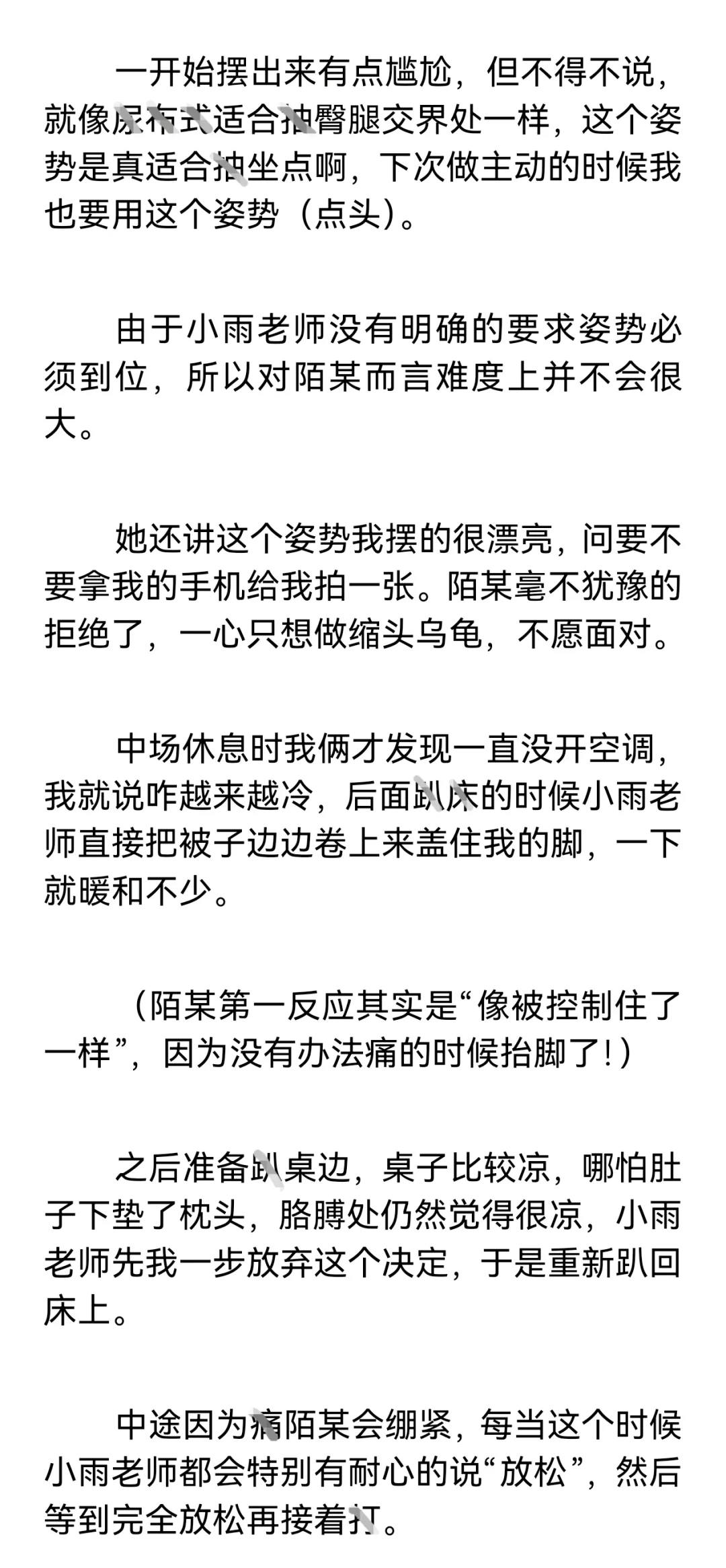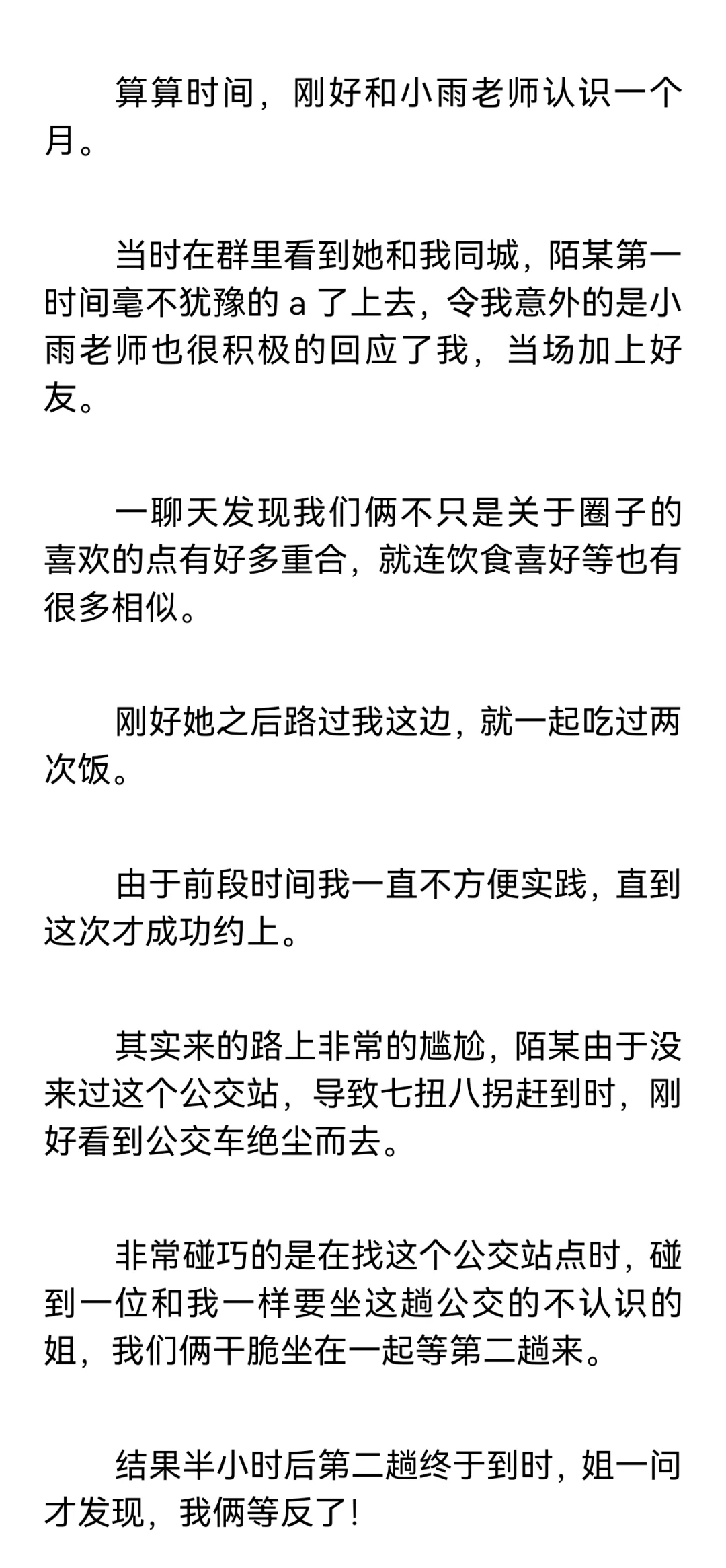 【小圈预警,训诫预警,不懂勿入,不喜勿喷。】\n \n【再次预警,不感兴趣请直接划走谢谢合作!如继续阅读默认知晓小圈。】\n \n这篇是我和小雨姐认识满一个月的时候,进行的第一次实践。\n \n这个时候我俩还没有处关系哦,因为刚认识没多久,所以陌某还很客气的叫她“小雨老师”。\n \n篇长三千七百多字,除去封面共记12页,如有被吞情况请联系我。\n \n声明: 虽然tag打训诫文标签,但这确确实实是我真实经历并发生的,不是伪纪实或半纪实。\n \n一点备注:\n陌某属性双偏被,遇到小雨姐之前都是约的纯实践,既约过主动也约过被动,但不玩guanjiao。\n(我比较钻牛角尖,只有我认可的愿意处关系的人才会服管,小雨姐是第一个。)\n \n小雨姐属性双偏主,同我一样也主动被动都约过,被我在群里捞到的时候正处淡圈状态,工具很多,但人很温柔,不会过多的干涉管束我,让我保持一种松紧适中的舒适感。\n \n#训诫文 #sp #小圈 #桃子红了 #小圈实践 #小圈日常 #ff