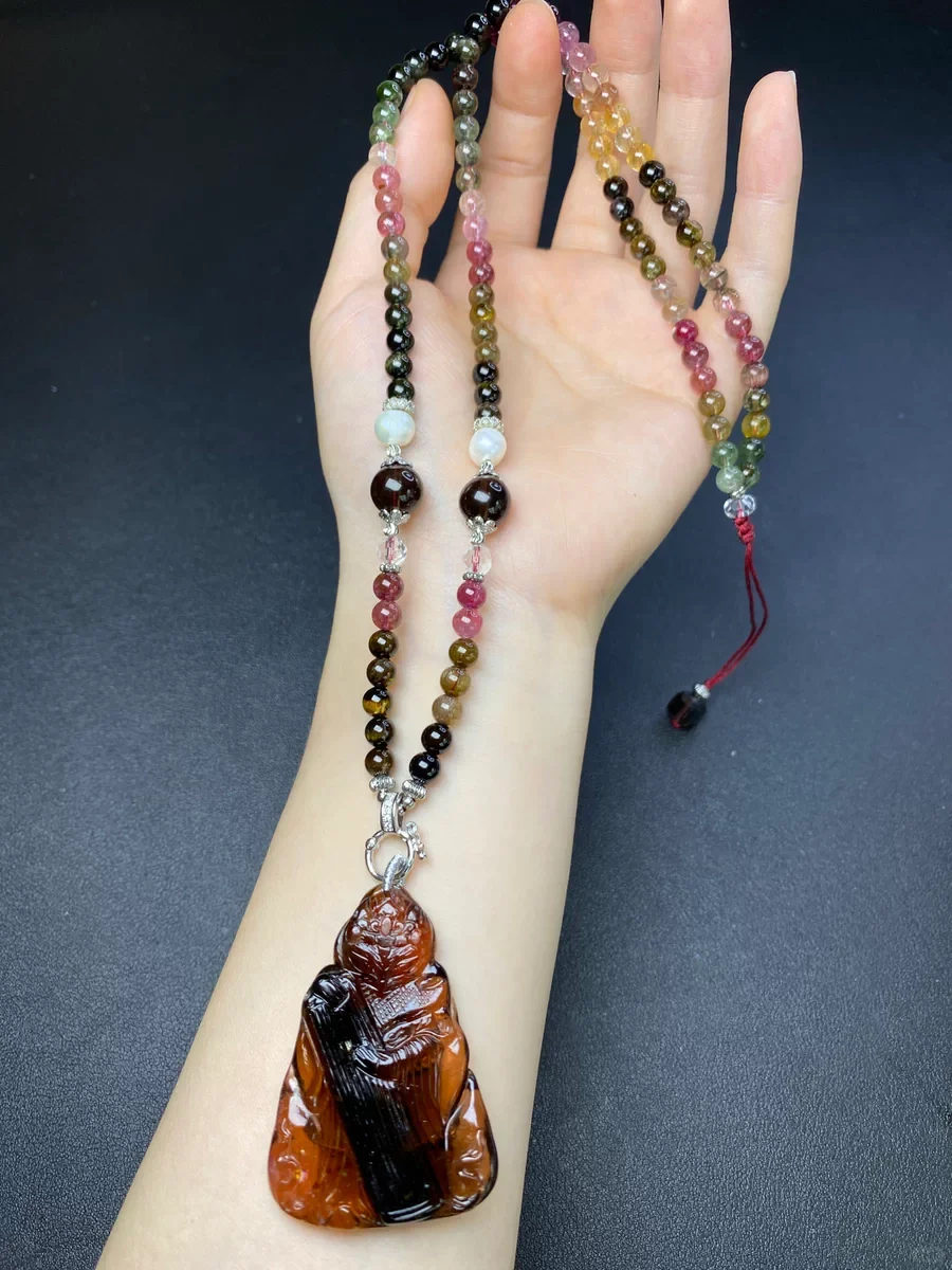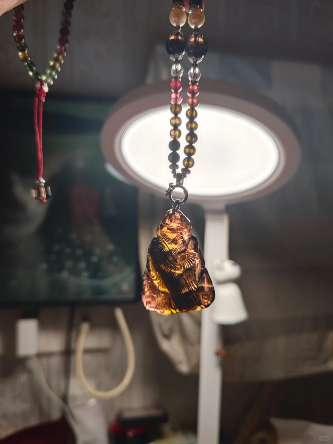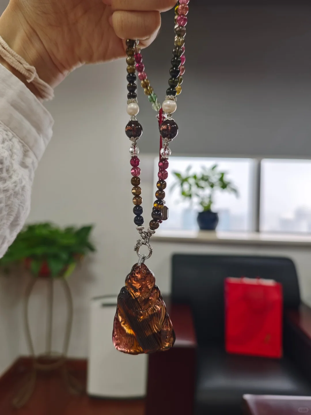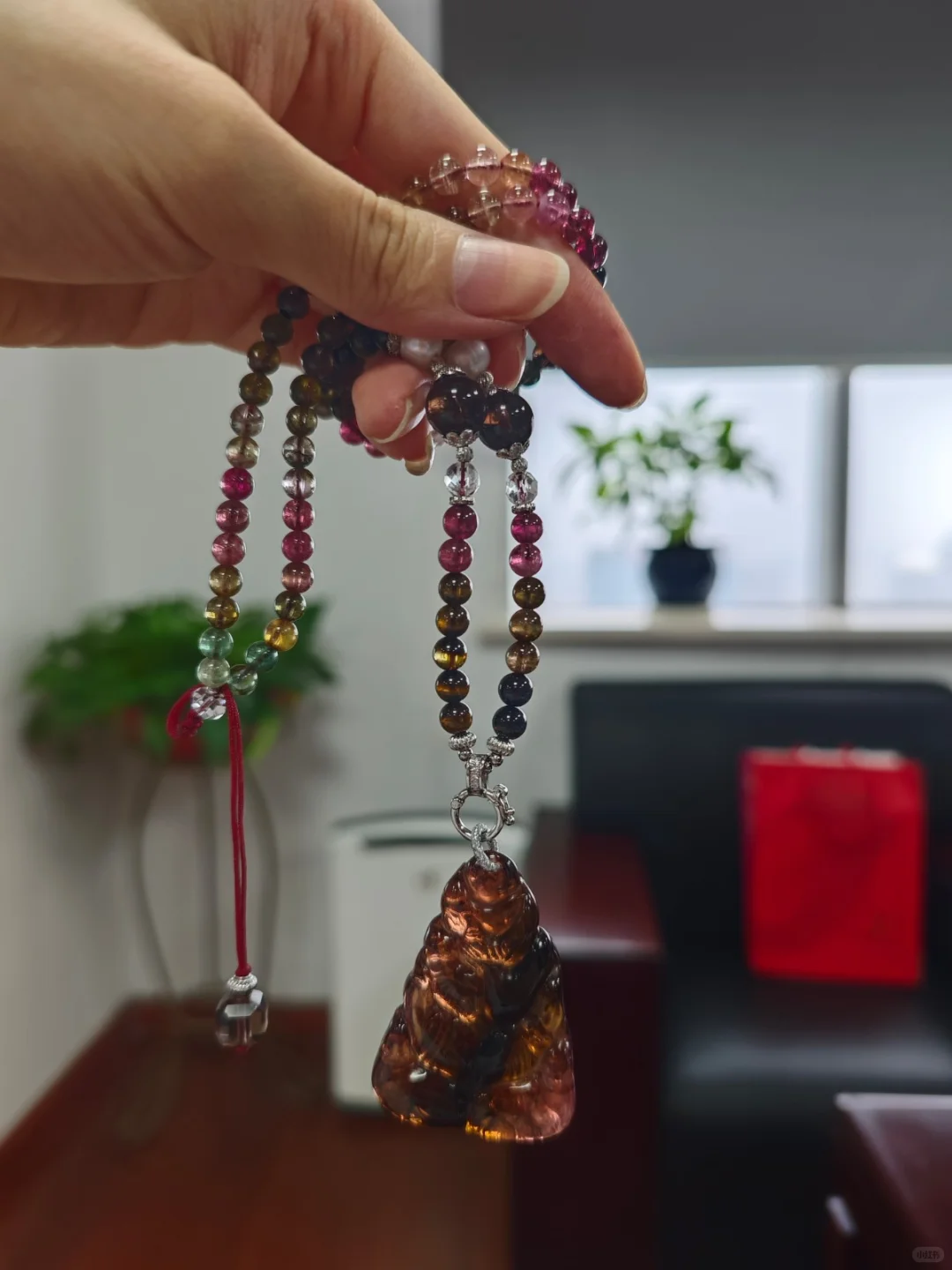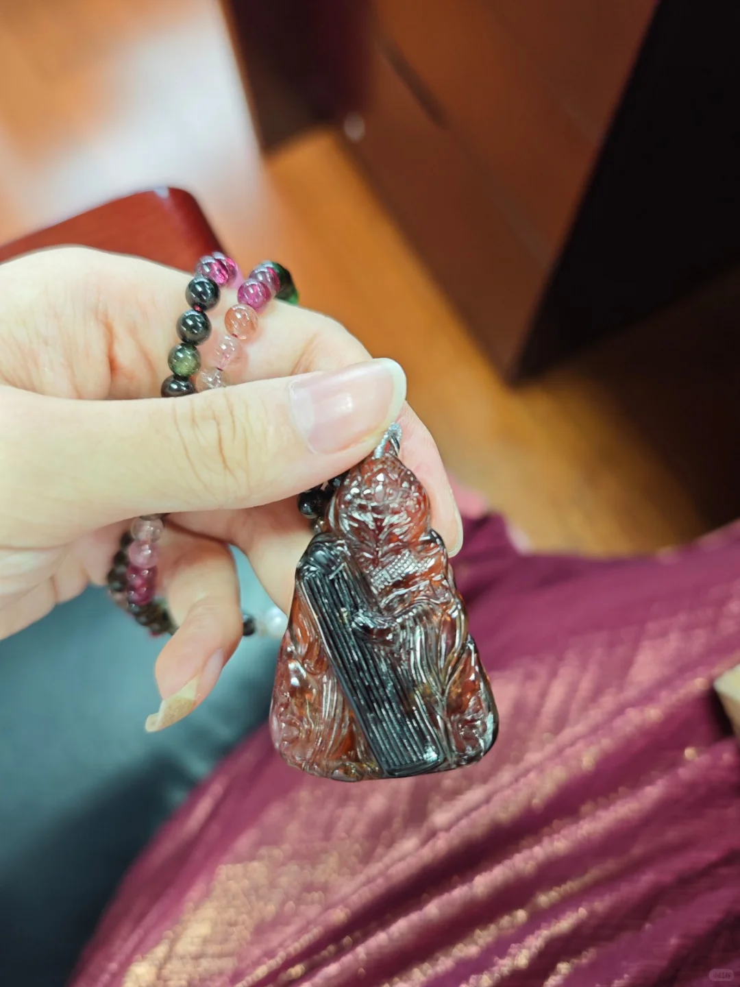 乍一看是棕色的,但是透光看又是墨绿色+玫红色的,算非典型西瓜碧玺?反正一开始当棕色碧玺入的,也算是惊喜了,很喜欢这个抱琴狐娘娘的雕刻,妩媚动人\n