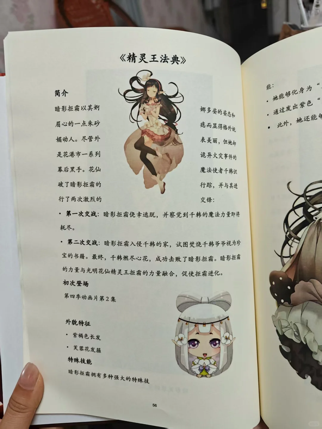 暗影芙蓉精灵王拒霜,以她婀娜多姿的姿态和眉心一点朱砂痣而显得格外妩媚动人。尽管外表美丽,但她却是花港市一系列诡异火灾事件的幕后黑手。花仙魔法使者千韩识破了暗影拒霜的行踪,并与其进行了两次激烈的交锋。第一次暗影拒霜侥幸逃脱,并察觉到千韩的魔法力量即将耗尽。第二次暗影拒霜入侵千韩的家,试图焚烧千韩爷爷视为珍宝的书籍。最终,千韩燃尽心花,成功击败了暗影拒霜。暗影拒霜的力量与光明拒霜的力量融合,拒霜成功进化。