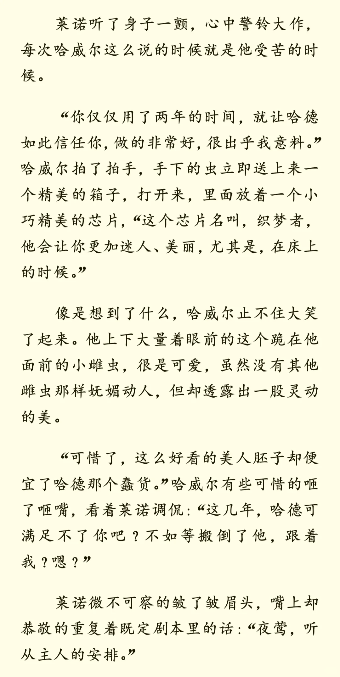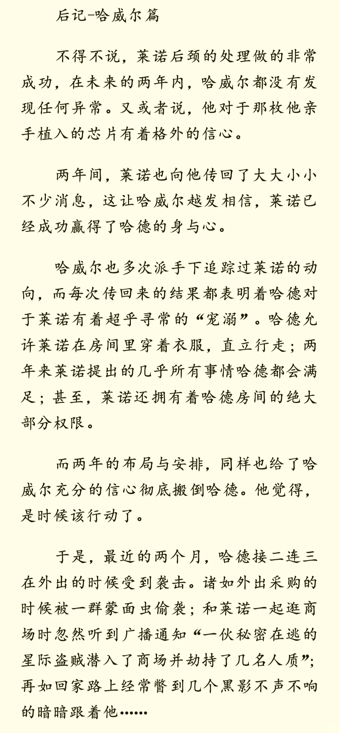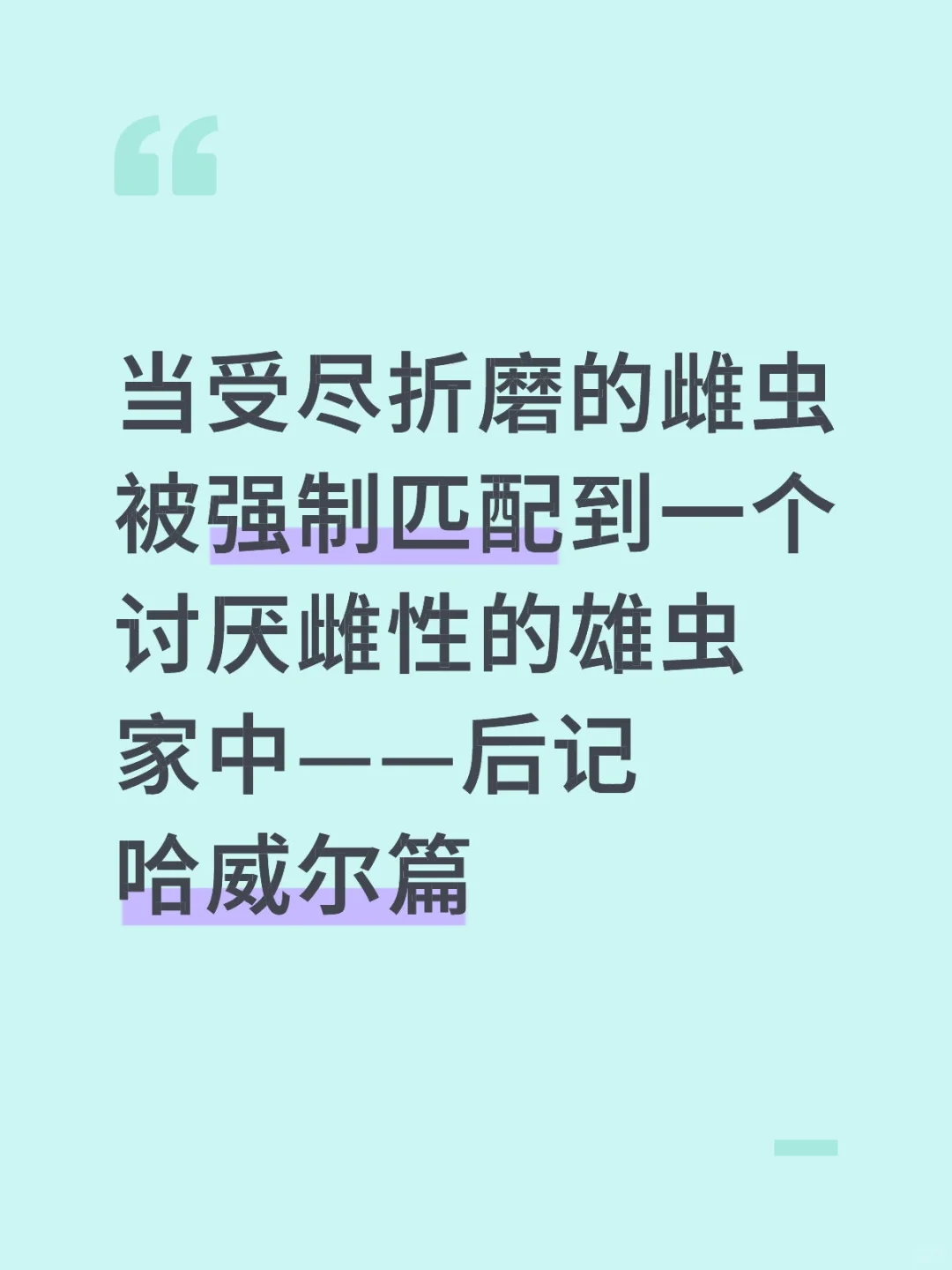 当受尽折磨的雌虫被强制匹配到一个讨厌雌性的雄虫家中——后记 哈威尔篇\n \n许久不见!拖更了几天然后终于爬起来更新了\n这次更新的是有关哈威尔的内容,也算是对于这篇短文的收尾,有机会后面会继续更新一下哈德和莱诺的甜甜小日常?\n \n这篇其实也相当于一个小小的补充?所以没打算写的很详细,许多有关哈德与哈威尔的斗智斗勇都略过了(目移)所以可能又被我写成流水账了嚯哈哈哈(仰天狂笑(不是)\n \nps:其实一开始还有蛮多想写的,比如哈威尔的老巢其实就是他休闲玩弄雌虫的场所,再比如哈威尔的新芯片“织梦者”,其实可以在日常散发有些迷幻的香气,尤其是在某些剧烈运动的时候()这样他就能彻底控制住哈德。但是没找着机会写出来,就放在这吧(*´I`*) 以及,小情侣什么时候才能深入交流一下啊(……碎碎念)\n \n以上,仍旧希望您看得开心~\n \n————\n二编:补药和谐我啊QAQ\n \n#虫族 #bl #脑洞 #虫族文