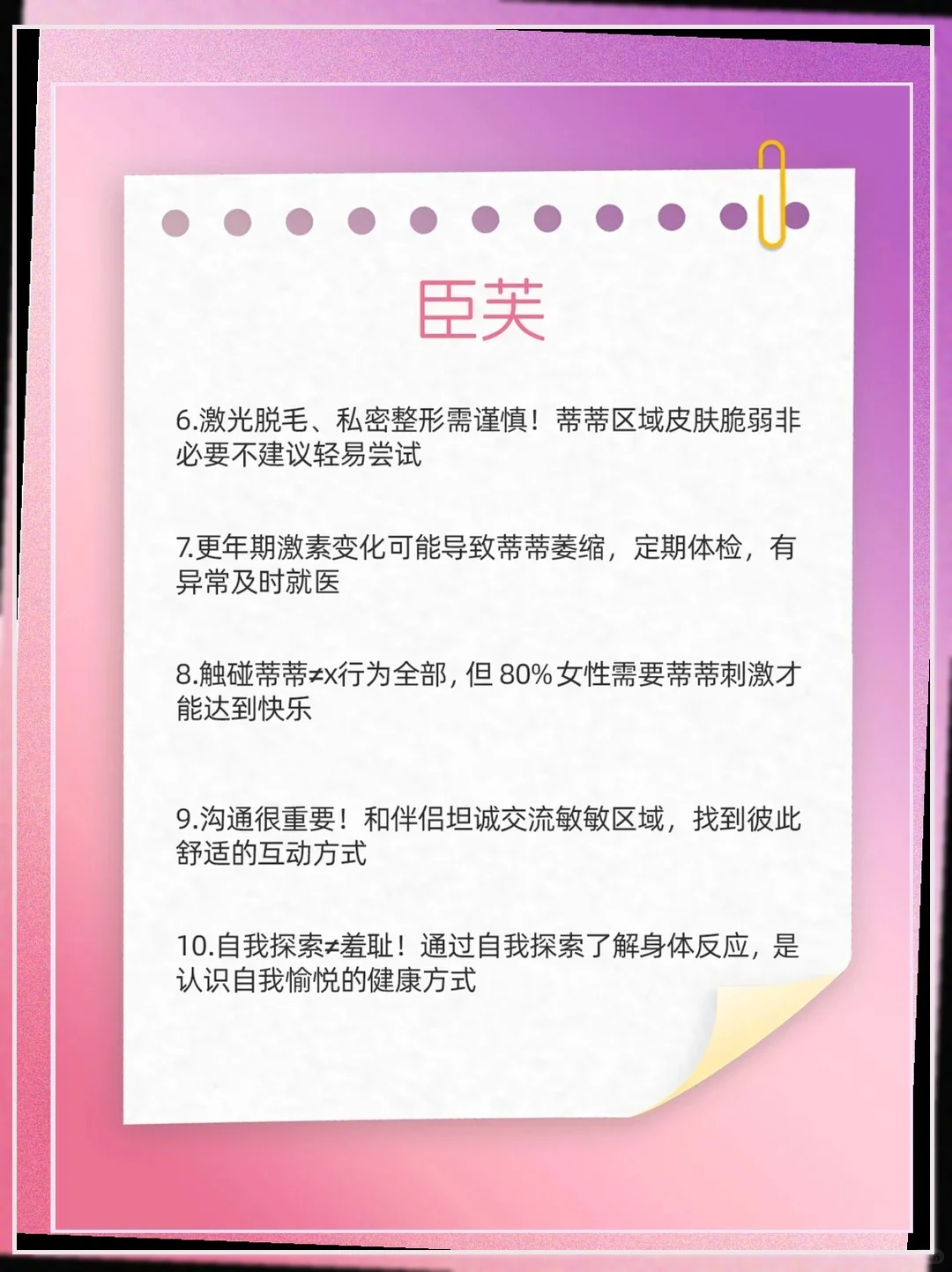 亲爱的宝子们~【爱心】\n \n最近发现,许多小可爱们私下找我们聊聊天,很多人都说对自己的身体了解得不够,还显得有些害羞呢!【偷笑】这让我忍不住想说,亲爱的们,别再害羞了!了解自己的身体,了解自己的需求,这可是再正常不过的事情哦!\n \n所以,为了让大家更好地认识自己,咱们特别准备了一些有趣又实用的科普小知识,帮助各位小仙女们更好地理解自己的身体,正视自己的需求,做个自信又优雅的女人!✨\n \n首先,让我们聊聊身体的神奇之处!你们知道吗?女性的身体就像是一部复杂而精妙的机器,每一个部位都在默默为我们的生活服务。了解这些,可以让你更好地与自己的身体对话,知道它在说什么,真正做到“身体是自己的好朋友”!\n \n接下来,我们还要谈谈生理周期。生理期不是一个让人避之不及的话题,而是一个值得深入了解的生理现象!它不仅是身体健康的标志,更是女性力量的体现。通过记录和理解自己的生理周期,宝贝们可以更好地管理情绪、调整生活方式,甚至提升工作效率,简直是女性的小秘密武器啊!💪\n \n当然,除了生理期,咱们还可以聊聊那些让人觉得“羞羞”的话题,比如性健康和快乐。亲爱的们,性健康绝对不是一个禁忌话题,而是每个女性都应该了解的基本知识。让我们一起打破那些陈旧的观念,勇敢探讨自己的需求和喜好,拥抱身体的每一种感受吧!🌈\n \n如果你们还有其他疑惑,随时来找我们哦!我们可是乐于助人的小天使,随时准备为你解答各种问题!无论是关于生理、心理还是生活方式,我们都希望成为你们的支持者,帮助你们更好地爱护自己、呵护身体!💖\n \n亲爱的们,别忘了,在这个快节奏的时代,照顾好自己才是最重要的。让我们一起发掘女性的力量,享受自由的生活方式,做一个既有内涵又有魅力的现代女性吧!#臣芙#拥抱身体信号#女性健康#关爱女性#爱护自己的身体#女性身体解放#女性身体自由#女性生活方式#发现女性力量\n期待你们的分享与互动哦!让我们一起在这个小天地里,探索身体的秘密,发现更加精彩的自己!😘