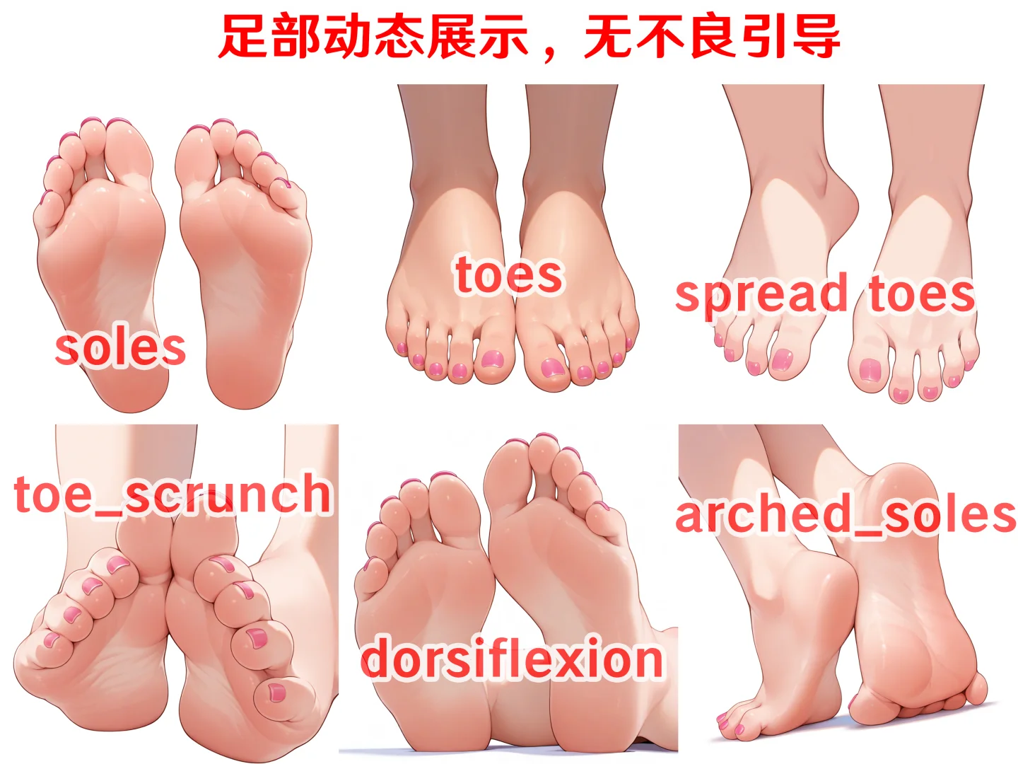 #ai绘画 #二次元ai绘画 #AI绘画提示词 #stable_diffusion提示词\n给太长不想看的朋友:\n指定足的角度:soles是足底,toes是脚面\n足部动作:arched soles是绷直的脚,dorsiflexion是弯脚,toe_scrunch是扣脚指头,spread toes是伸开脚趾,\nbarefoot,foot focus,foreshortening, 就能很简单的出不错的图\npresenting foot是特意展示足部的身体动作\n------------------\n感谢大家的支持!希望我的教程能够帮到更多的小伙伴!\n那么8000粉就特别出一期如何生成足部的教程!\n----------------\n首先是一个比较好用的妙妙道具:adetailerFootYolov8x,这个After Detailer模型可以在C站或者hugging face里面找到,将下载回来的模型放到models\\adetailer目录下面,然后重启WebUI服务端就能在adetailer找到对足部的检测模型了。\n至于adetailer的提示词,人类脚建议为\n1girl,loli,foot focus,nail polish,toe nails,masterpiece,best quality,\n兽脚的提示词建议为\nloli,furry,foot focus,claws,pawpads,masterpiece,best quality,\n这里加上loli是因为不加的话,AI有时候会给足部加奇怪的皱纹XD\n---------------\n如果只是生成人类脚的话,foot focus就可以,\npaw gloves和paw shoes能生成可爱的爪爪靴和爪爪手套,配合睡衣很不错\nmonster girl ,animal hands可以生成兽娘类的兽脚和人的身体,如果用animal foot那有可能腿部也全变成毛绒绒。\n而对于纯血福瑞来说,直接furry就可以XD,搭配claws和pawpads能够生成好看的肉垫和爪子。\n------------------------\n构图方面,from below, 是比较常用的足部视角,如果不喜欢下视图的话,reclining,(躺卧)或者 wariza,(鸭子坐)也能有不错的角度。