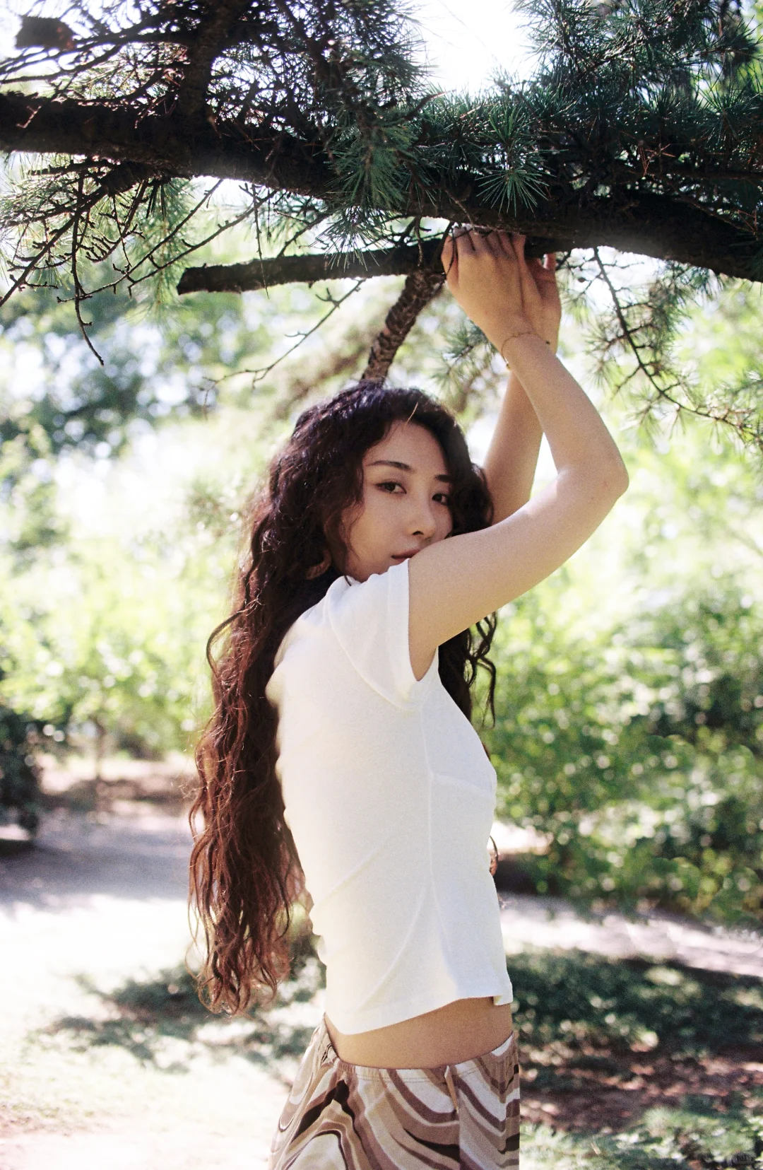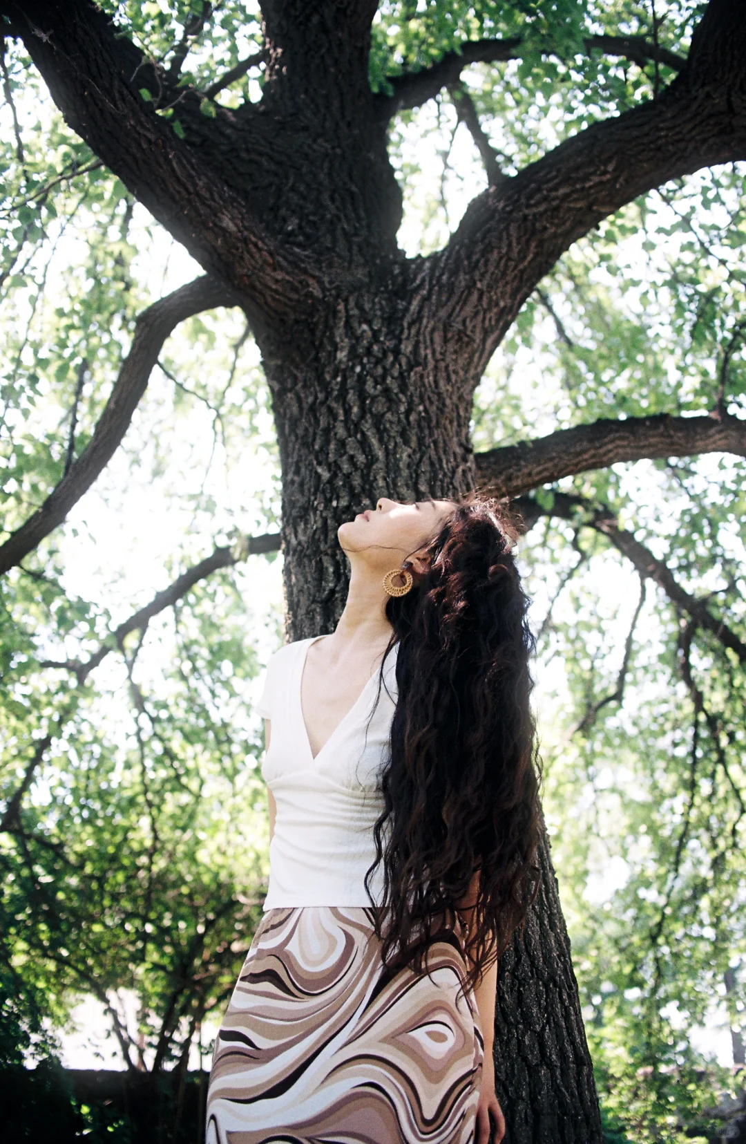 总觉得她身上有一种坚韧的气质\n她的卷发缠绕大树 她是大地的女儿\n#胶片 #像树一样生长 #复古 #树会拥抱每个抬头的人 #像植物一样自在生长 #地母系 #卷发 #生命力